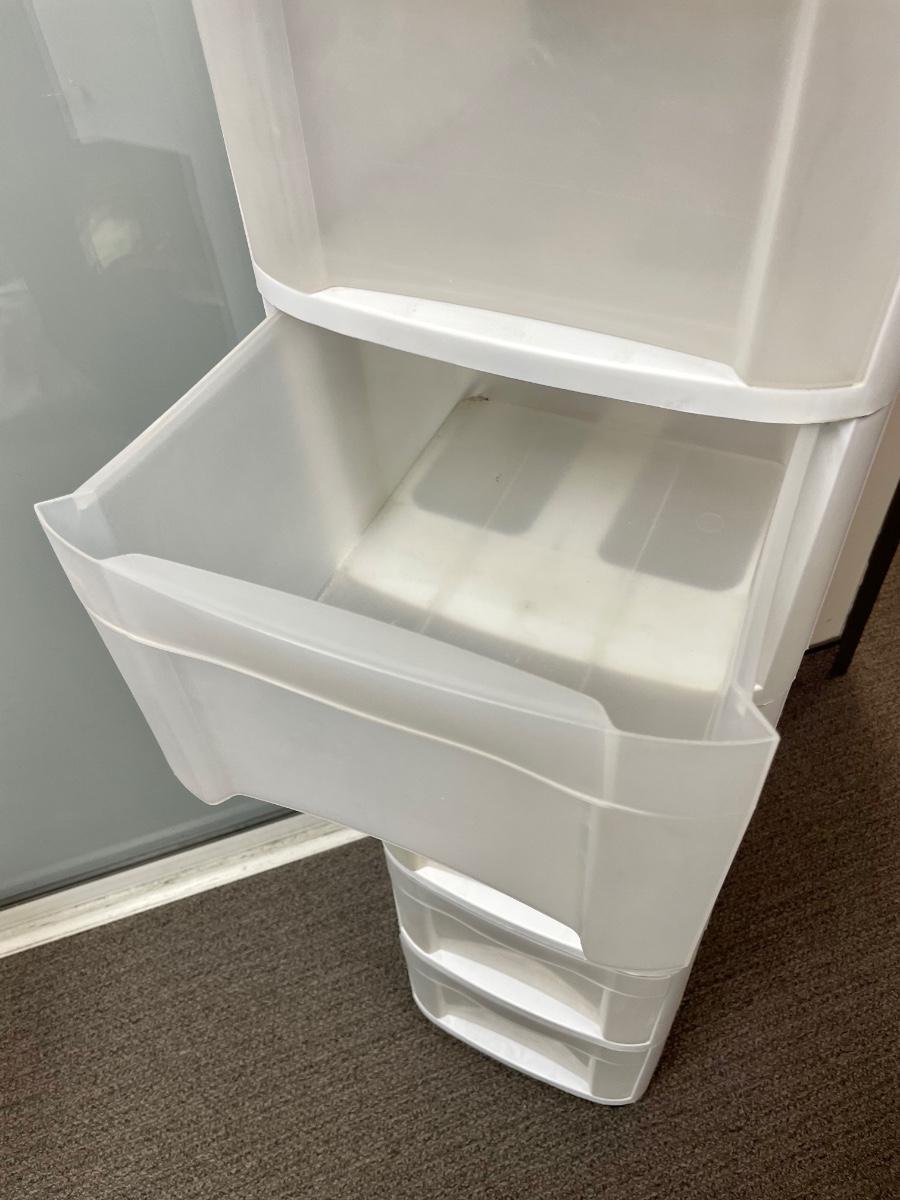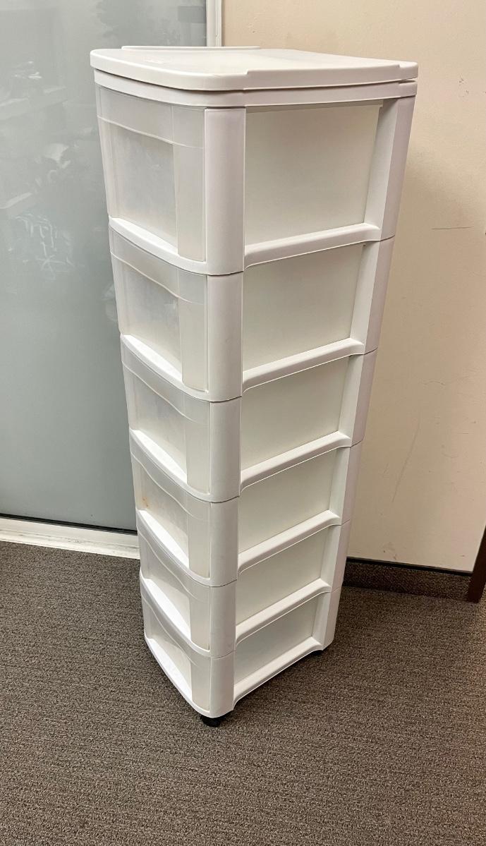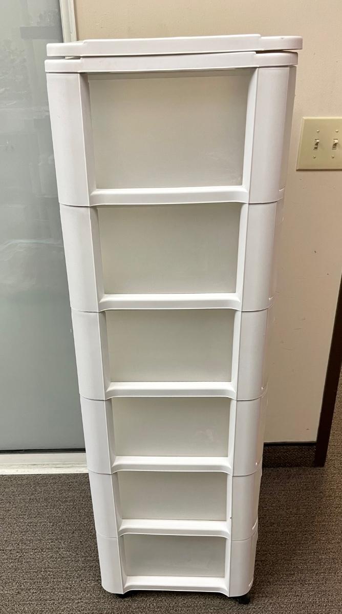 Sterilite 6-Drawer Storage Unit on Wheels. White plastic with translucent drawers. Caster wheels on the bottom, which can be easily removed if desired. Stack can be split into 2 drawer units, as there is an extra top cover. Great for storing craft supplies or other lightweight items.