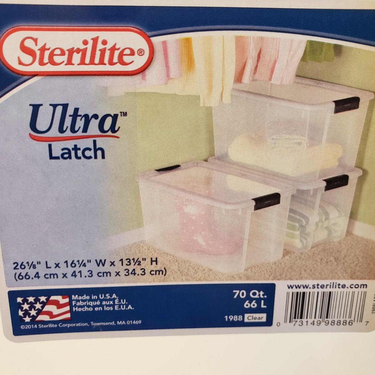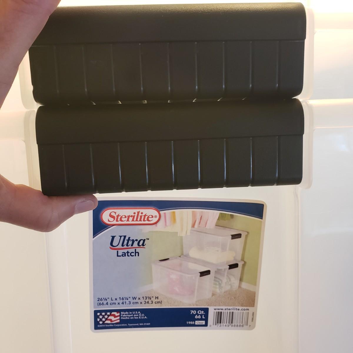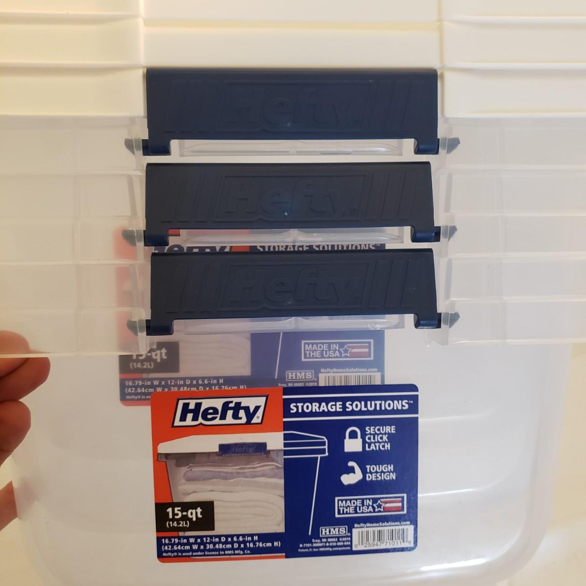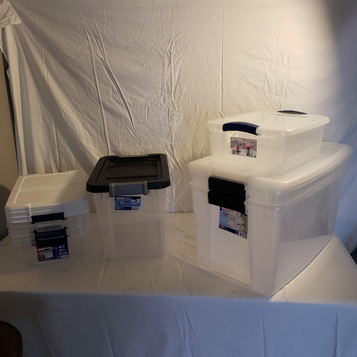 There are seven containers in this lot. Two large Sterilite 70 quart, one 7.5 gallon, one 15 quart and three Hefty 15 quart containers. They all have snap handled lids.