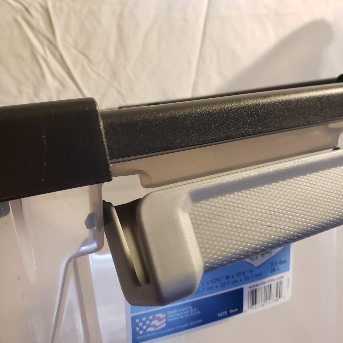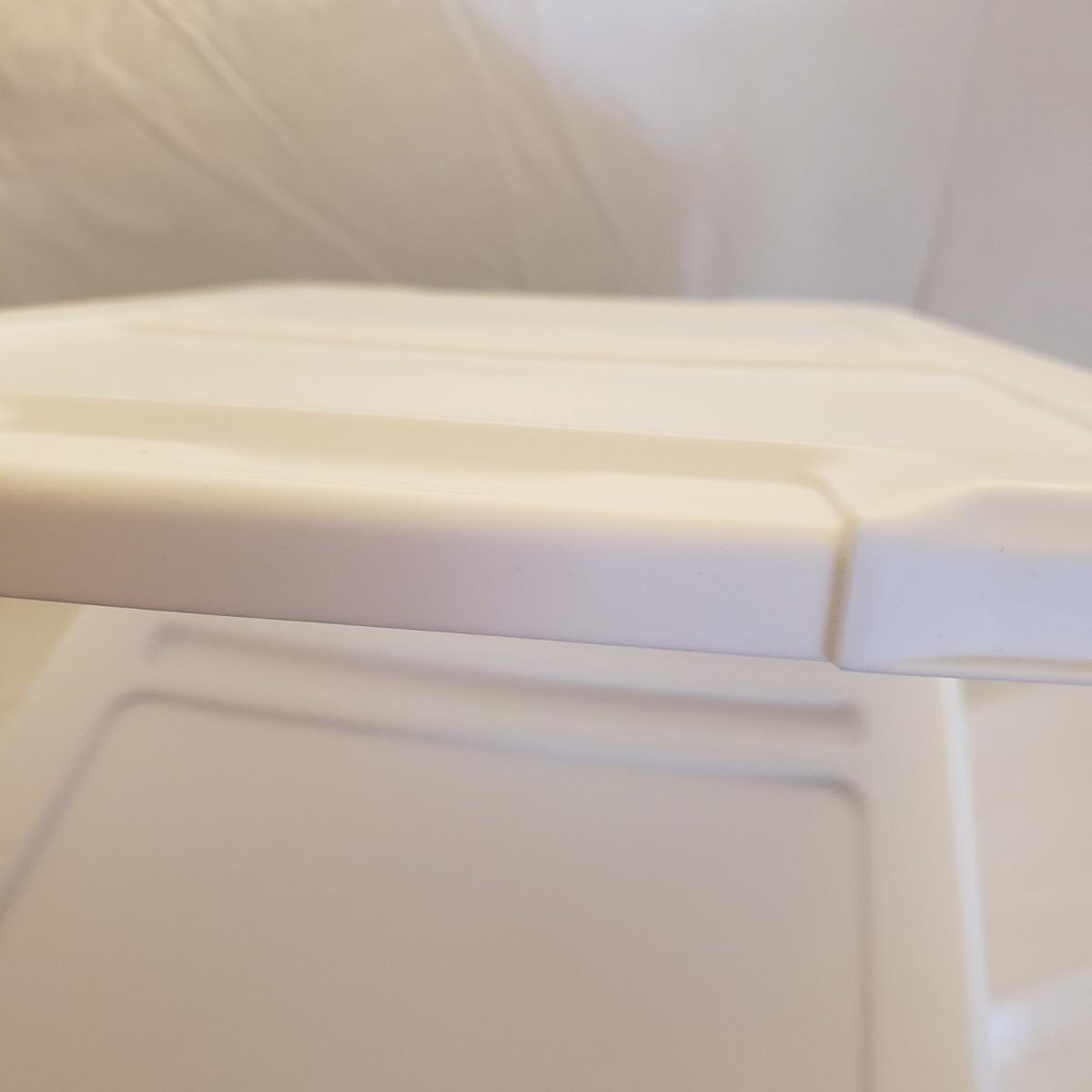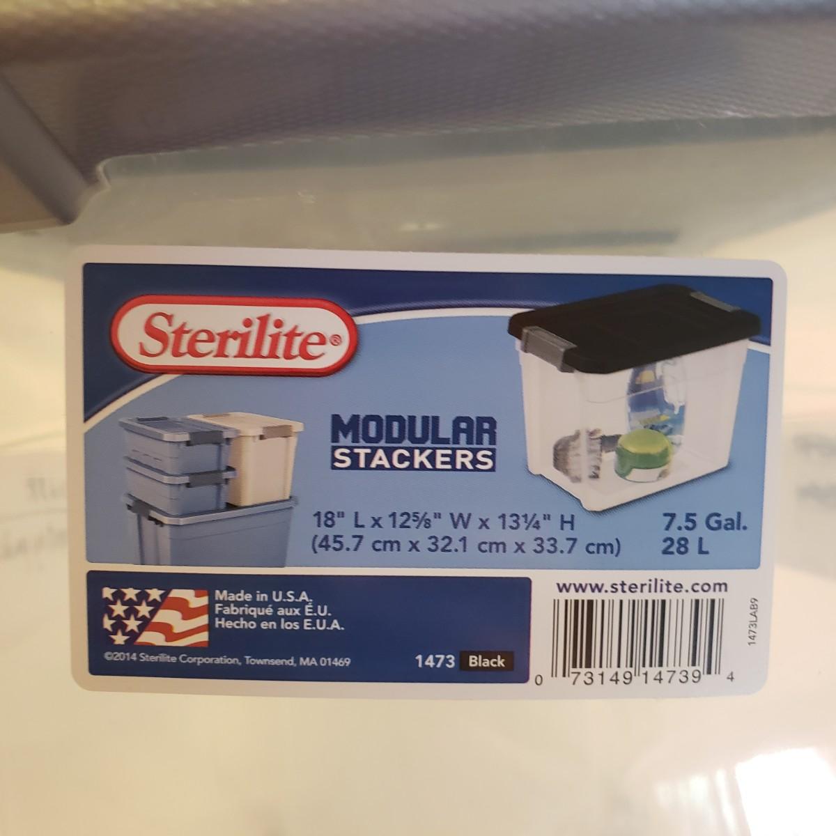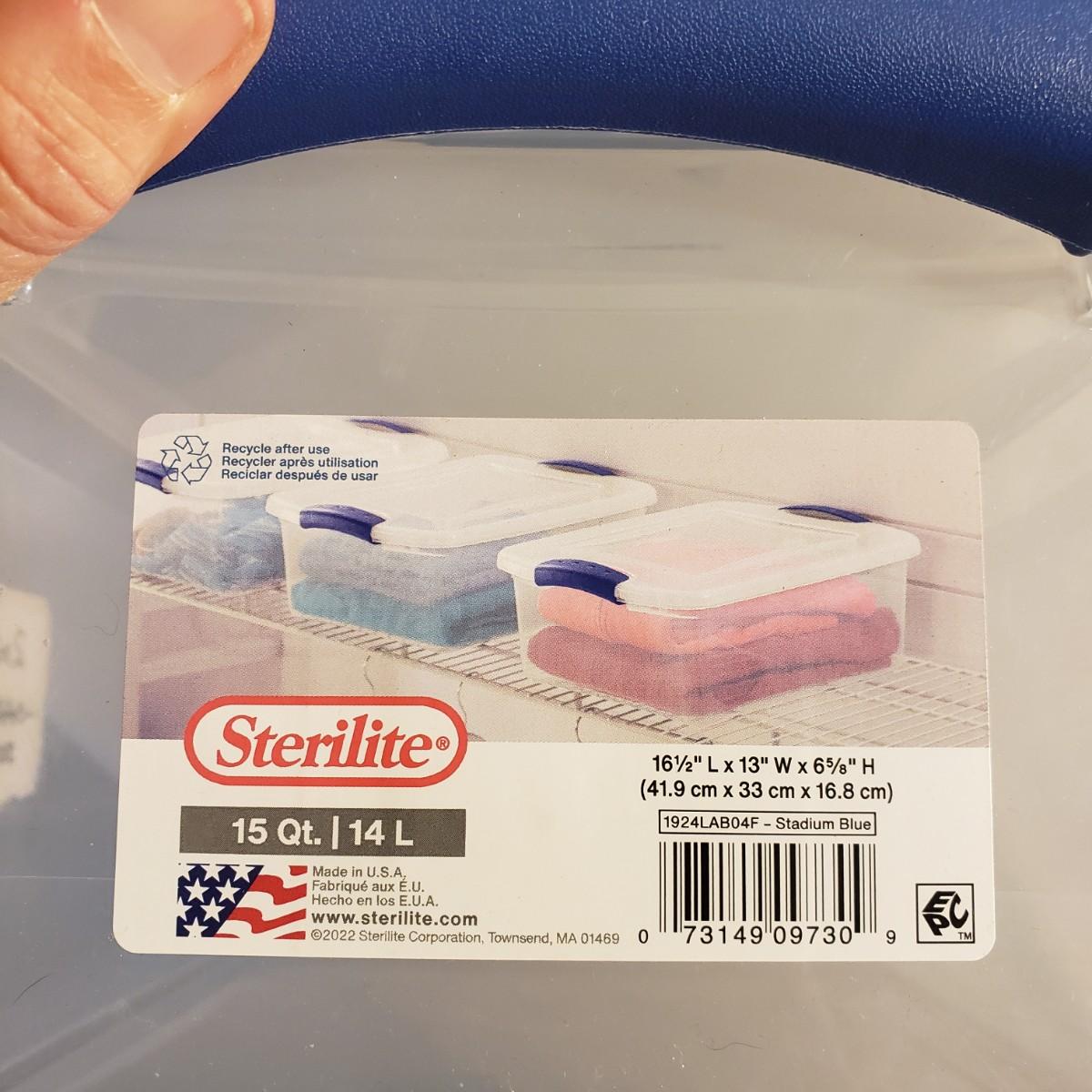 There are seven containers in this lot. Two large Sterilite 70 quart, one 7.5 gallon, one 15 quart and three Hefty 15 quart containers. They all have snap handled lids.