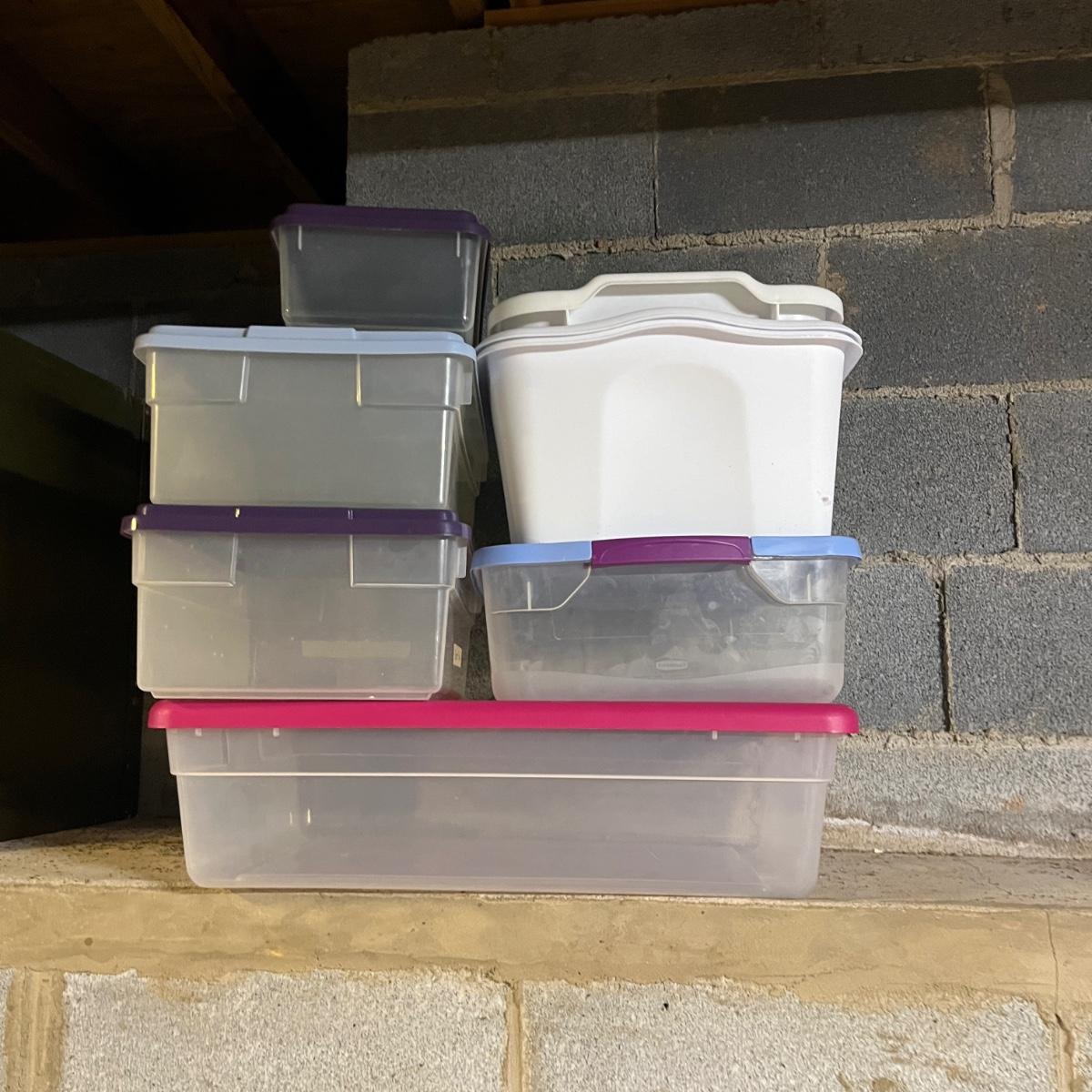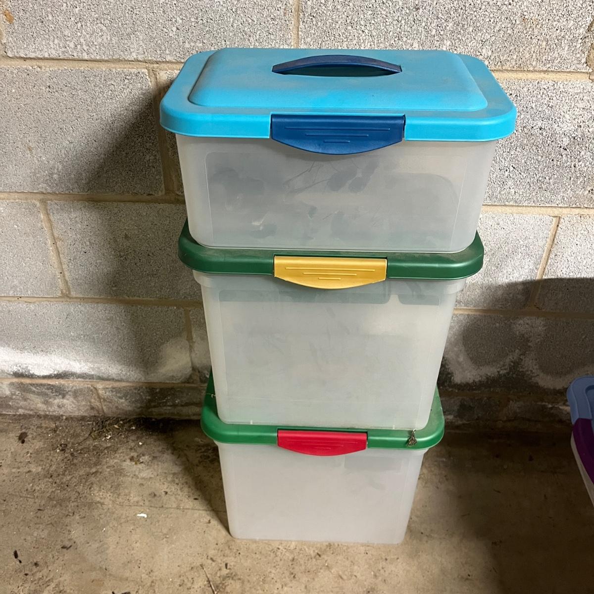 Lot includes over twenty five plastic storage containers with lids. Largest container measures 16” x 23” x 15”H.