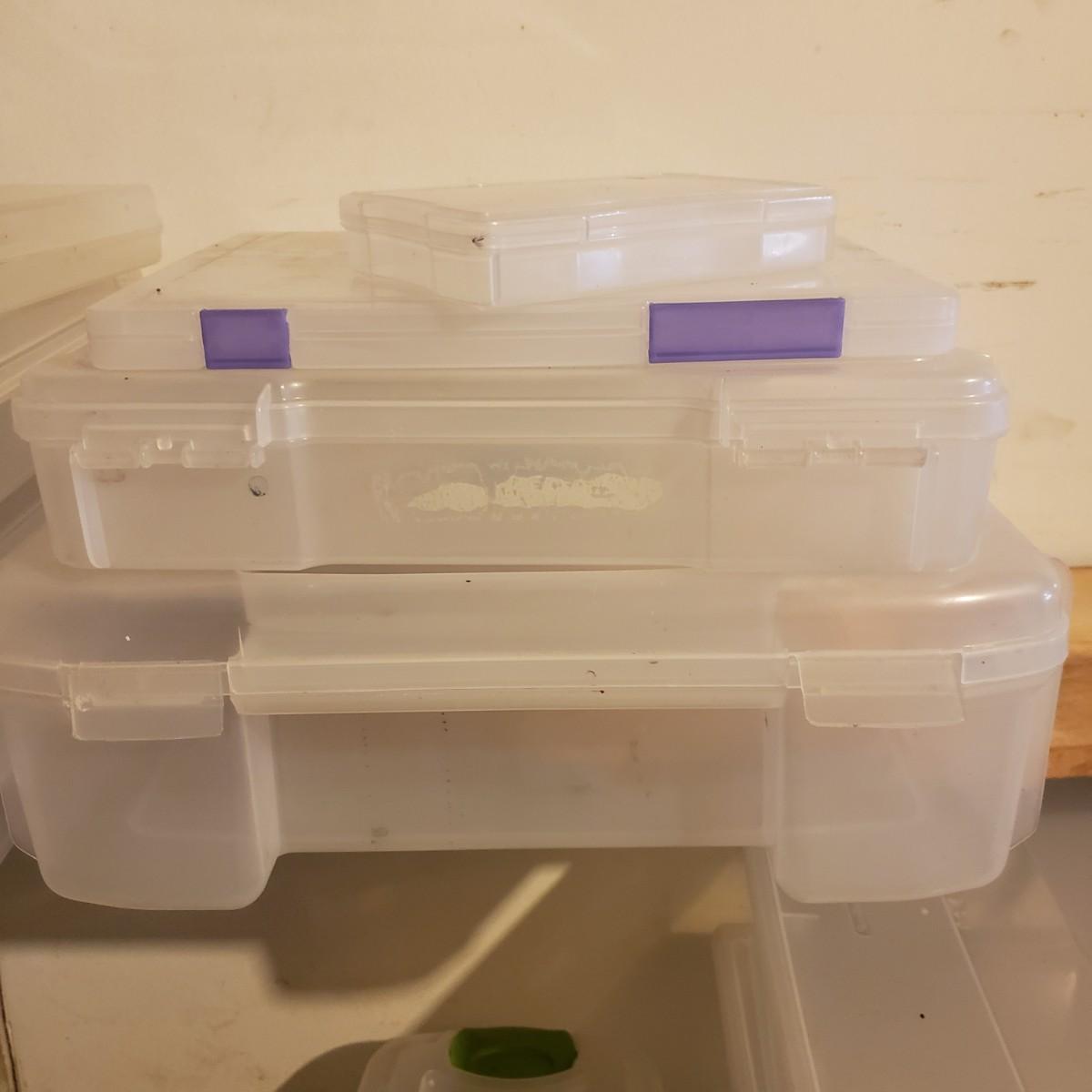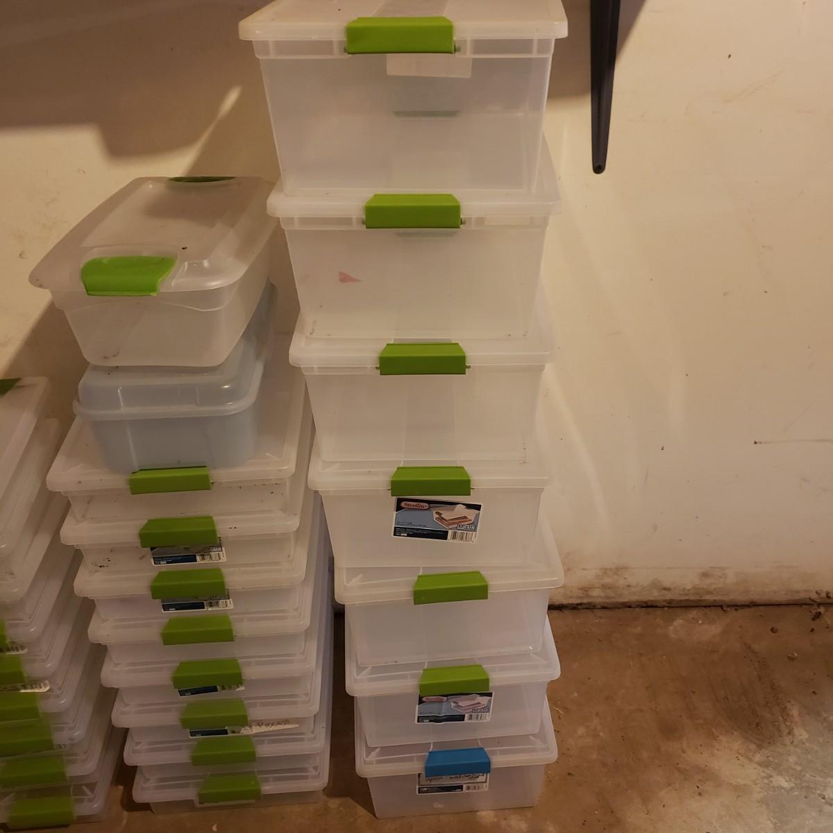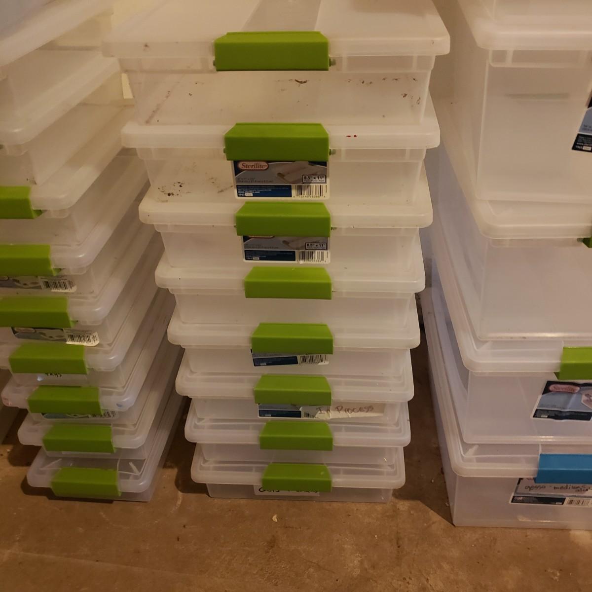 This 45 piece lot contains small mostly Sterilite clear storage containers. See pictures for quantities and sizes of each stack.