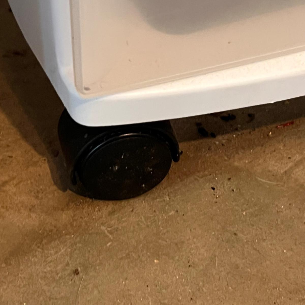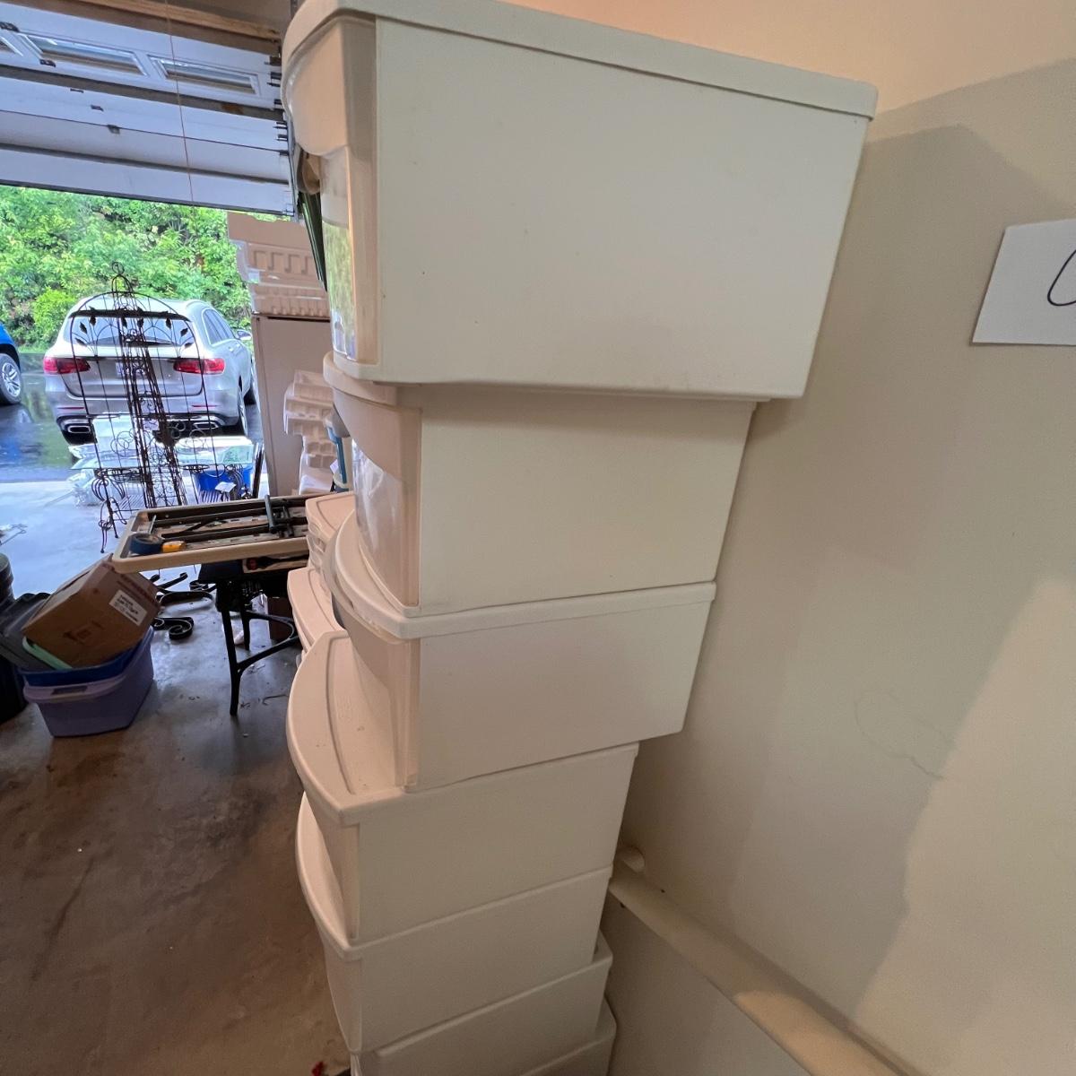 Sterilite storage solutions includes approximately eight units with three drawers per each unit. The units with gray handles are single drawers and are stackable. Just one unit is on wheels.