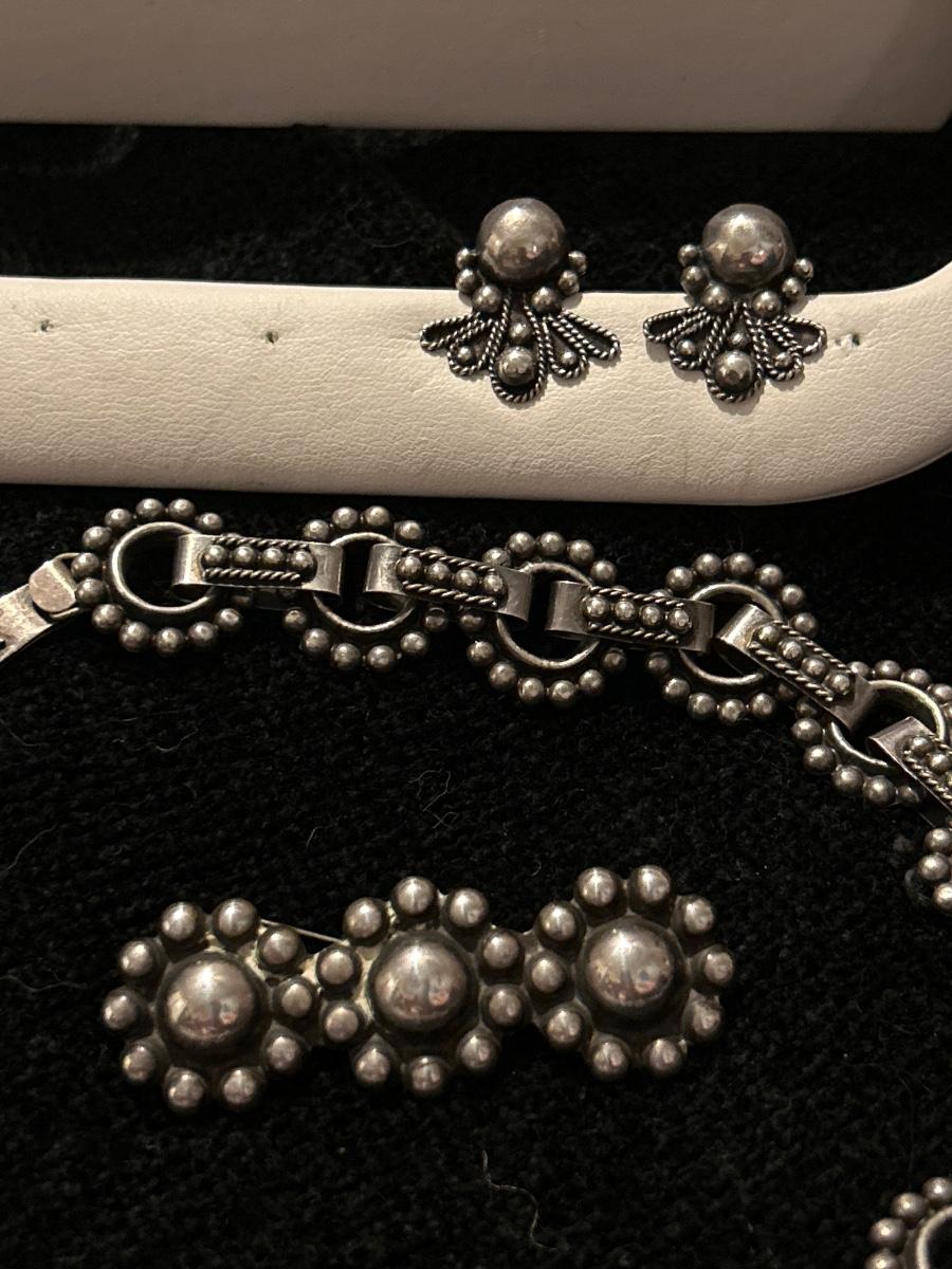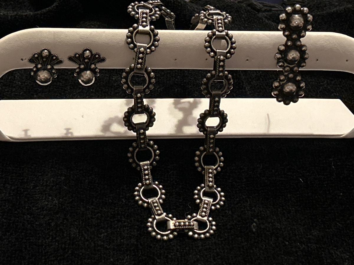 The earrings are clip ons, the third item is a pin and they are all stamped
