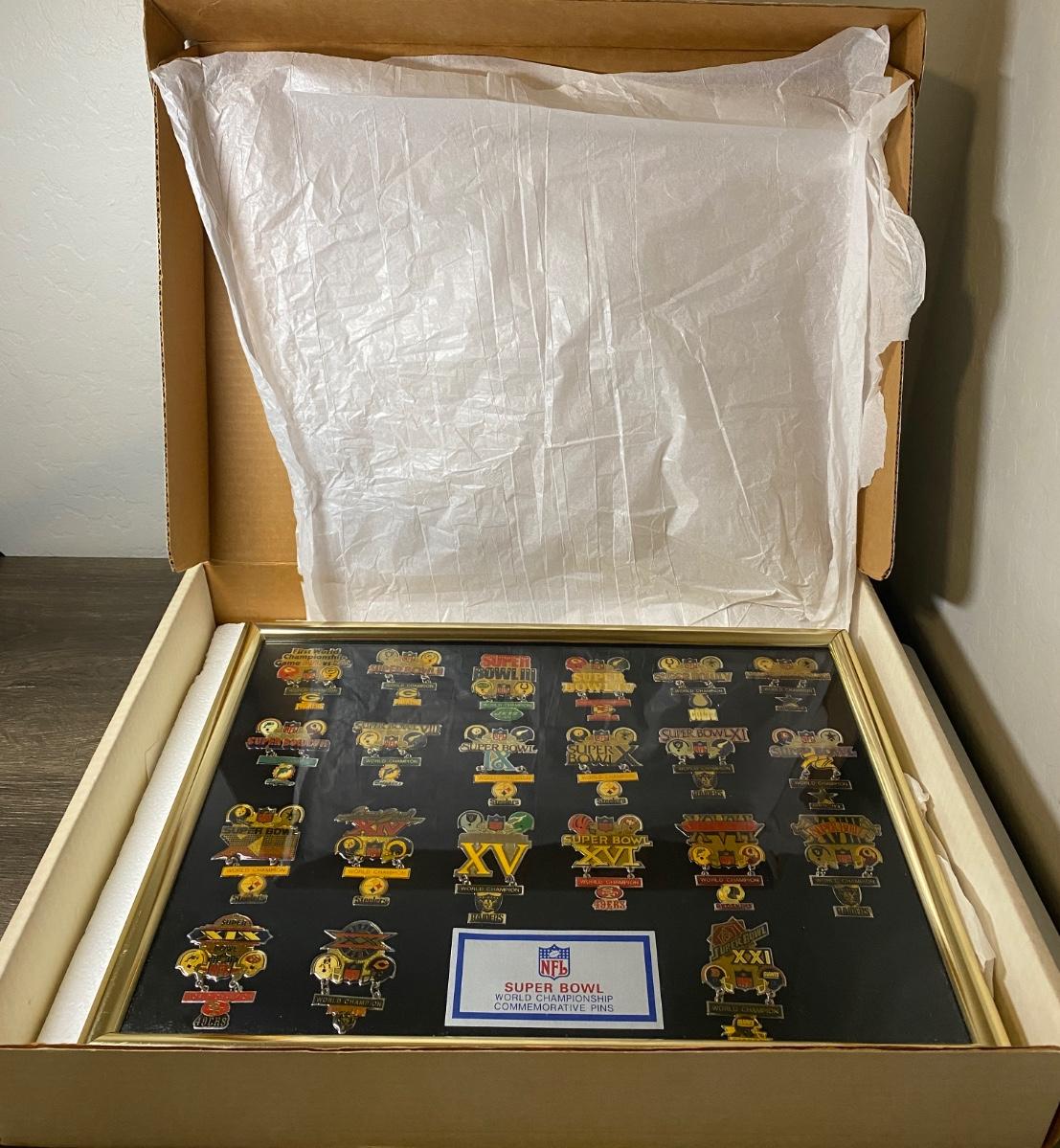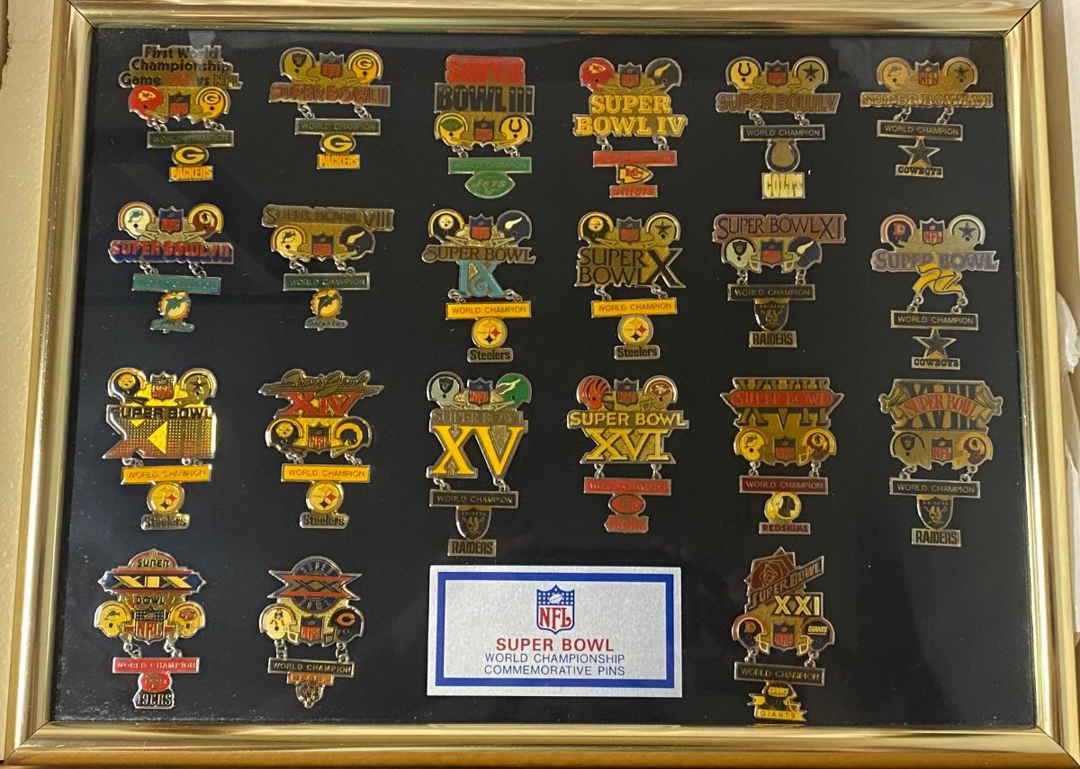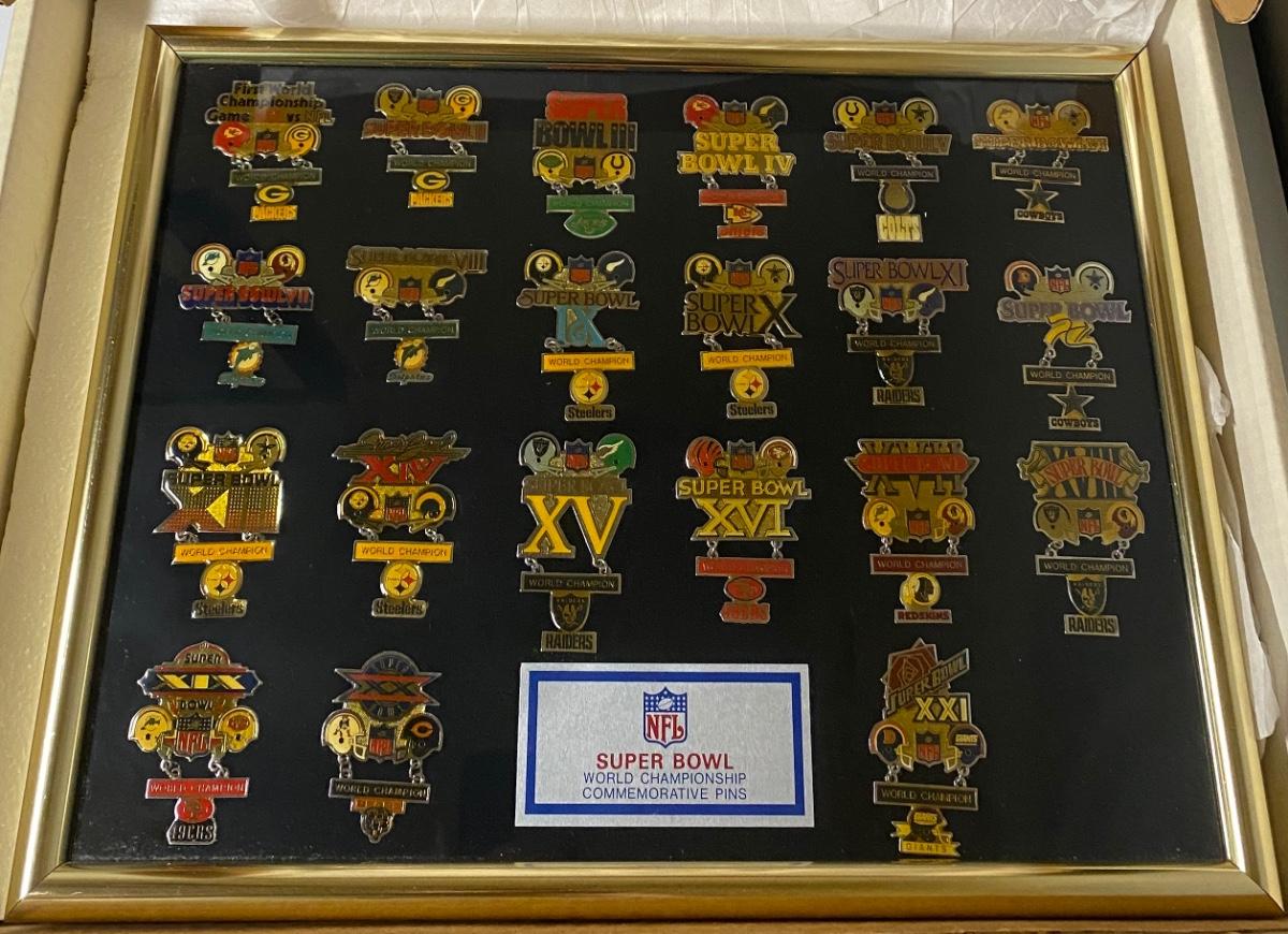 Official NFL Super Bowl Pin Collection. History of the item is unknown; however, there appears to be one missing pin.