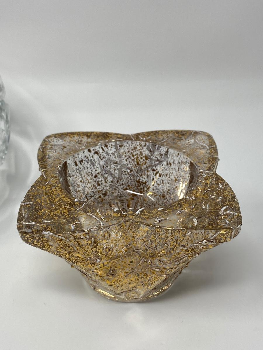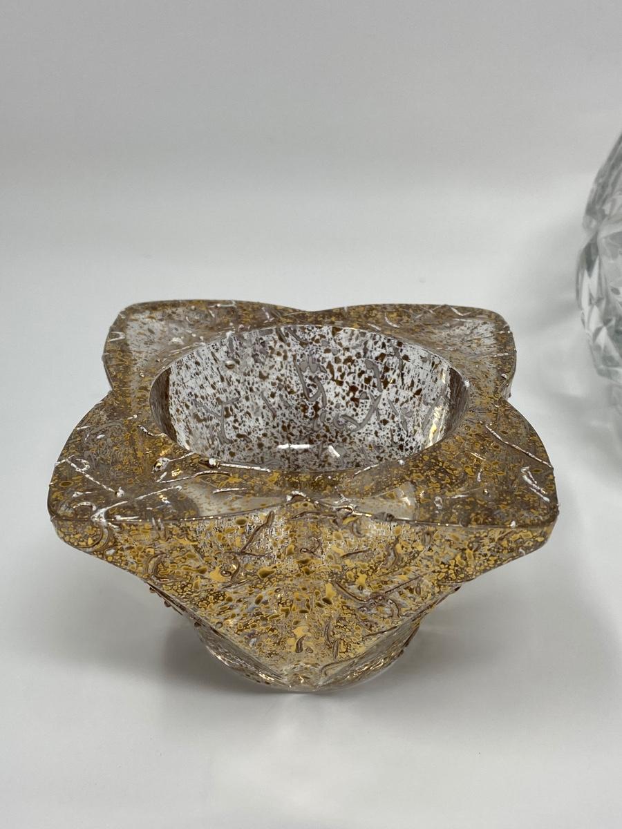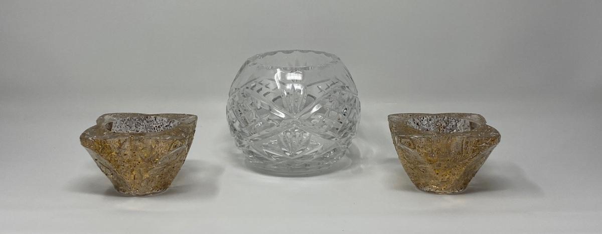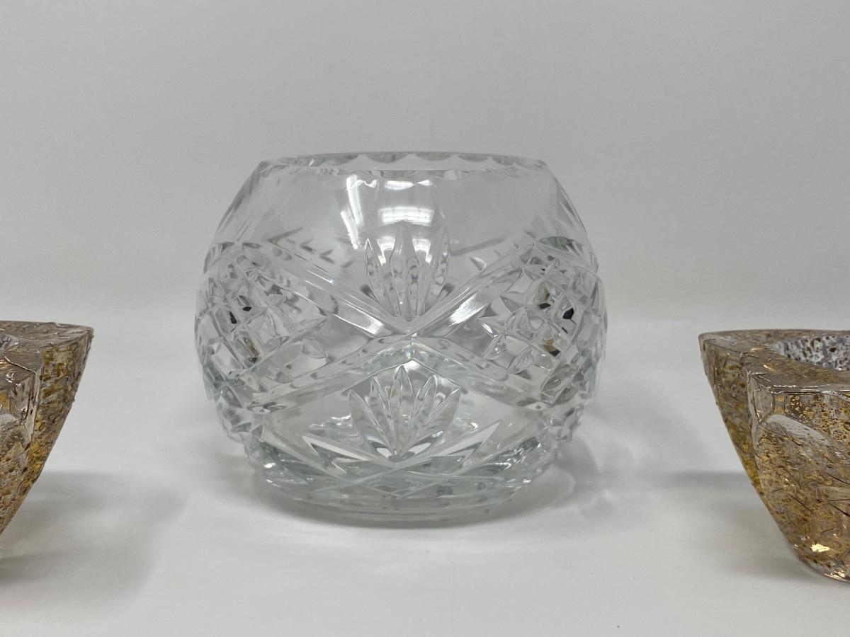 Cut Crystal Bowl with Pair of Glass and Gold Speck Candleholders