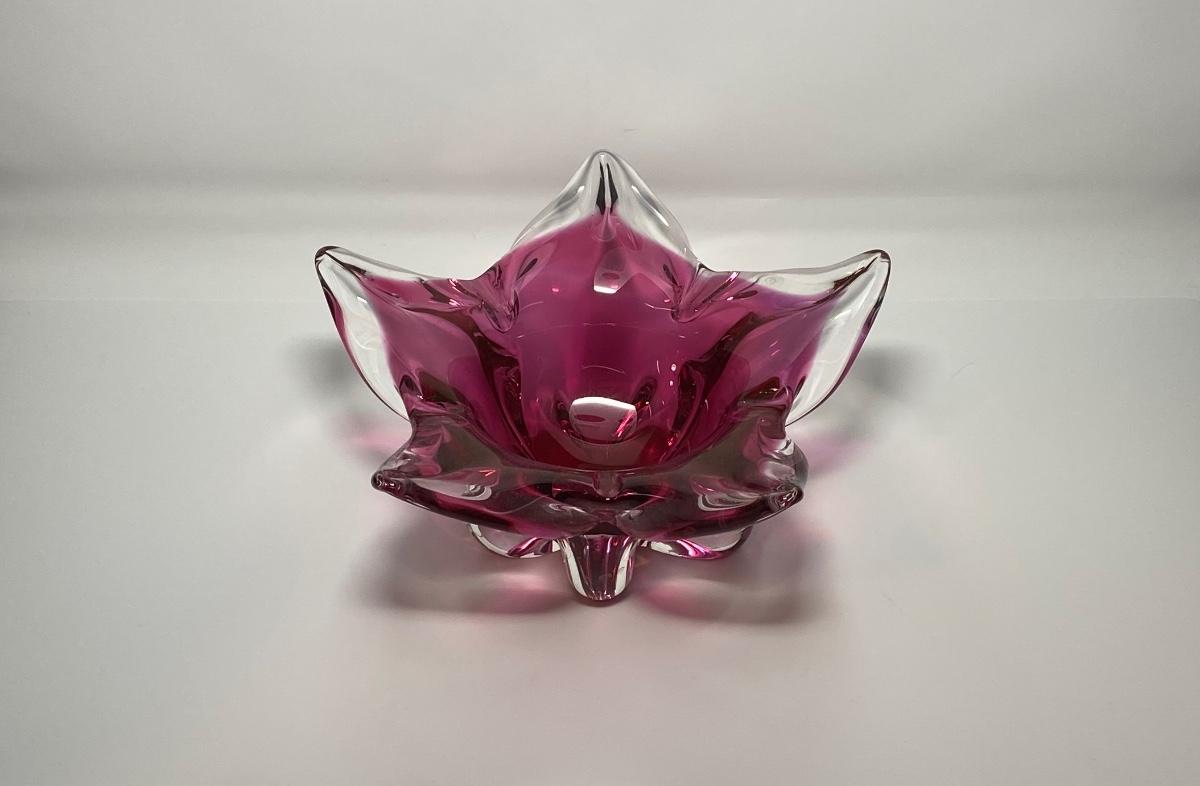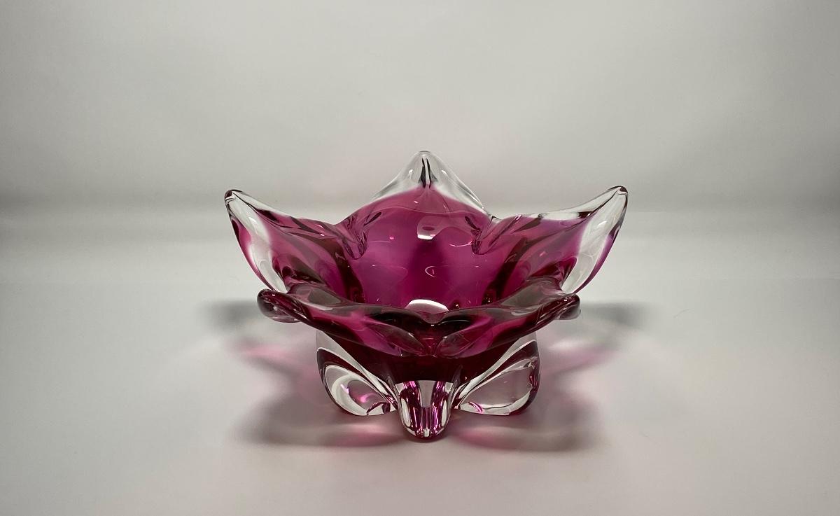 Vintage Pink and Clear Murano Blown-Glass Art Floral Footed Bowl