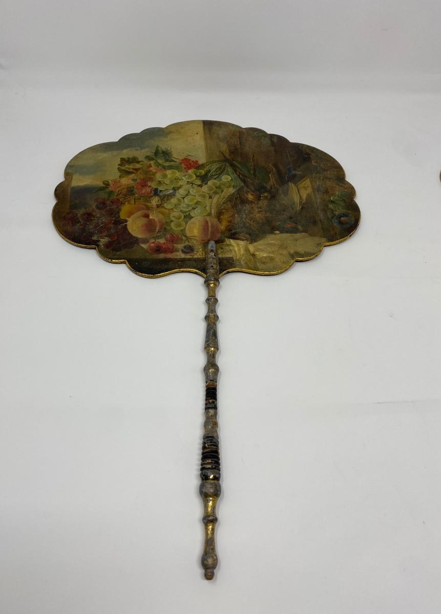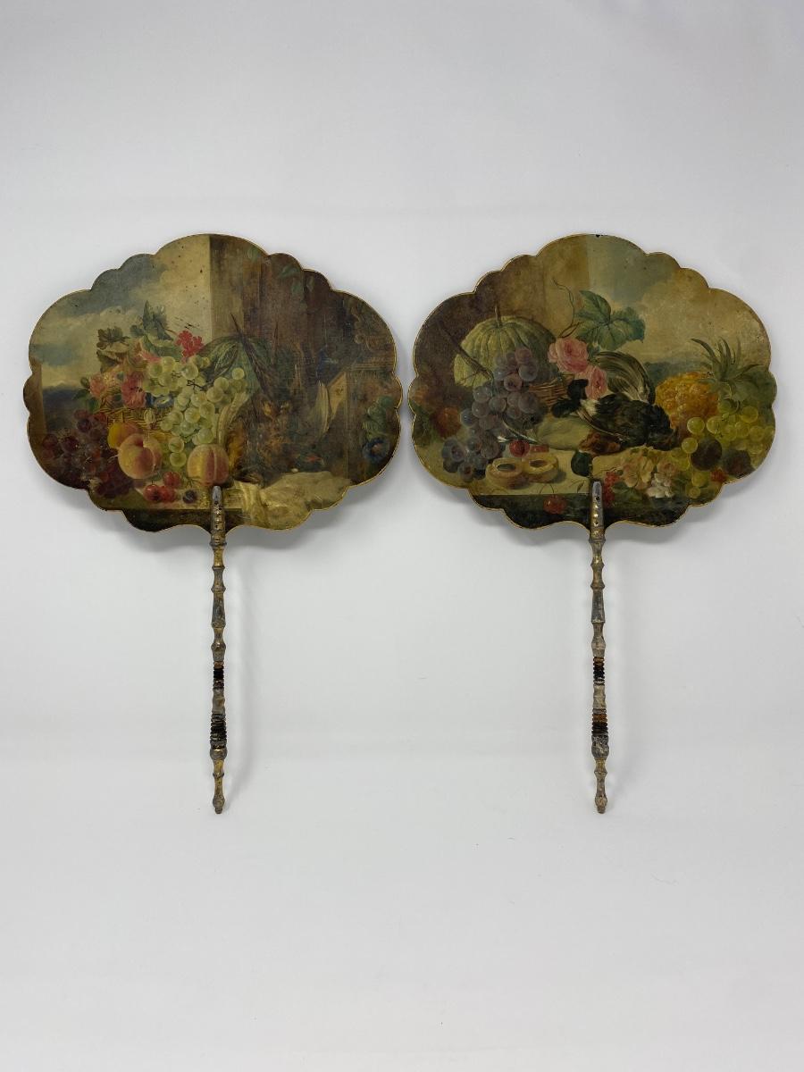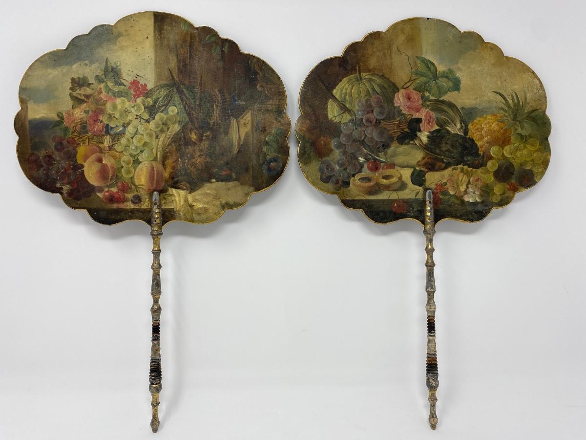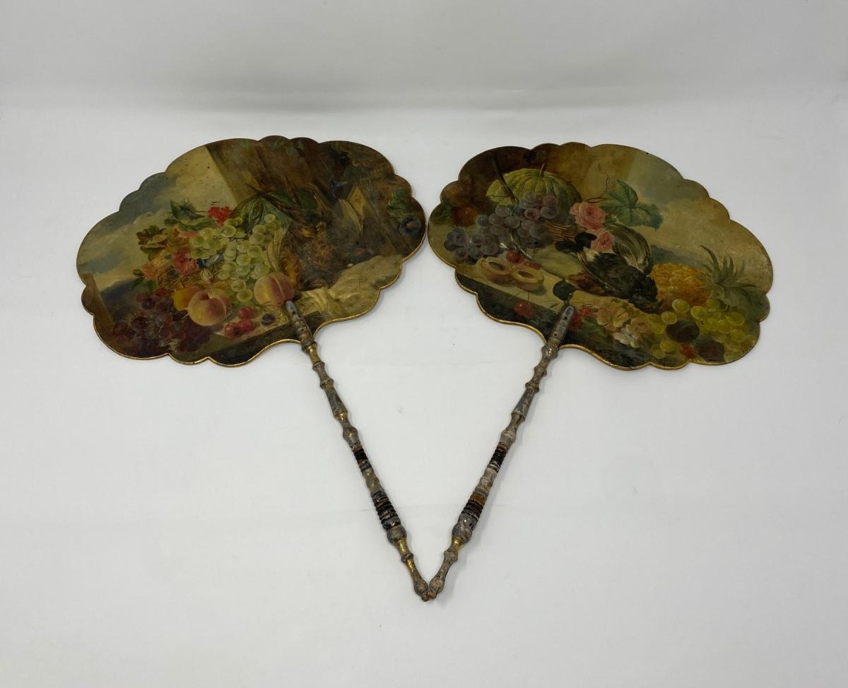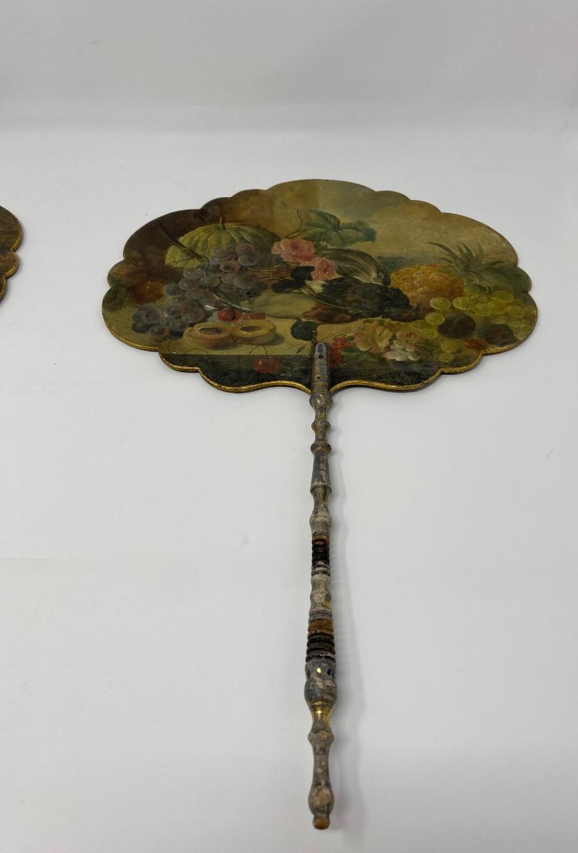 Two Antique Hand-Painted Wooden Handheld Fans