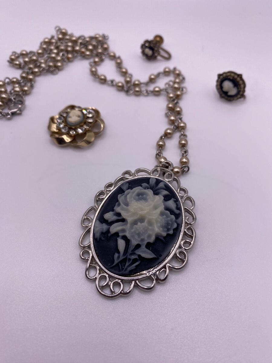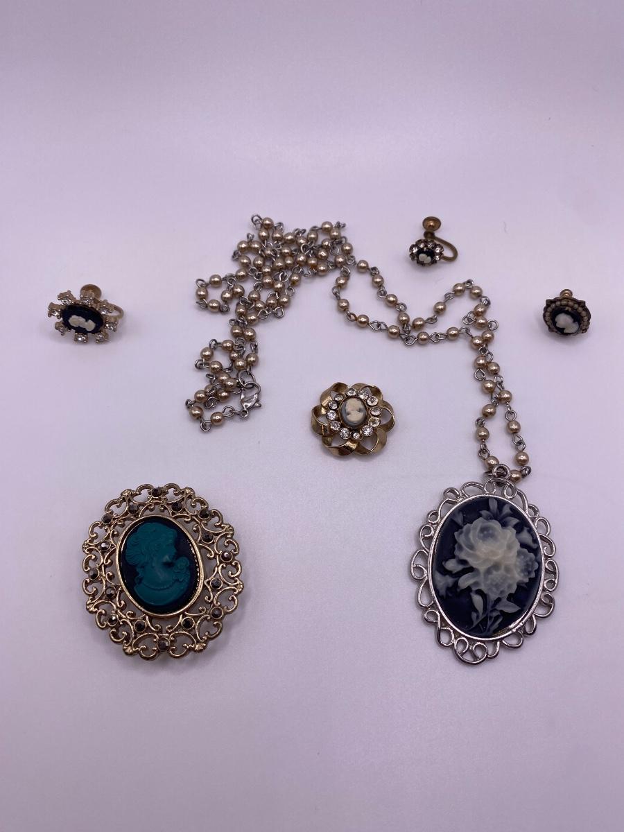 The Cameo Lot including a cameo brooch, a cameo pendant on long chain, and assorted single cameo earrings. Authenticity of gem/stone/metal is not guaranteed as seller is not a jeweler/gemologist. Please conduct your own research before bidding.