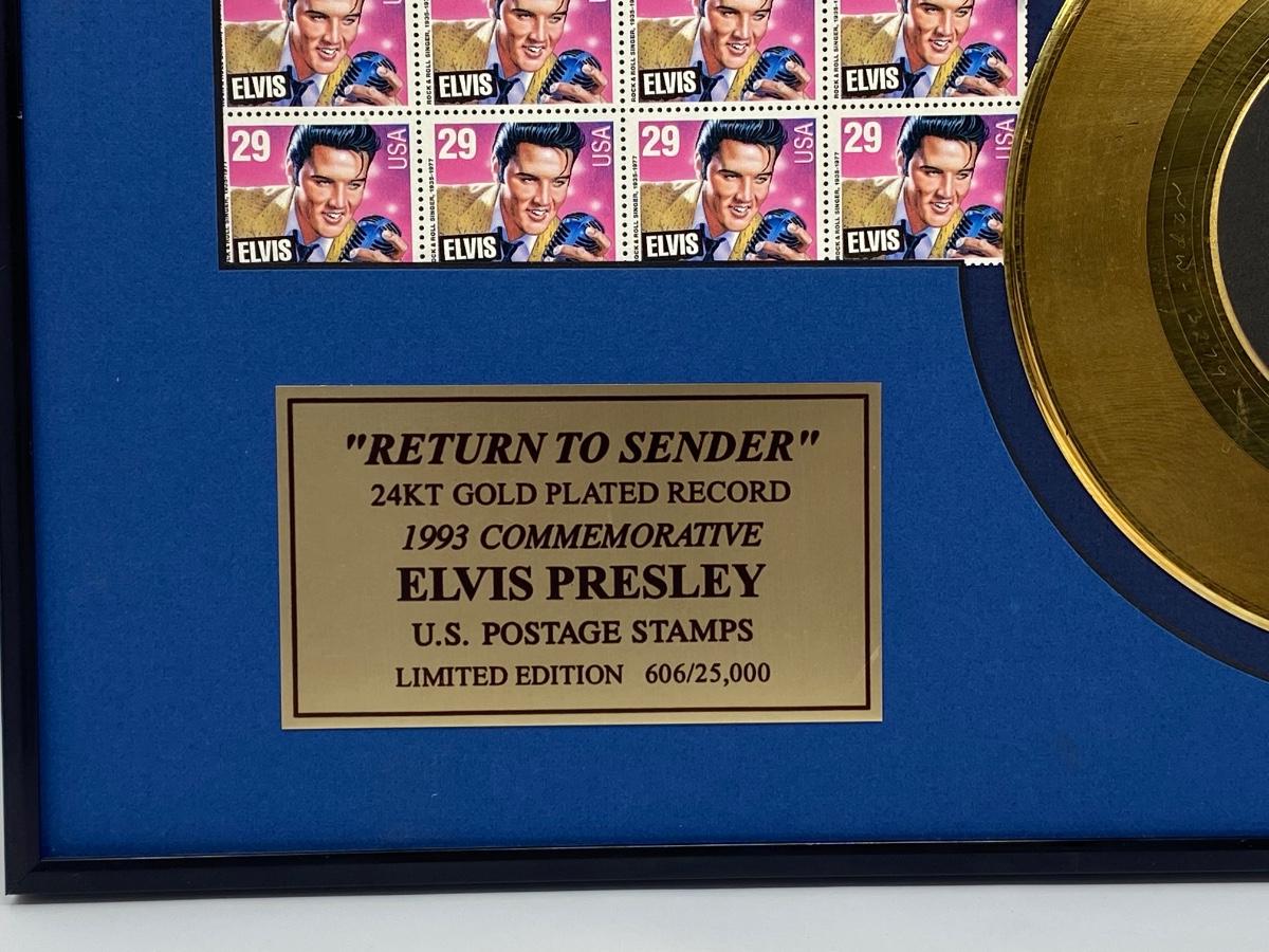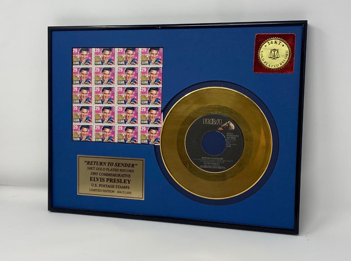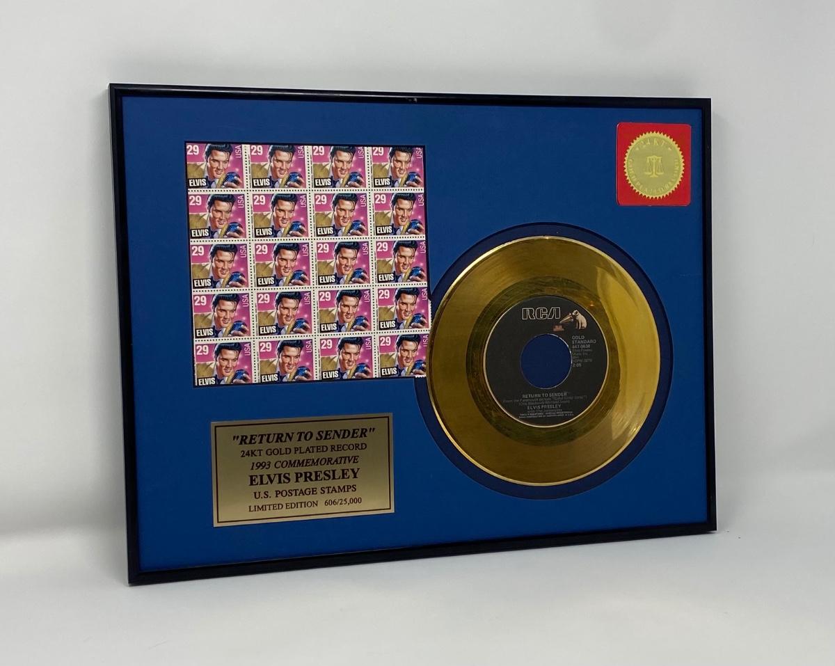 Vintage Limited Edition Elvis Presley's "Return to Sender" 24KT Gold-Plated Record. 1993 Commemorative Elvis Presley US Postage Stamps and 24KT Gold-Plated Record 606/25,000