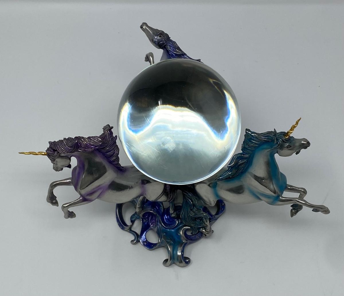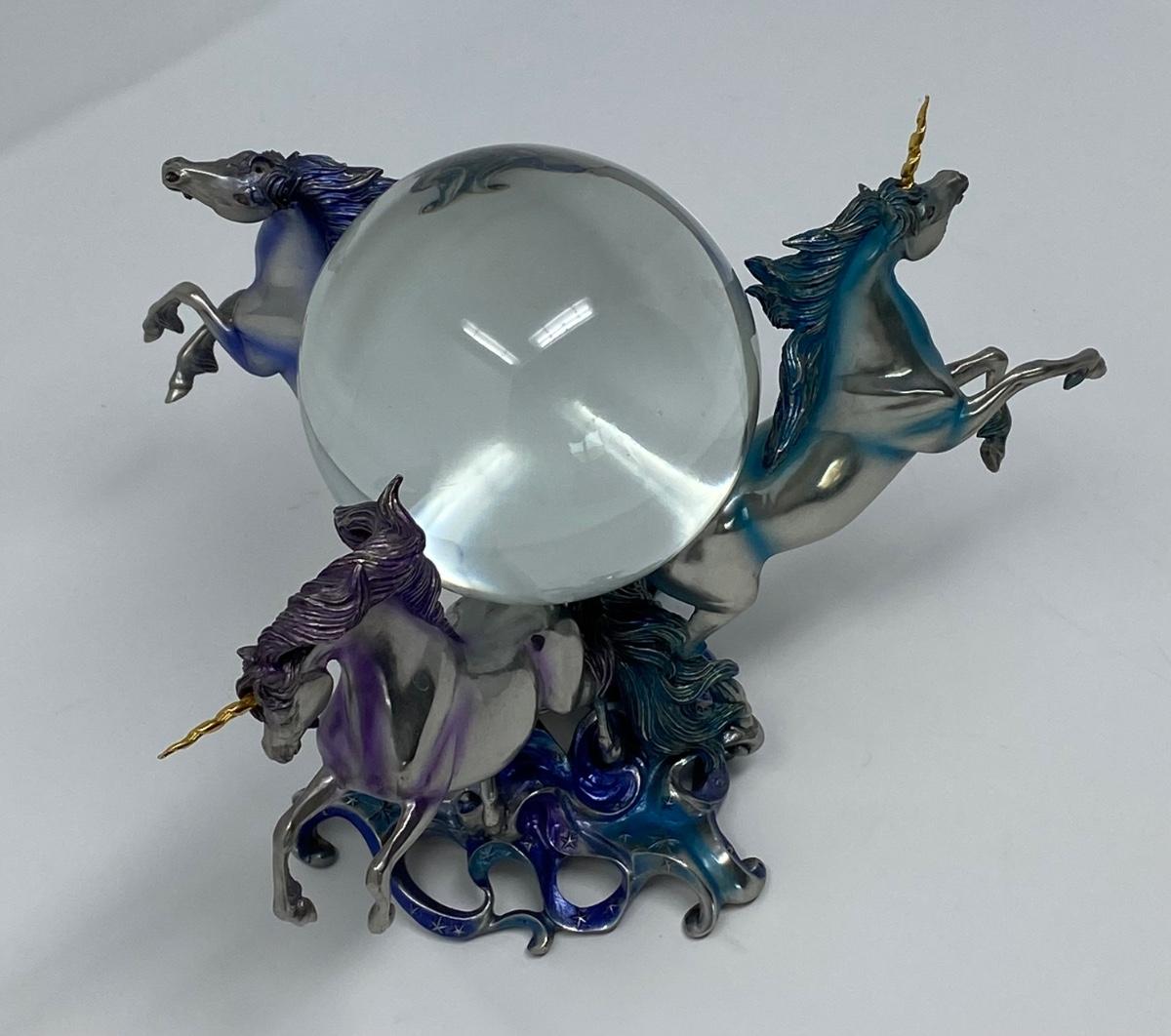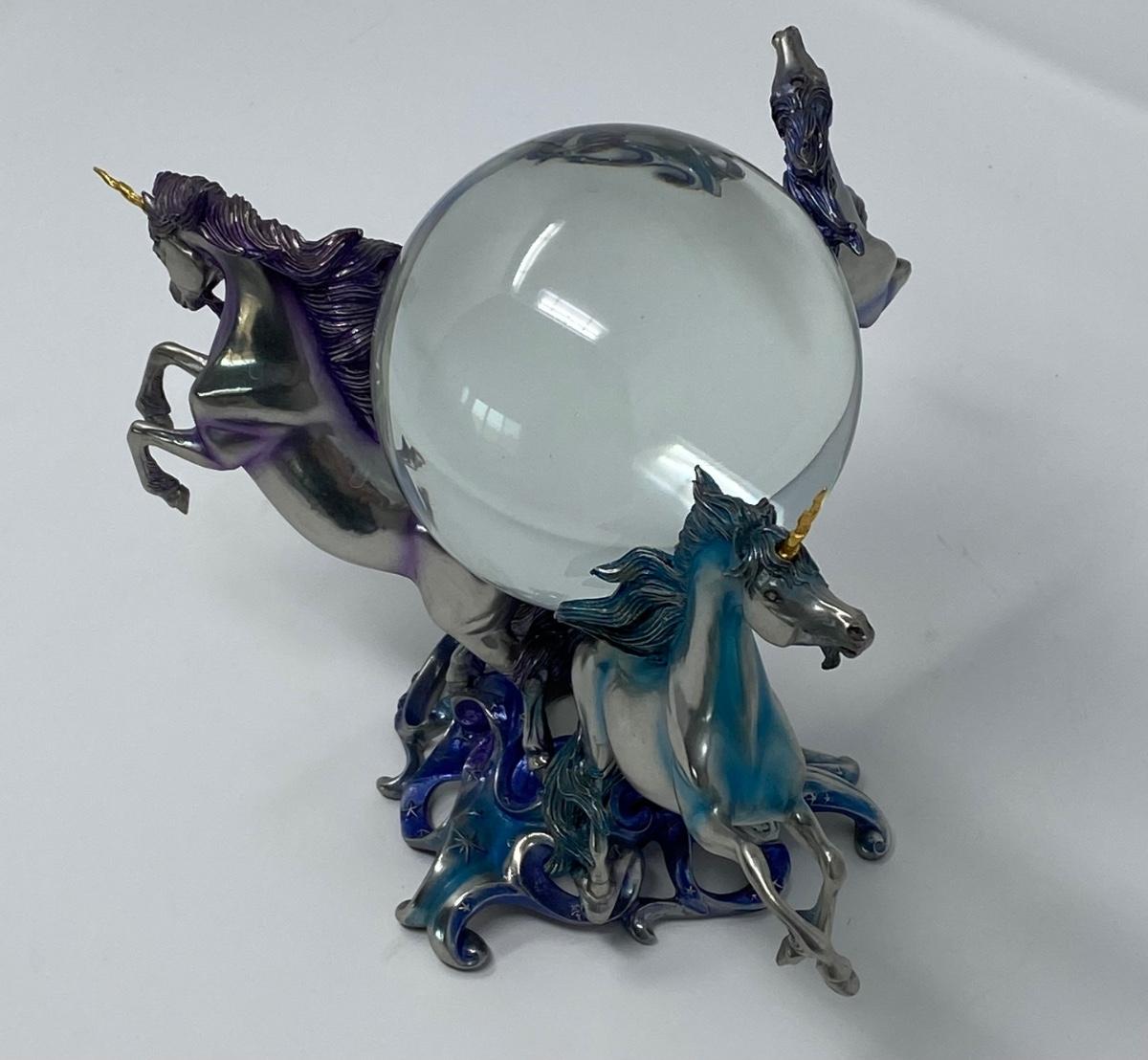 Franklin Mint "Unicorns of the New Age" Pewter Sculpture with Crystal Ball. There is an identified Unicorn that is missing and/or has a broken alicorn/horn.