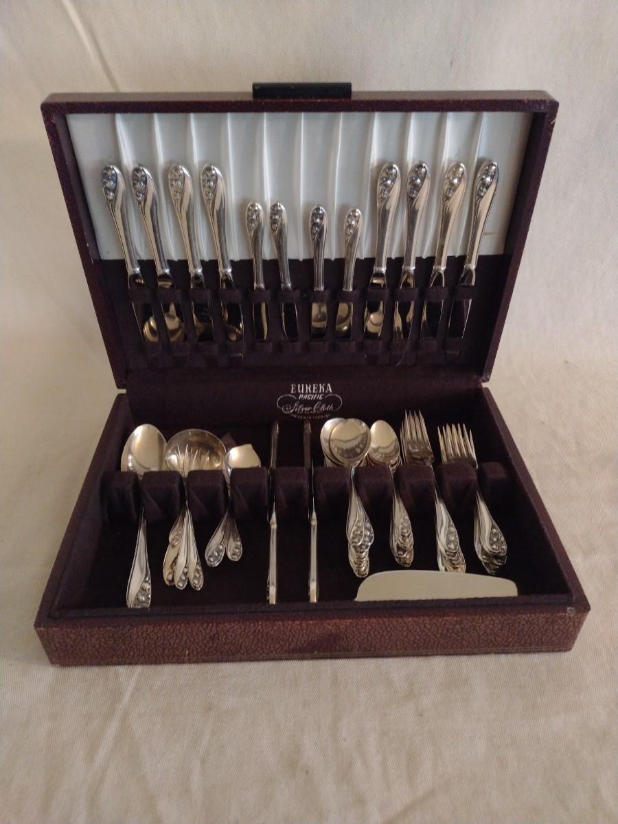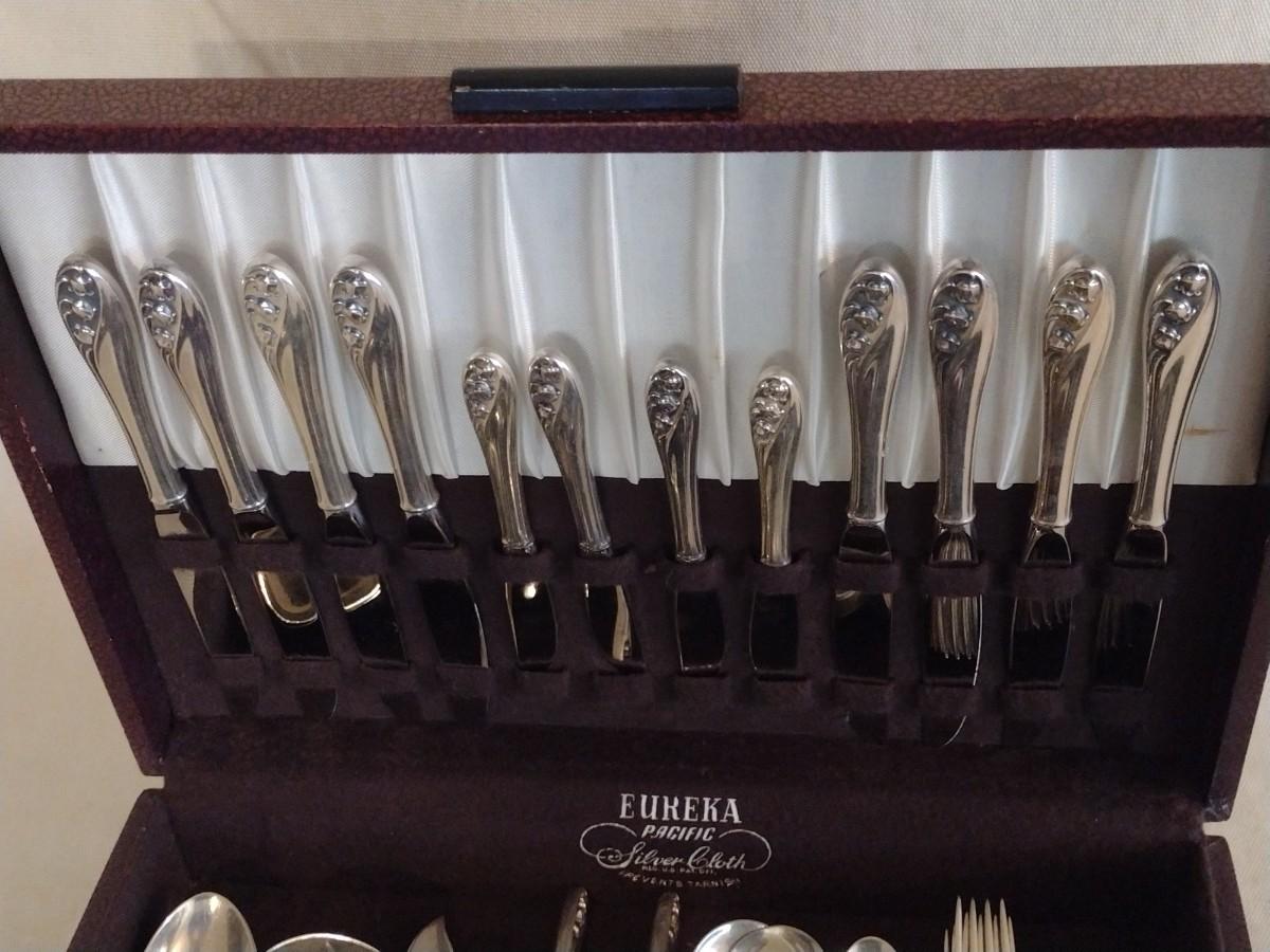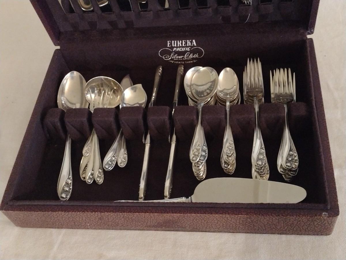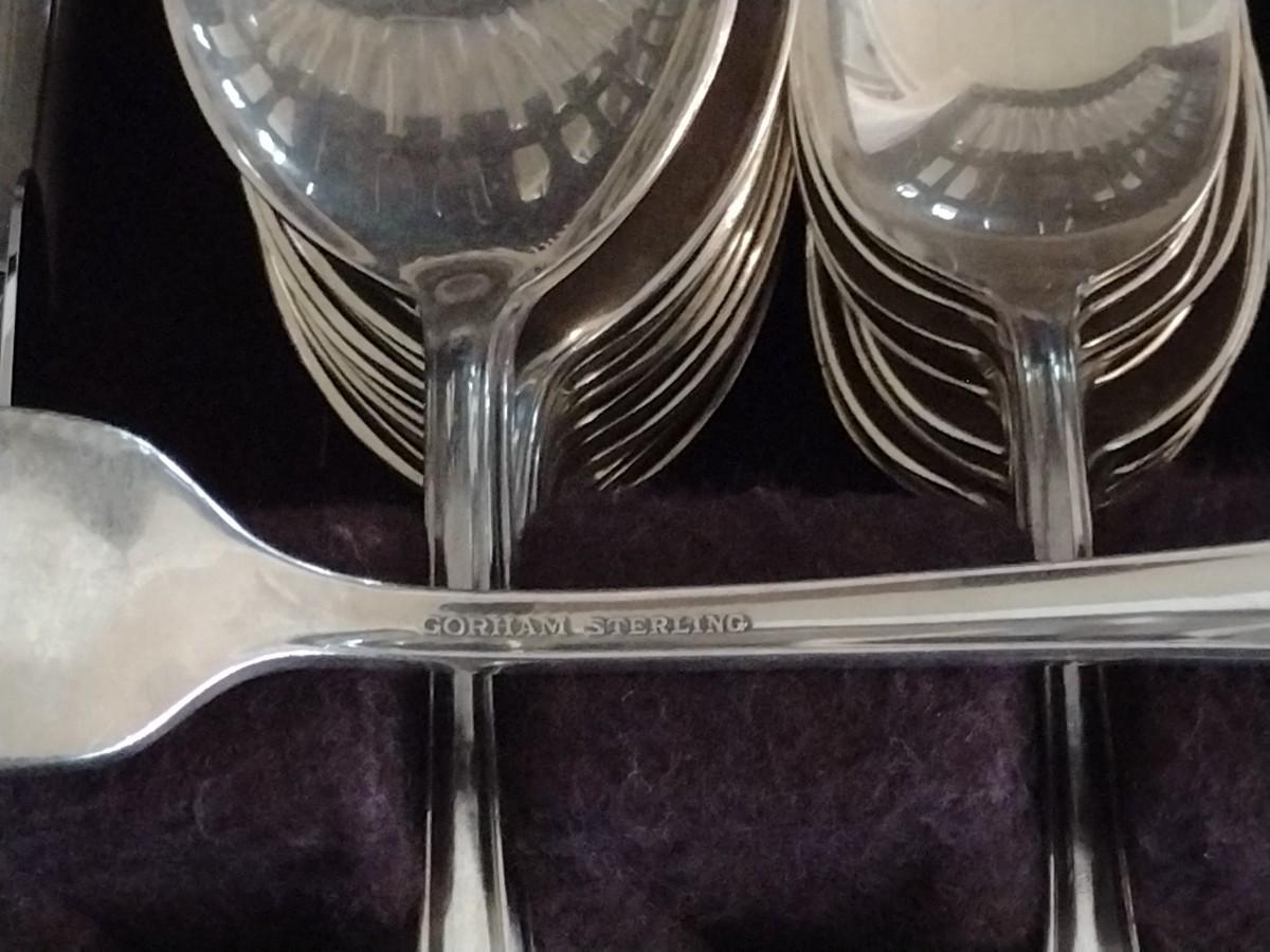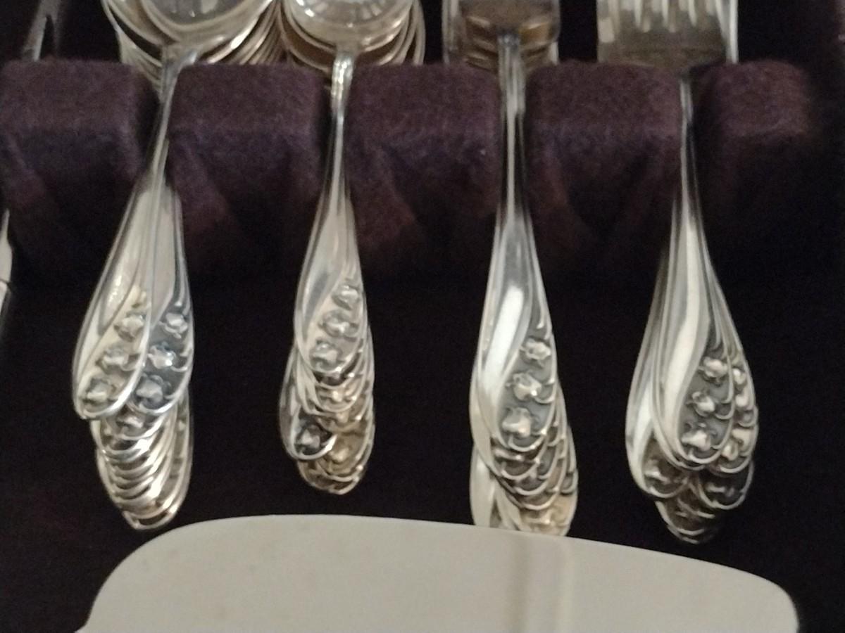 Vintage Sterling Silver Gorham Flatware Set Lily of the Valley Pattern in Wood Box Pieces 1837 grams knives are stainless and not considered in weight of the set.