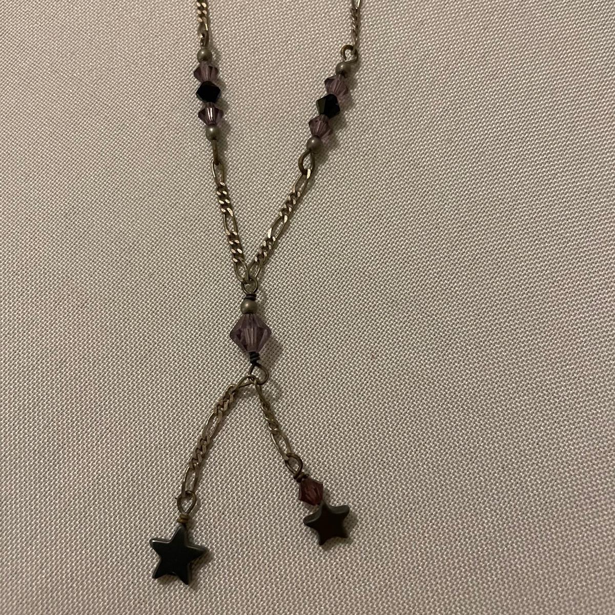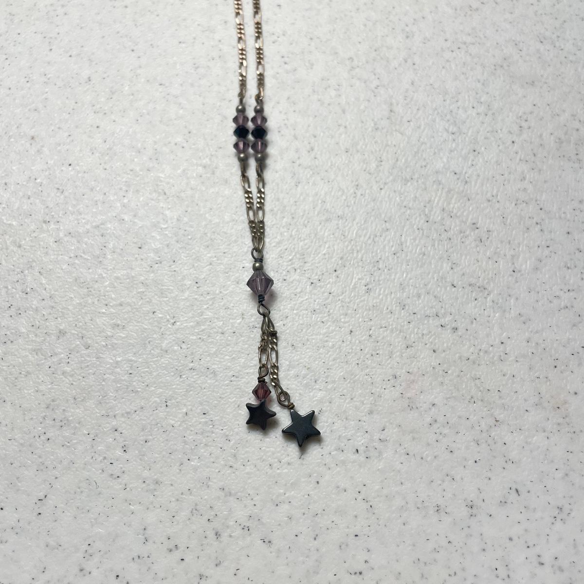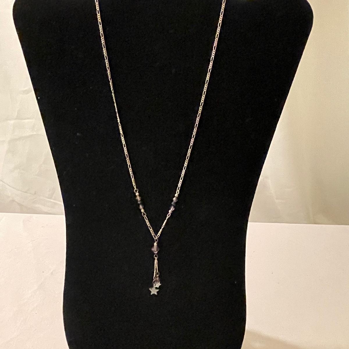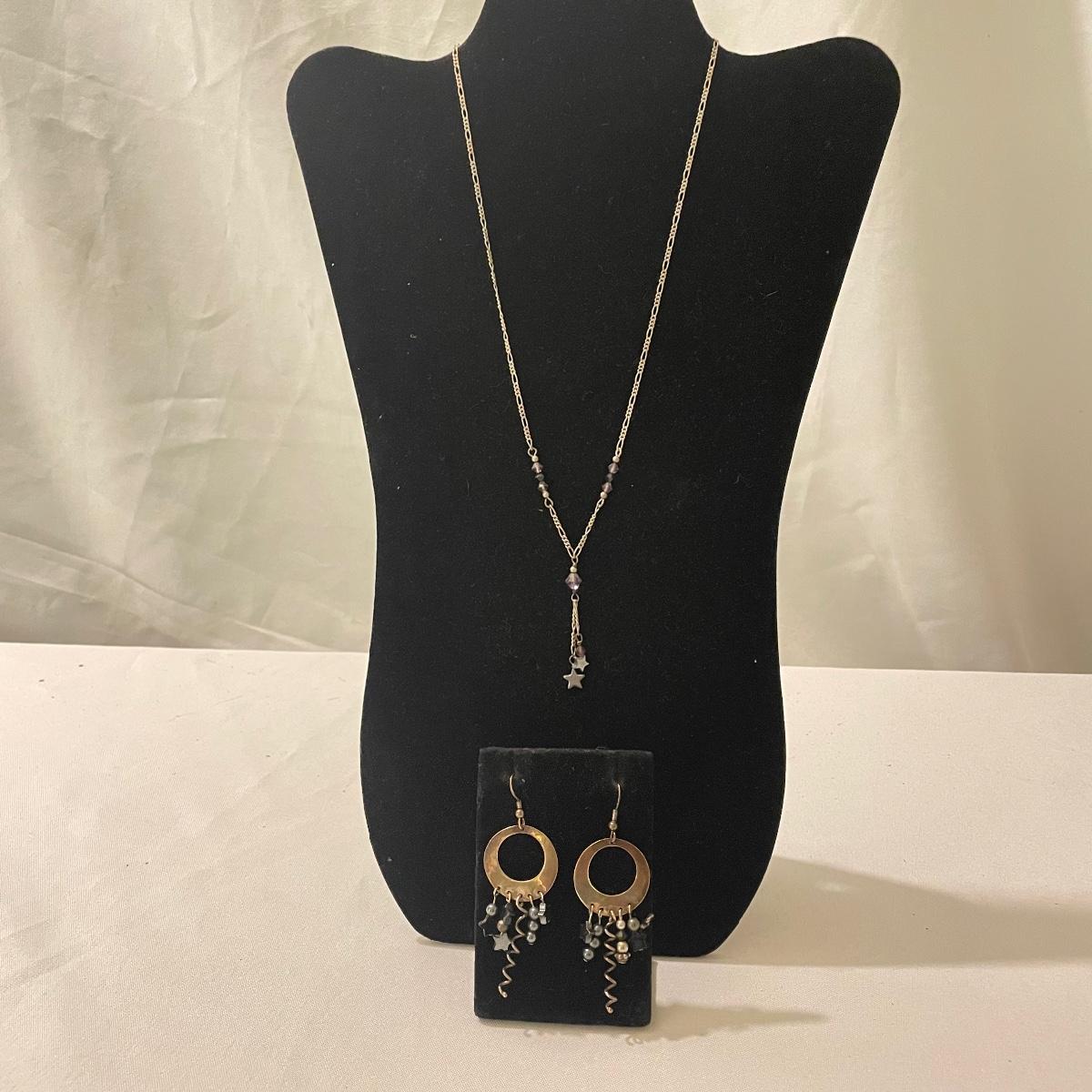 The necklace is marked 925 and has small black and amethyst colored beads including onyx colored stars which the earrings also have. The Sterling earrings have beads also and are post style for pierced ears. Necklace measures 18”.