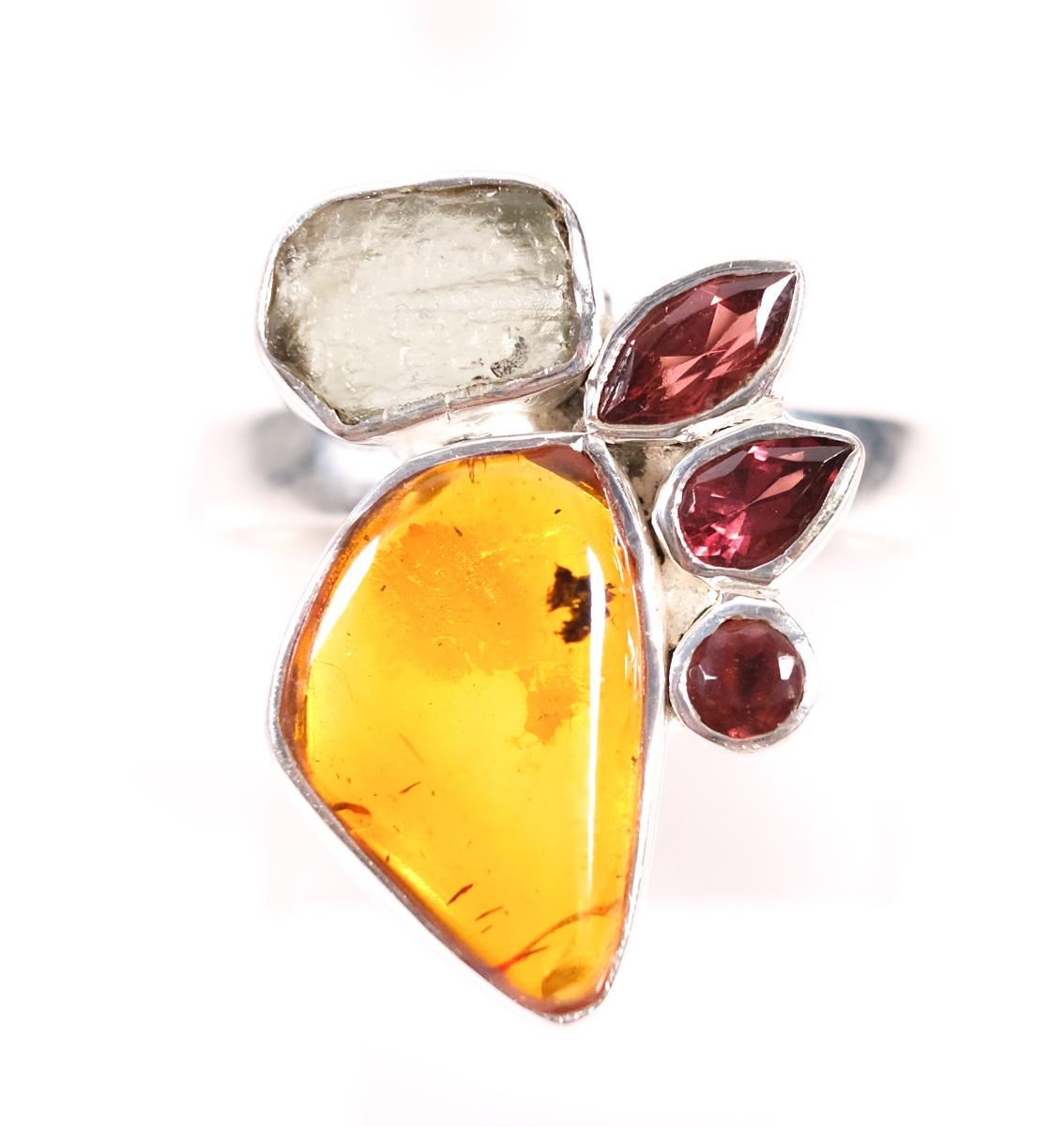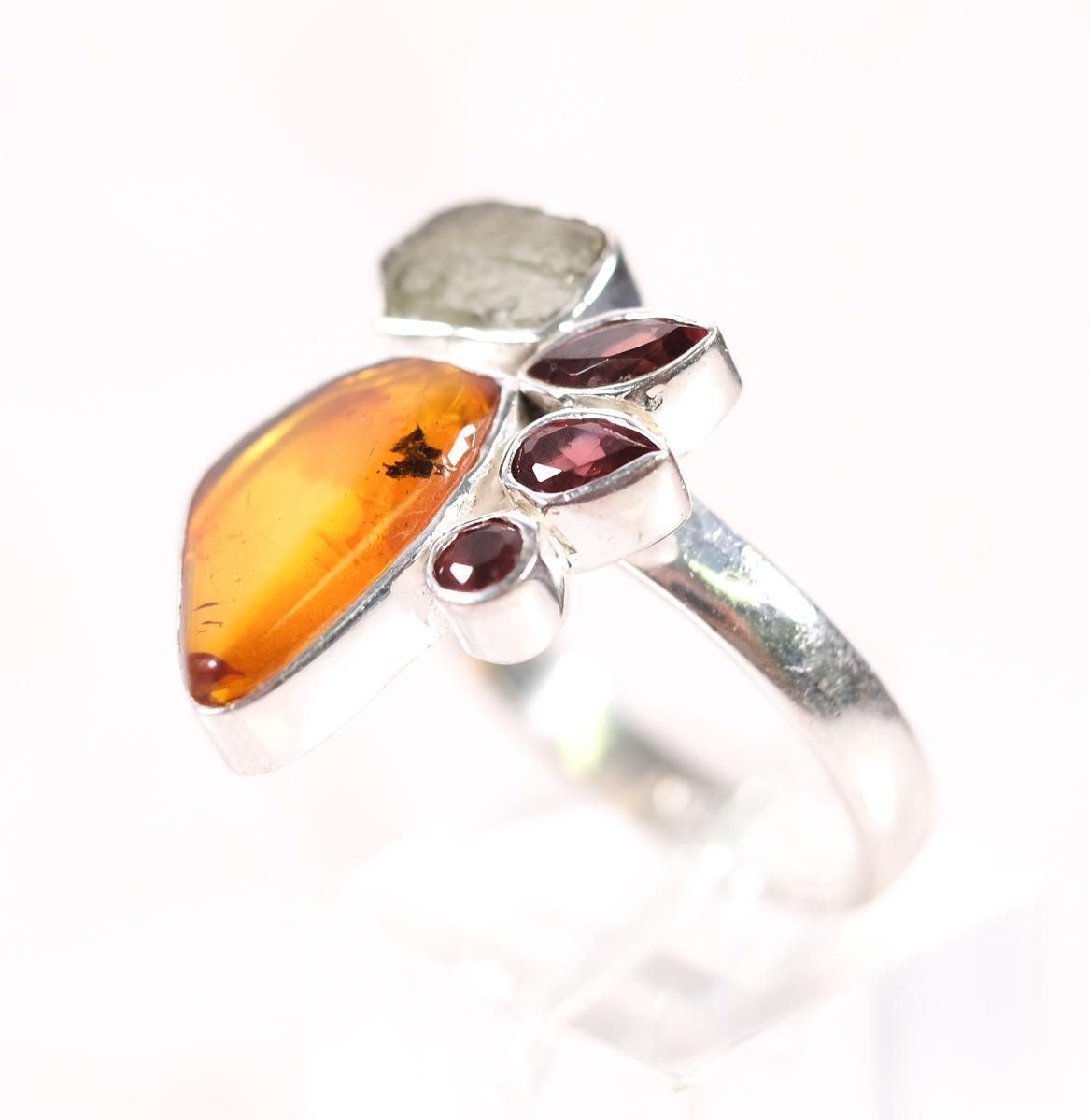 Sterling Amber, Garnet & Moldavite Ring, Size 9.25