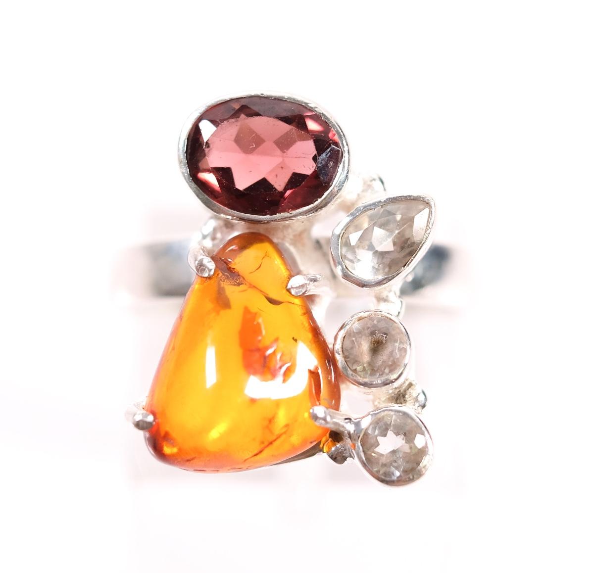 Sterling Amber, Garnet & Quartz Ring, Size 7