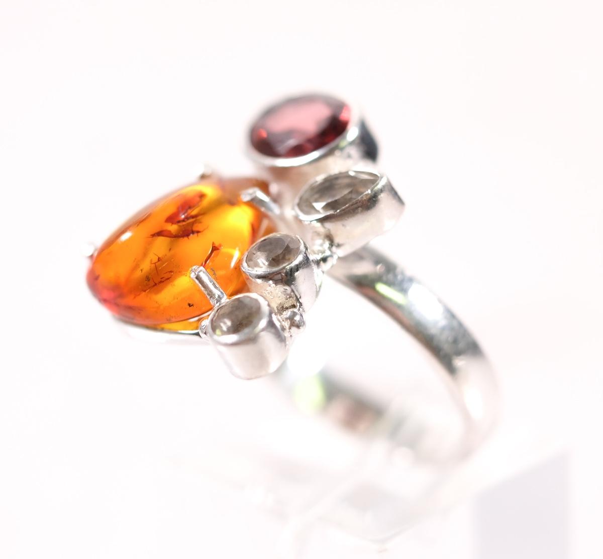 Sterling Amber, Garnet & Quartz Ring. Size 7. Stamped 925. Weighs approx. 5 grams.