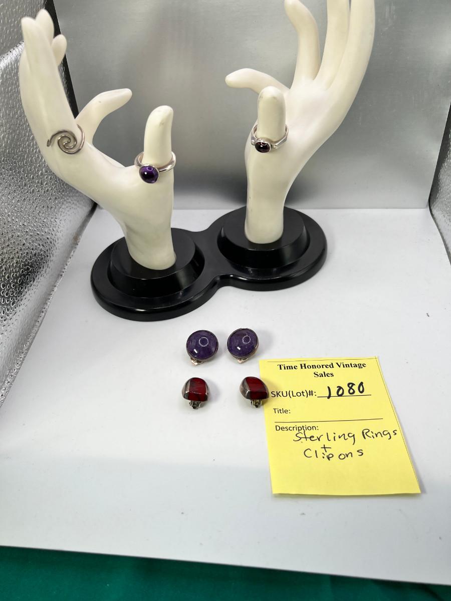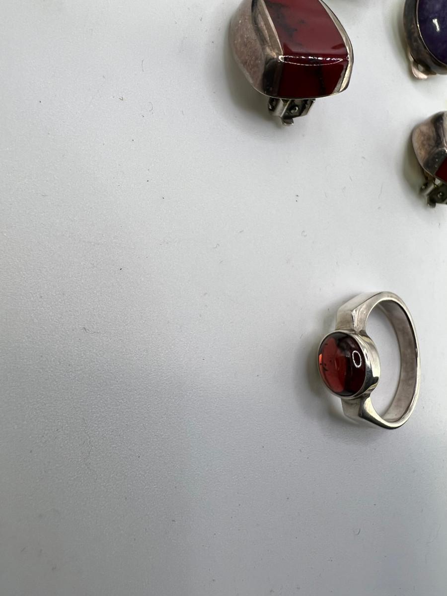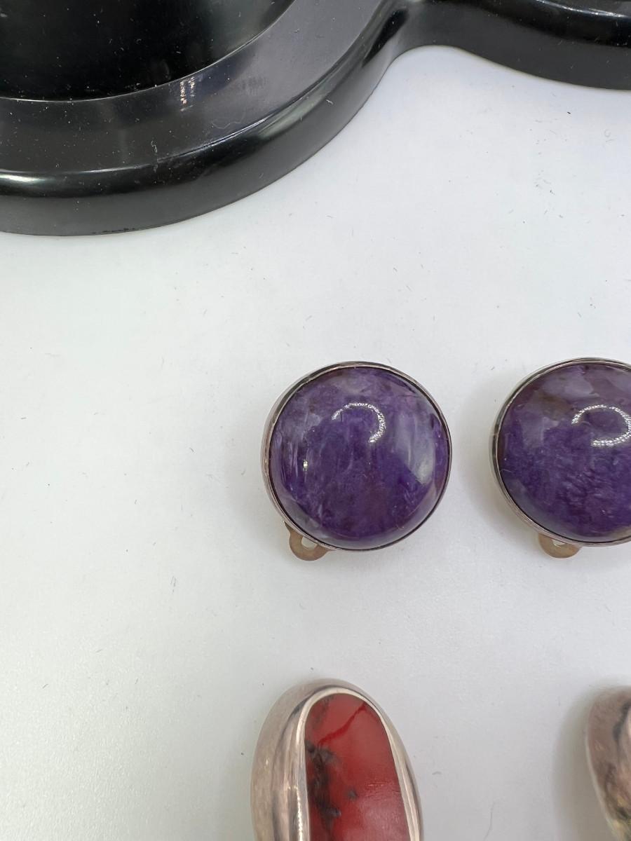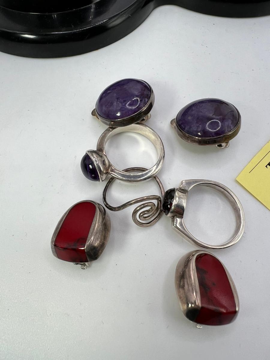 Sterling amethyst rings and clip on earrings, and red jasper clip ons