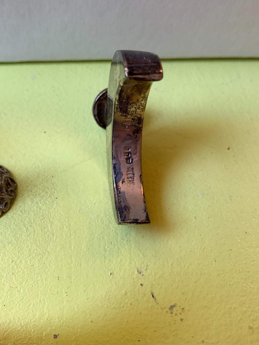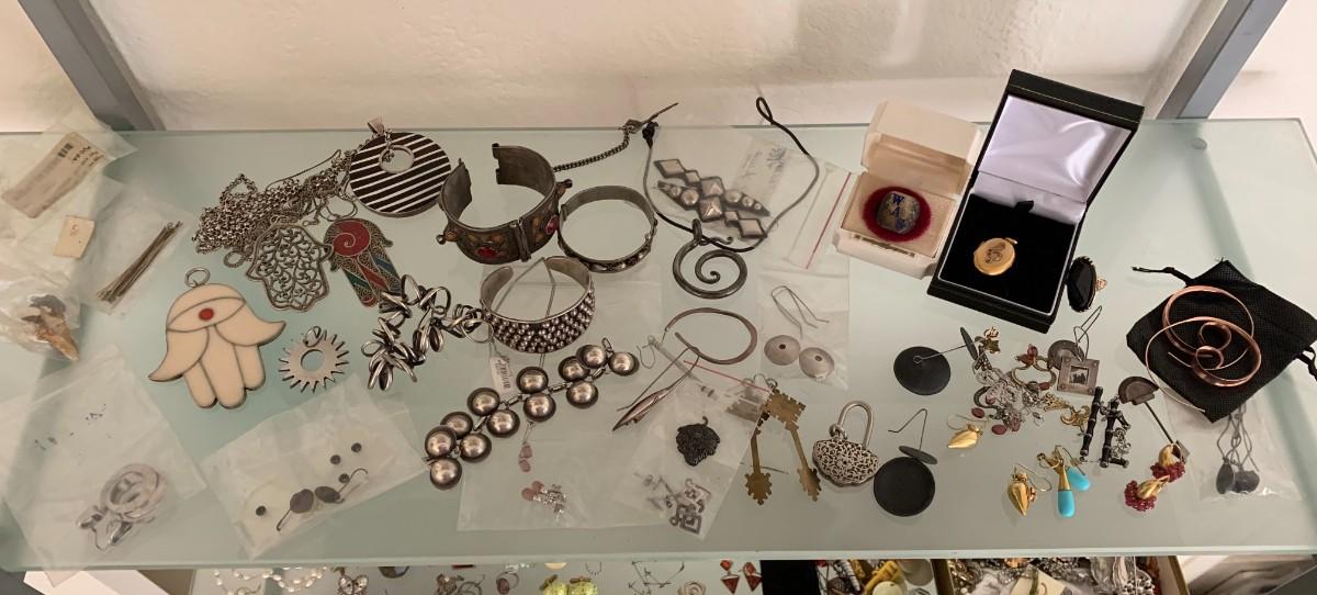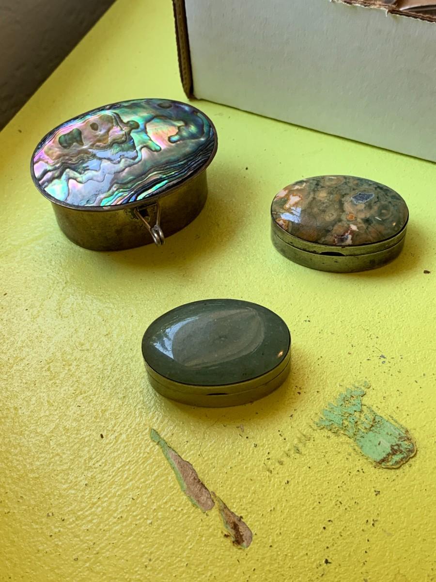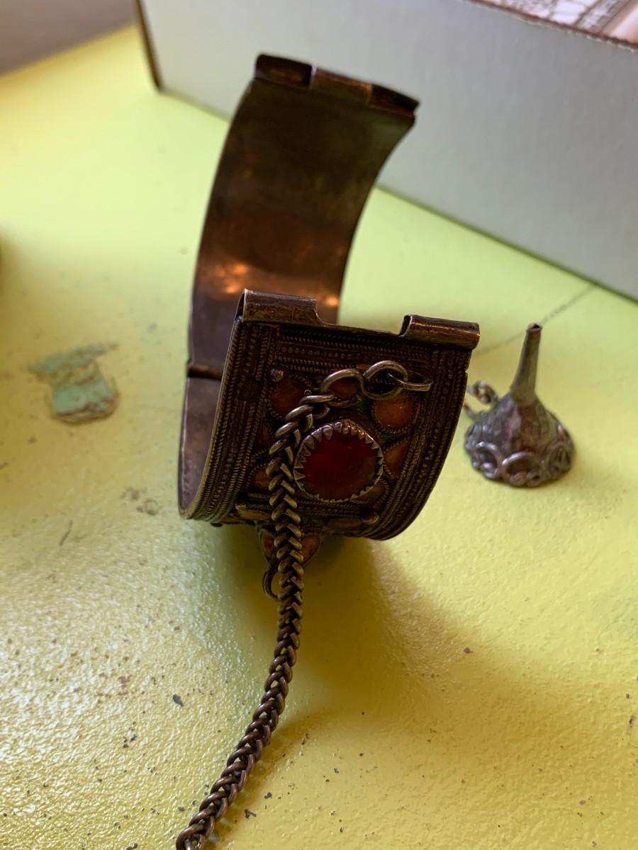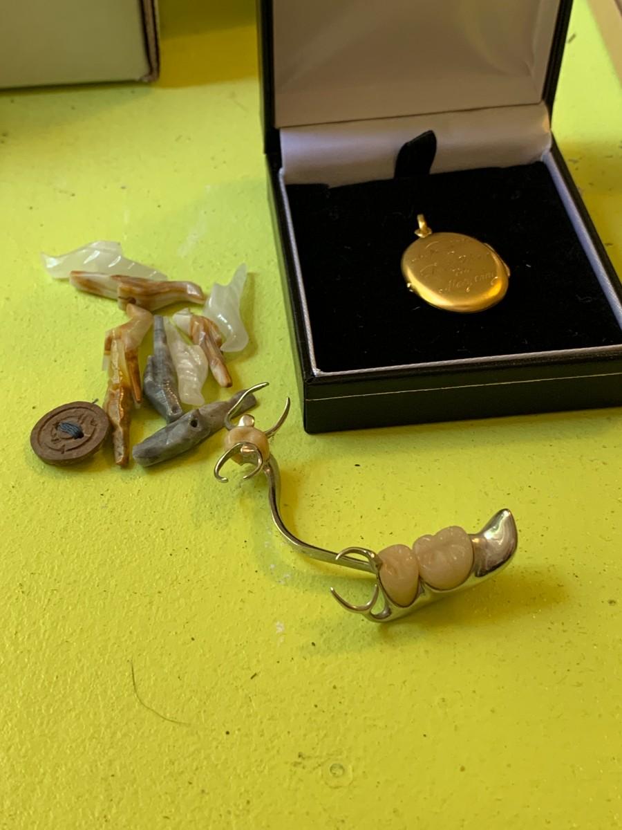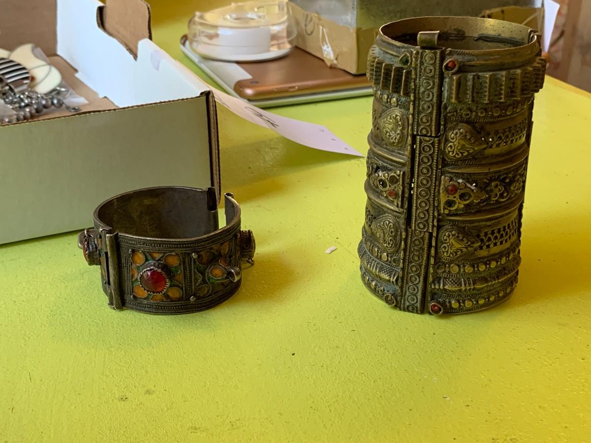 Large cuff bracelets. 3 tiny hinged boxes. Gold tone engraved locket. Set of teeth set in unknown metal. 3 pieces sterling