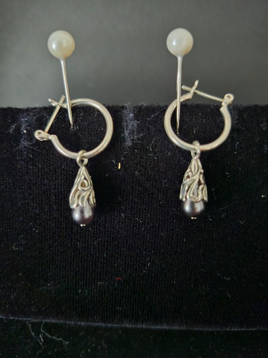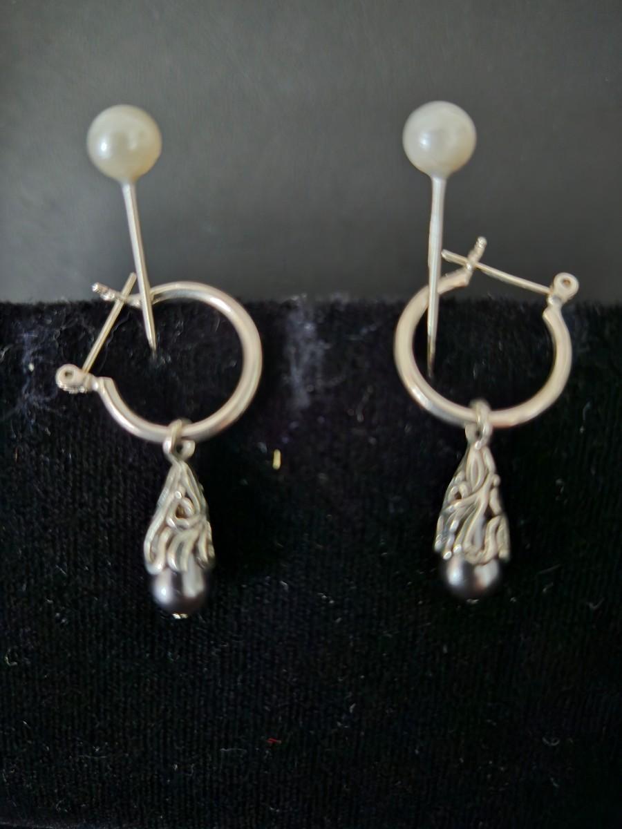 Pierced, the pearls are encased in lovely silver scroll cones. Very nice condition.