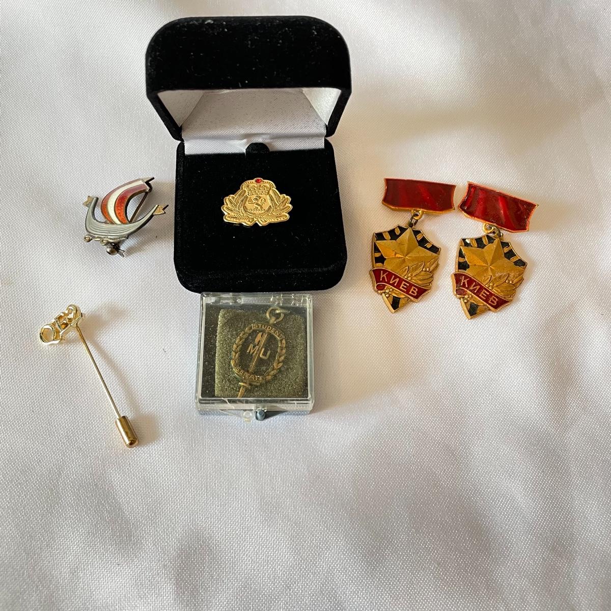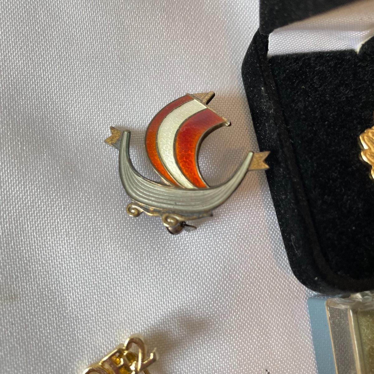 Four solo pins plus a set of military style pins. The silver boat is marked Norway Sterling. See images. Shipping available.
