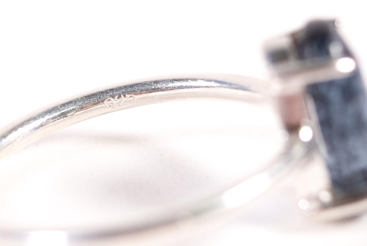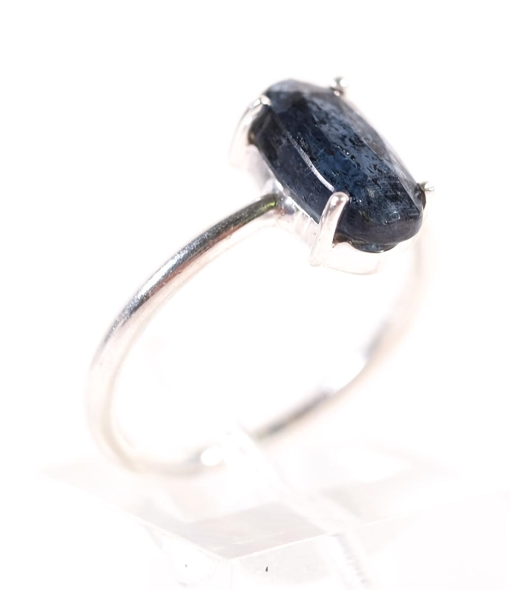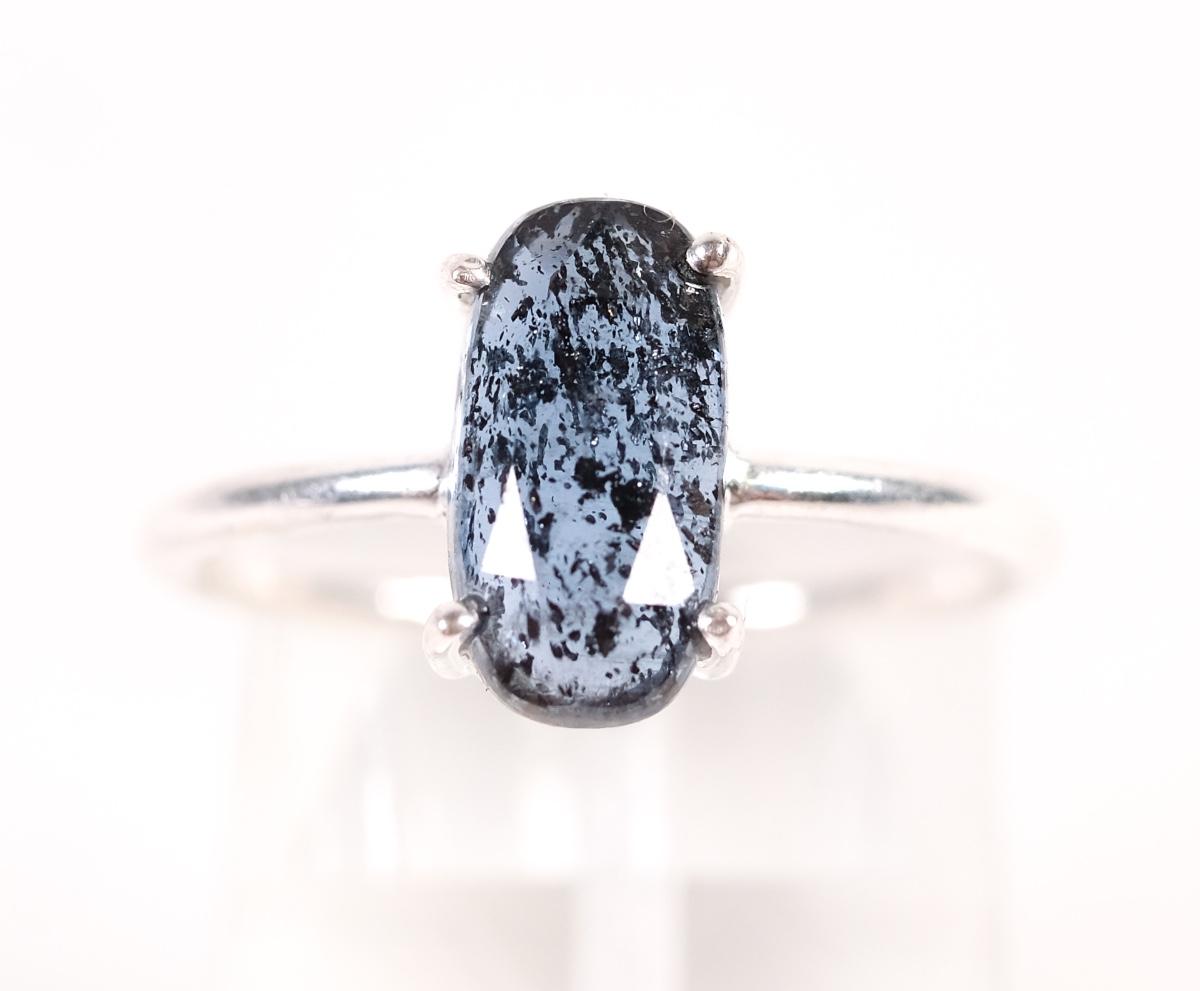 Sterling Blue Gemstone with pepper mineral inclusions Ring. Size 7. Stamped 925. Gemstone measures approx. 3/8". Weighs approx. 2.1 grams.