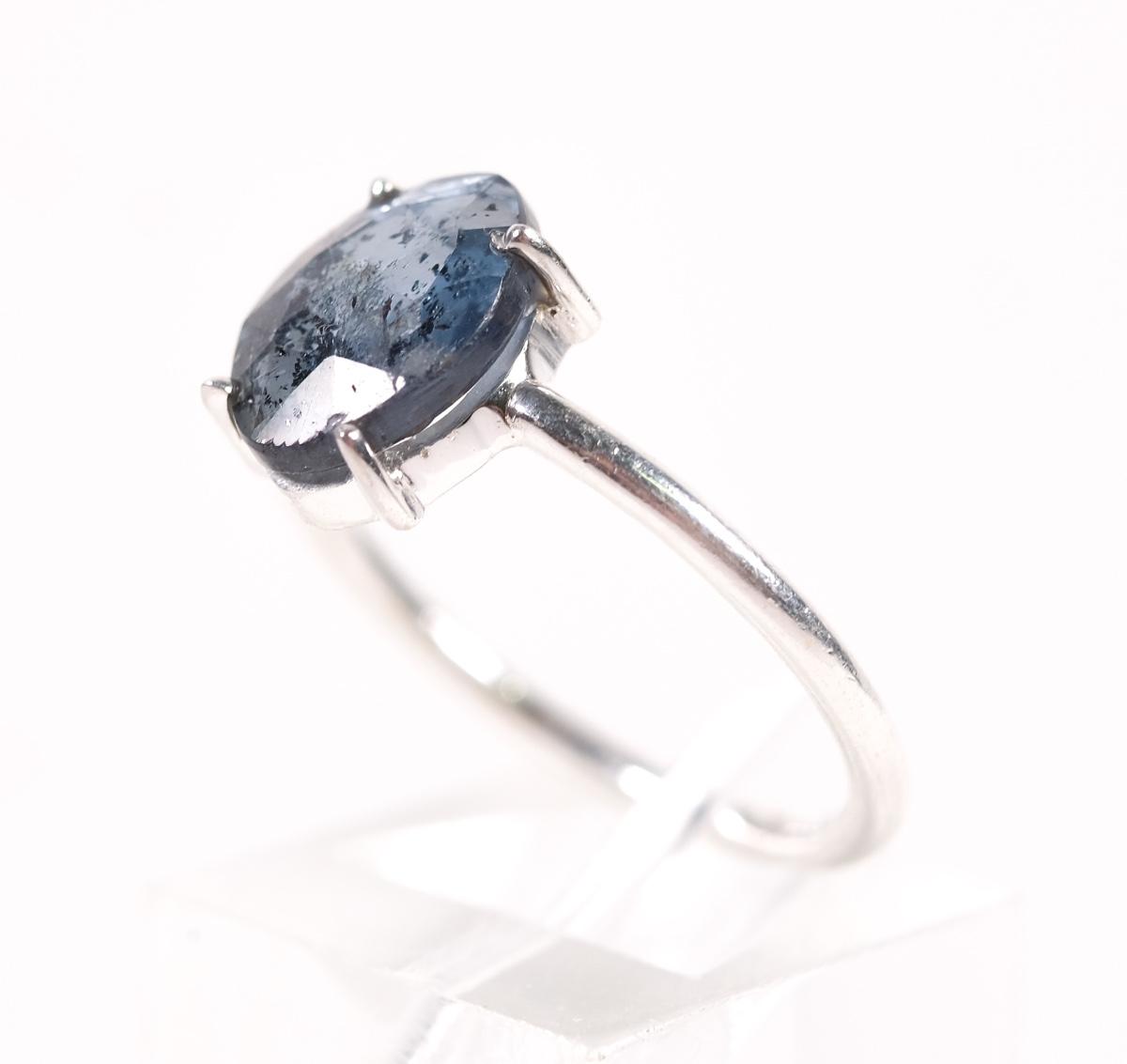 Sterling Blue Gemstone with pepper mineral inclusions ring. Size 8.75. Stamped 925. Gemstone measures approx. 3/8". Weighs approx. 2.2 grams.