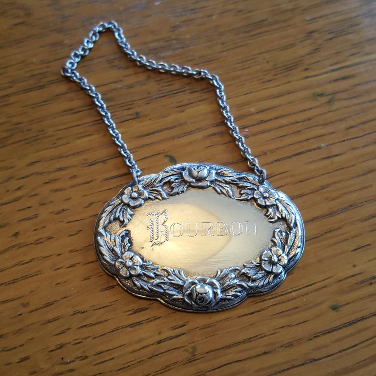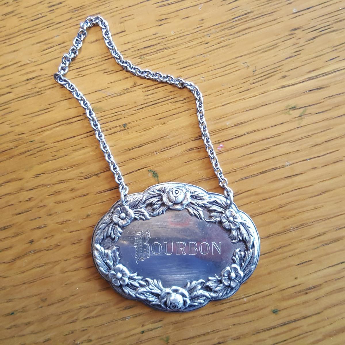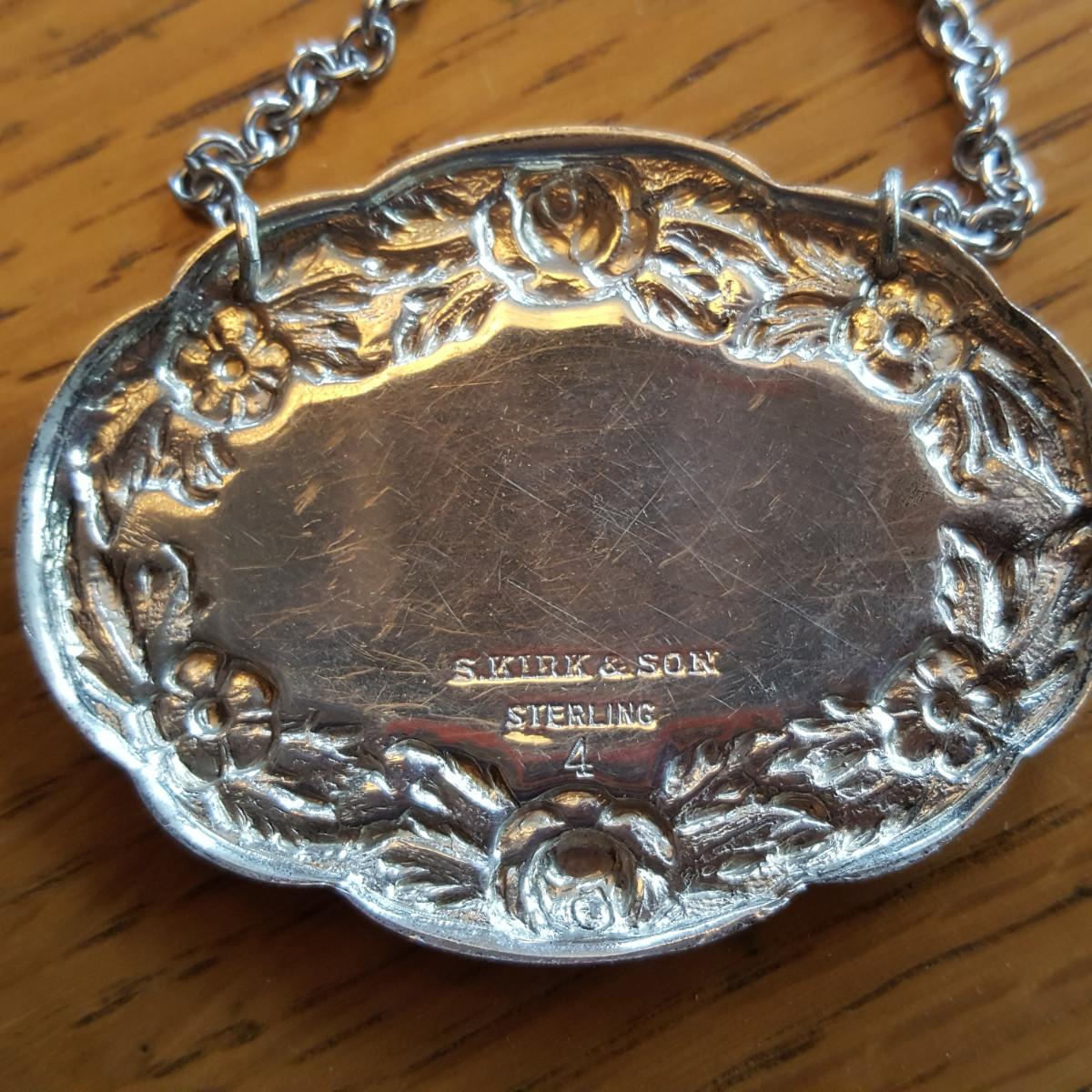 This auction lot is for a Sterling Bourbon Decanter Label. This shiny sterling Bourbon bottle marker is just what the doctor ordered for the well dressed Kentucky (or any state) home bar. Nicely embossed with a rose garland. Made by the S. Kirk and Son Silver Company.