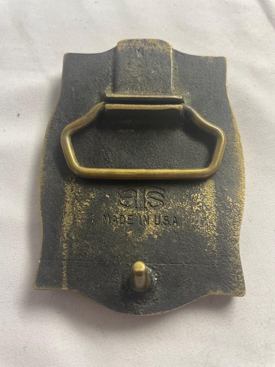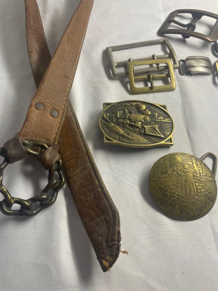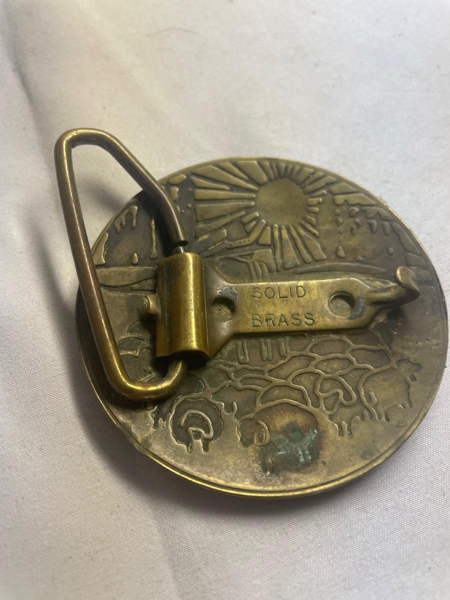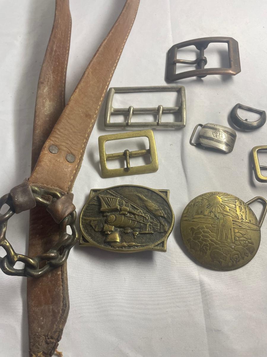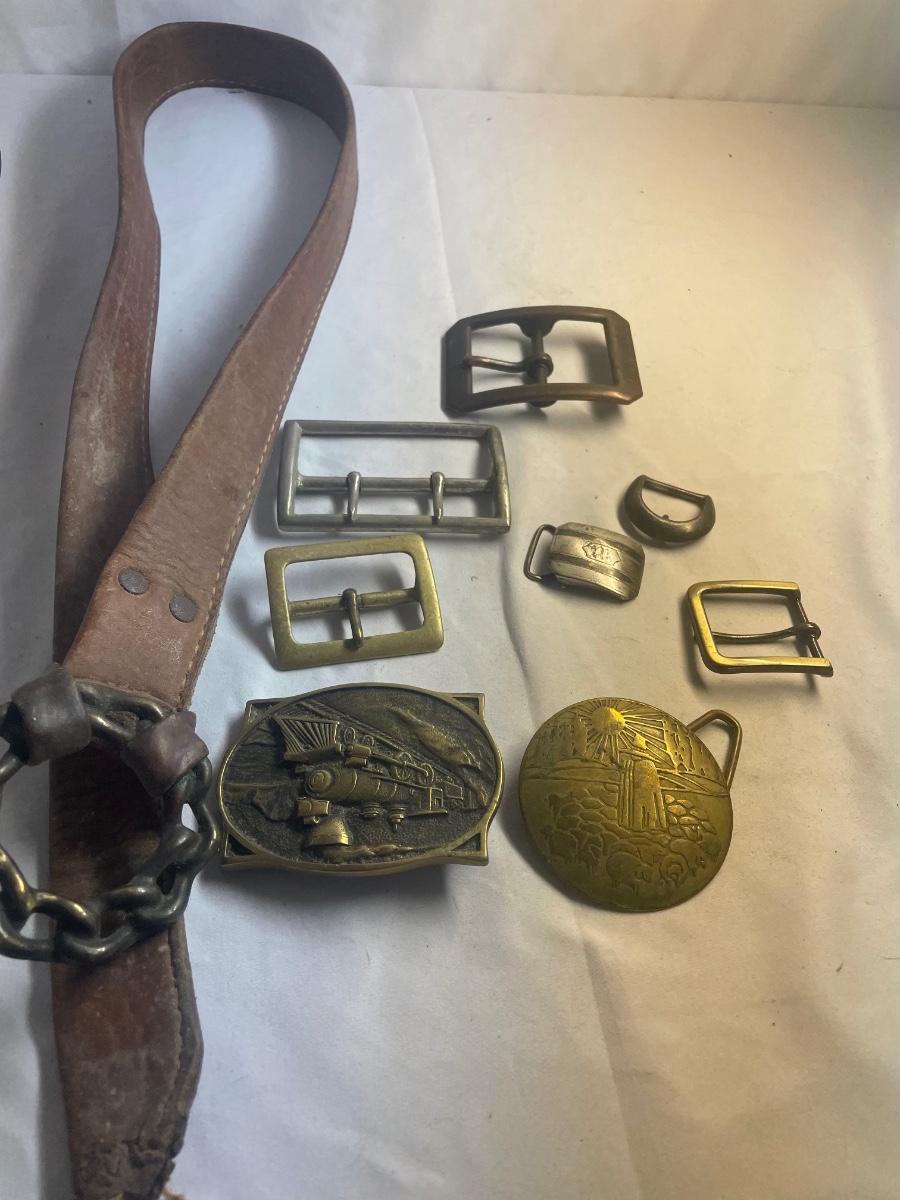 This great assortment of belt buckles includes a sterling buckle, 2 large solid brass buckles, 5 more metal belt buckles and a wood ring in the shape of a steer. The belt is hand waxed steerhide and has a brass colored buckle. All items are in good condition.