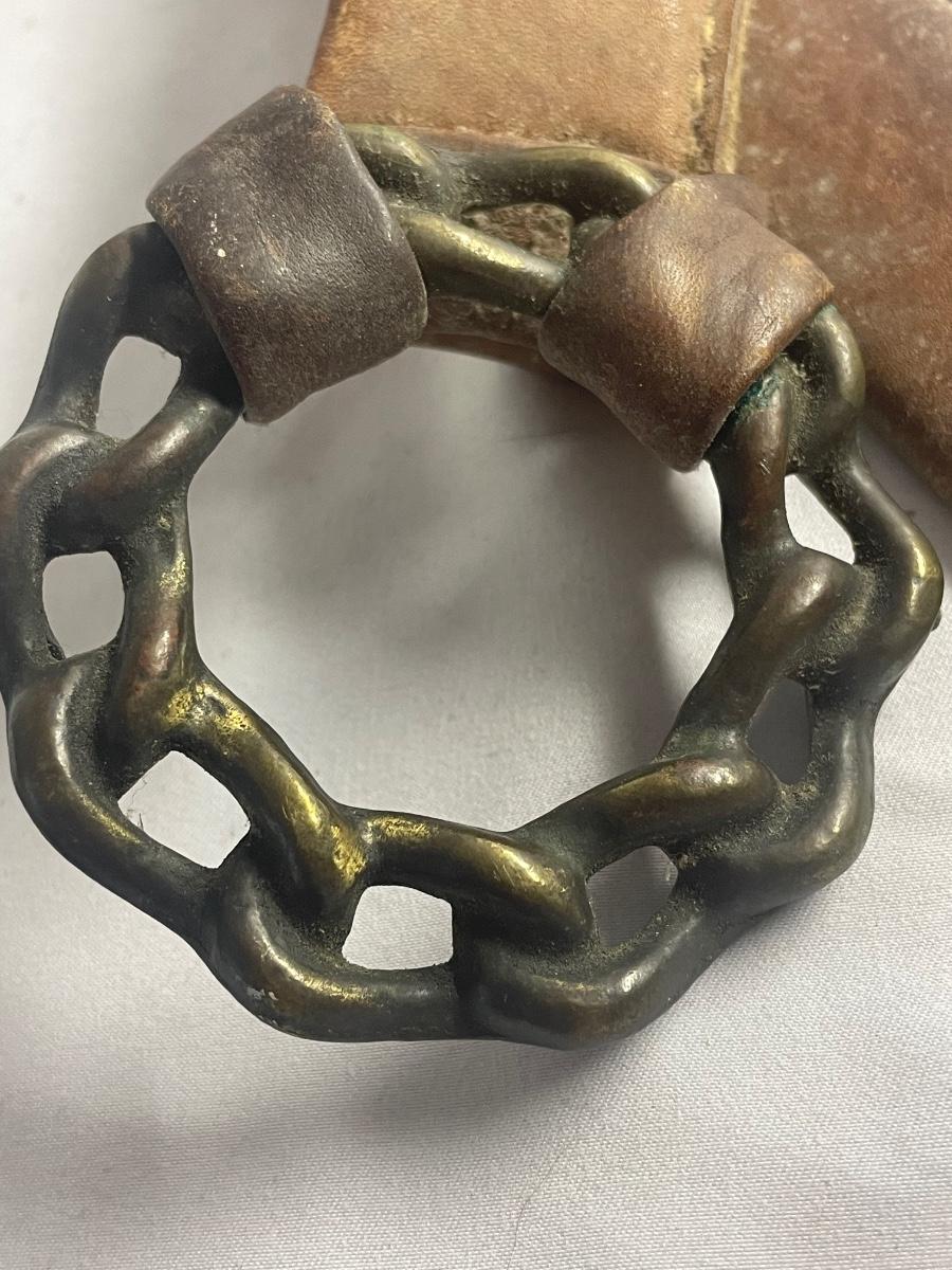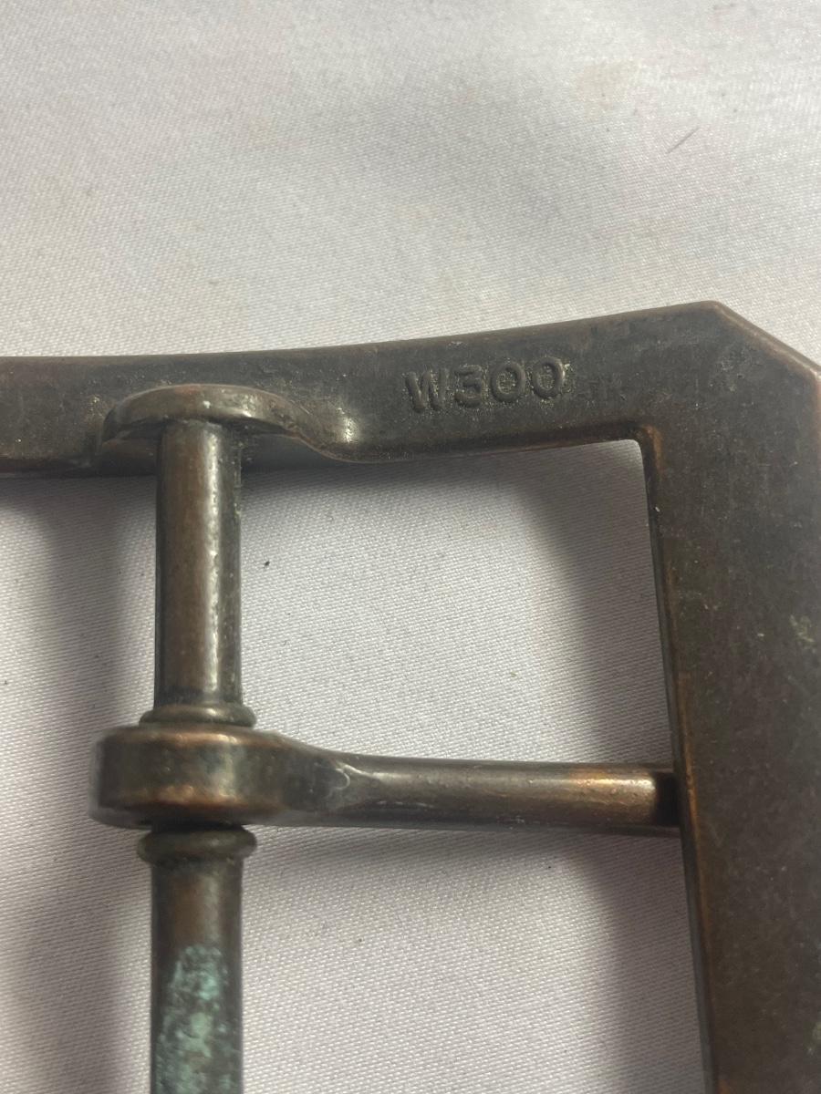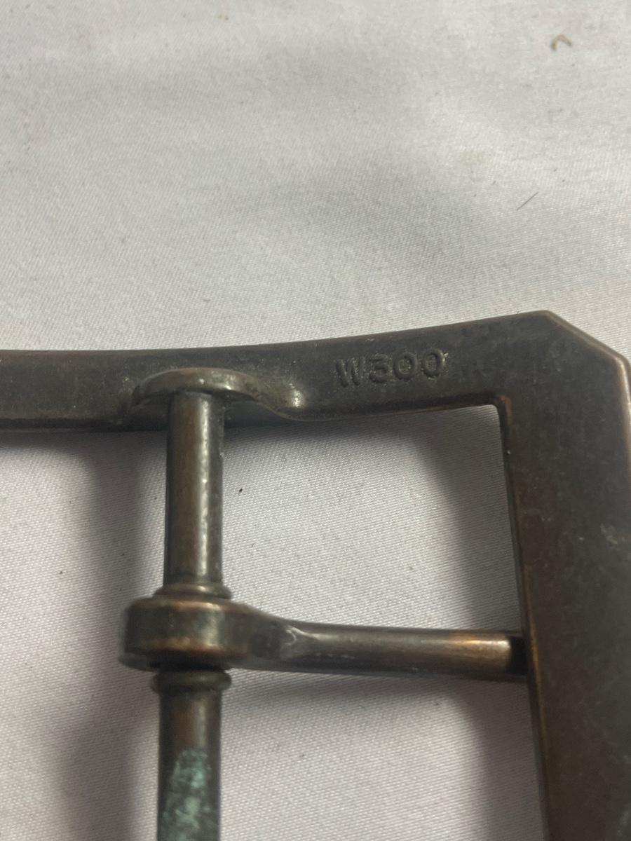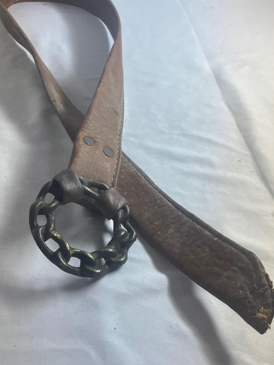 This great assortment of belt buckles includes a sterling buckle, 2 large solid brass buckles, 5 more metal belt buckles and a wood ring in the shape of a steer. The belt is hand waxed steerhide and has a brass colored buckle. All items are in good condition.