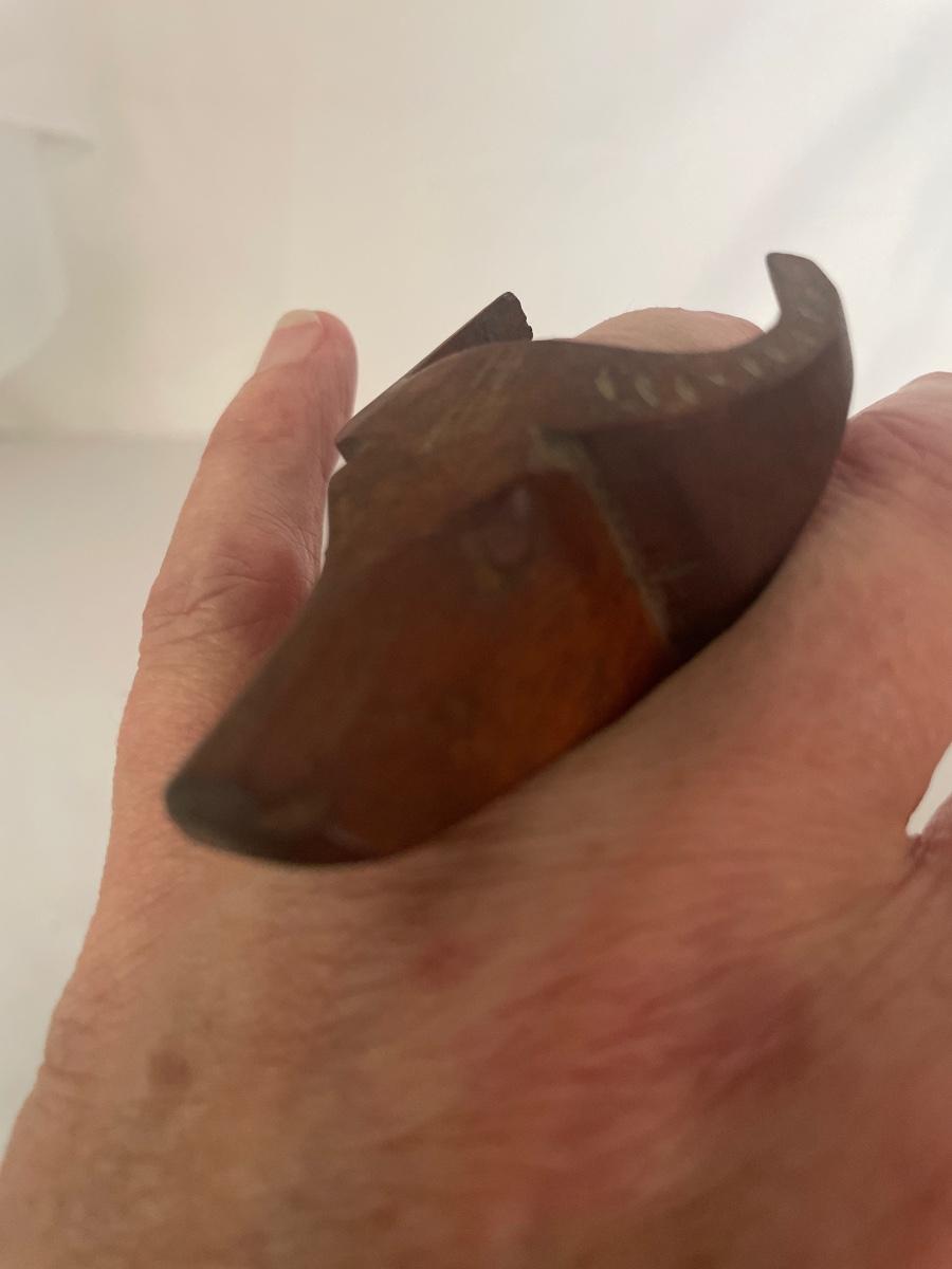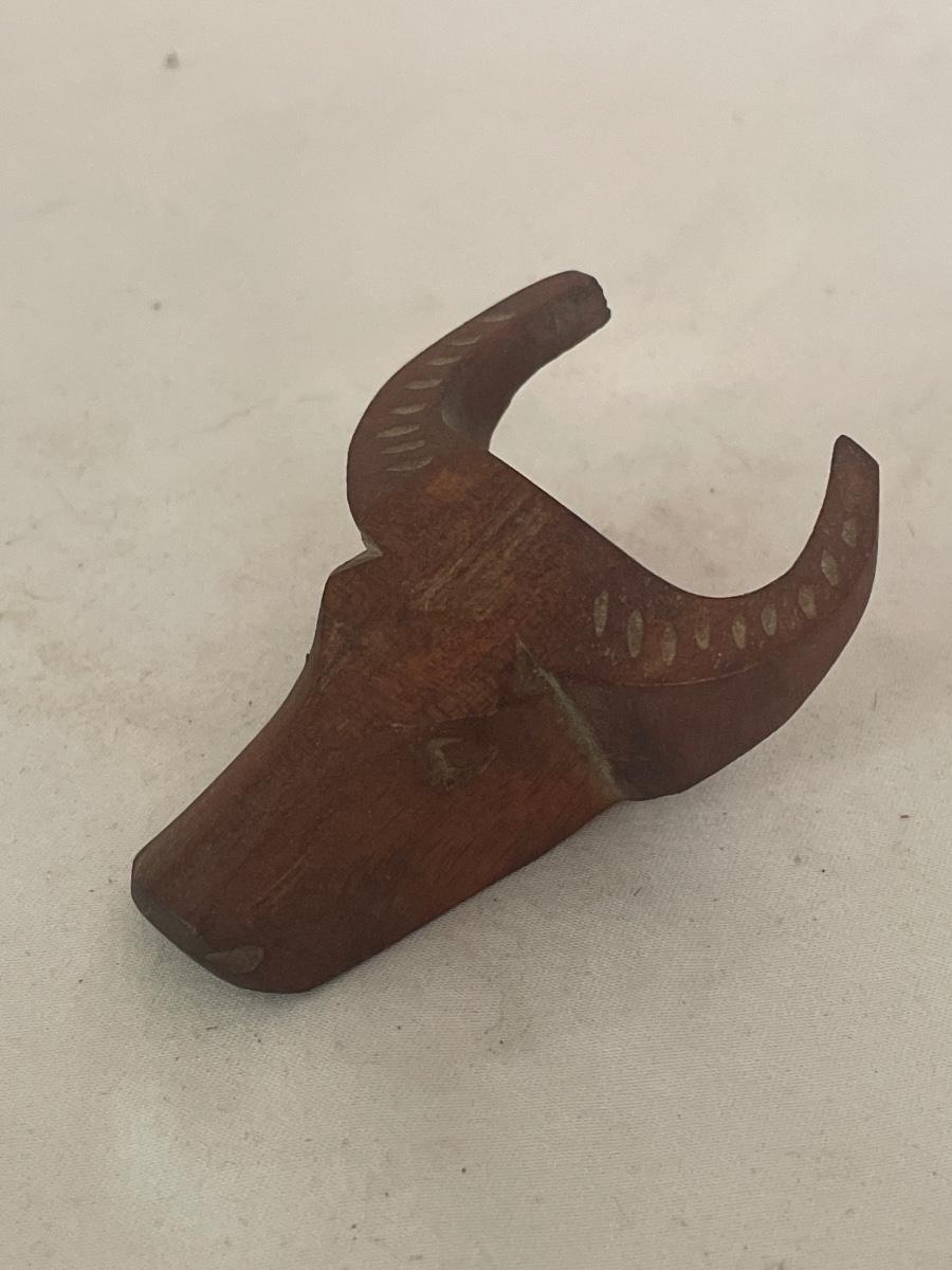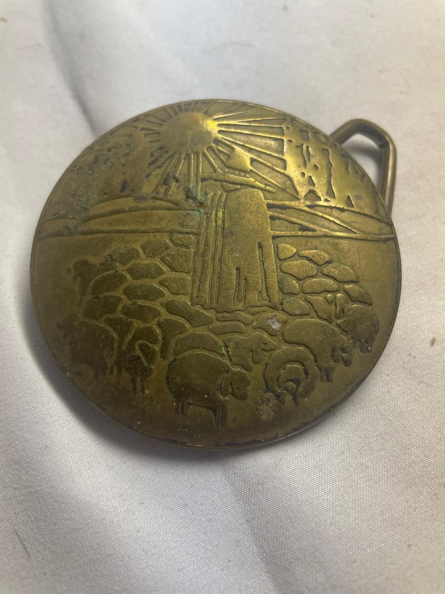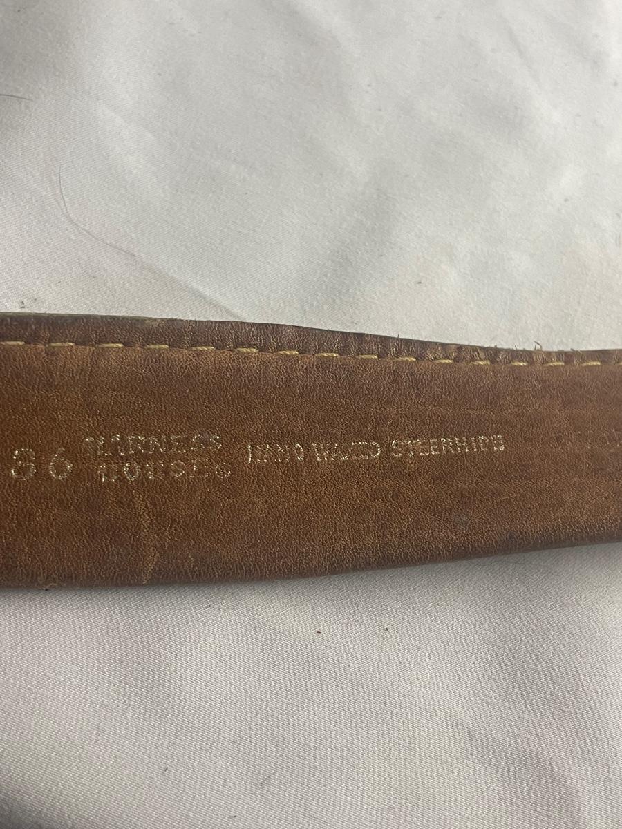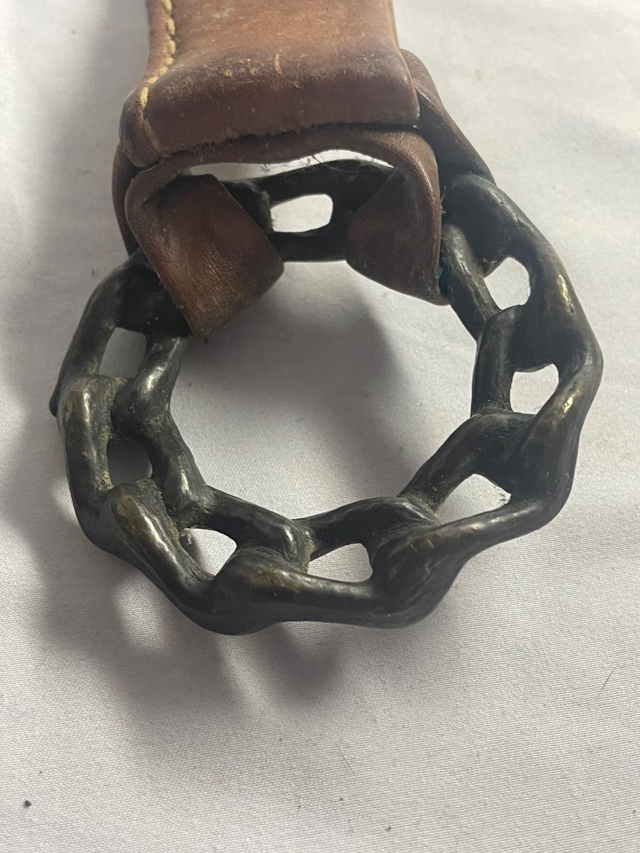 This great assortment of belt buckles includes a sterling buckle, 2 large solid brass buckles, 5 more metal belt buckles and a wood ring in the shape of a steer. The belt is hand waxed steerhide and has a brass colored buckle. All items are in good condition.