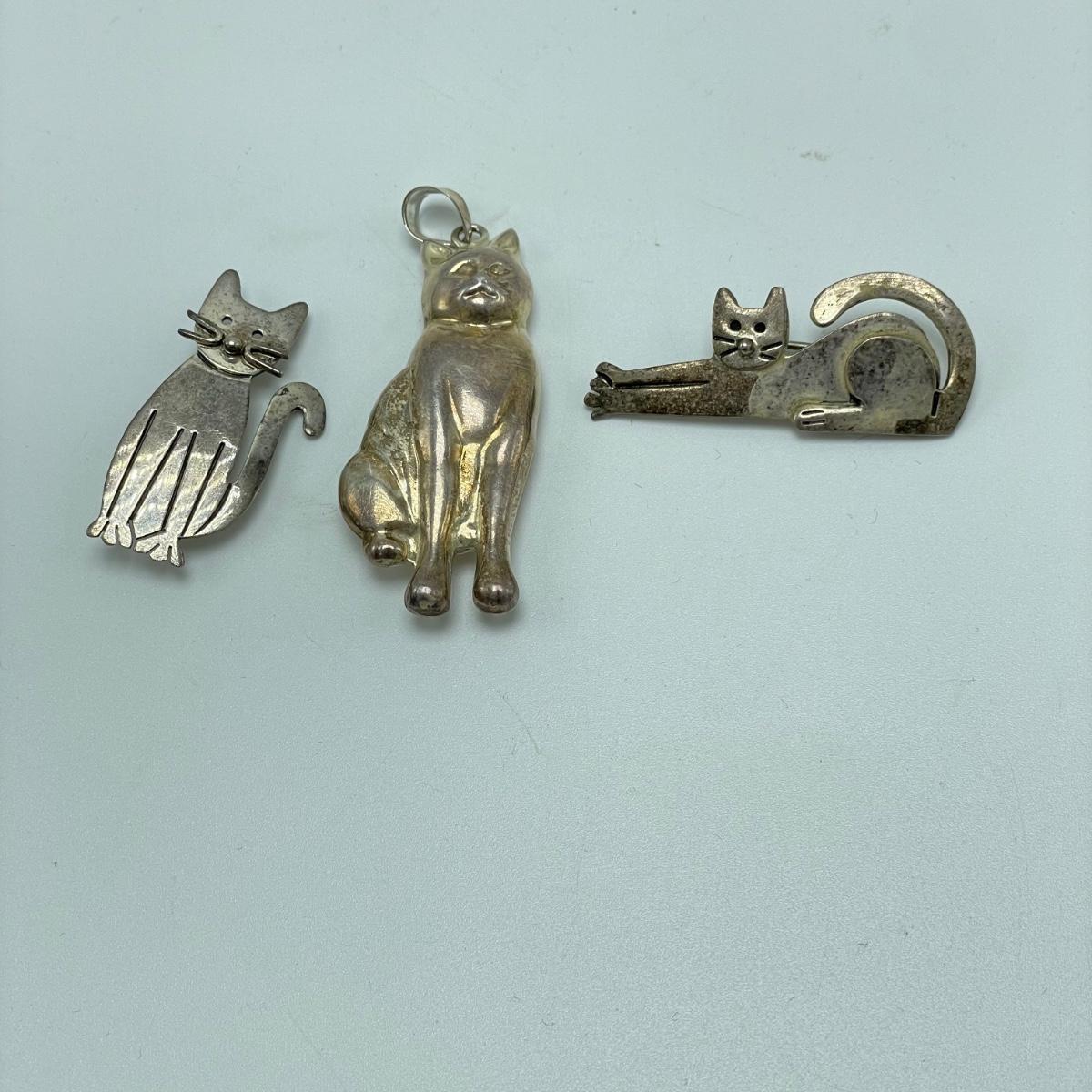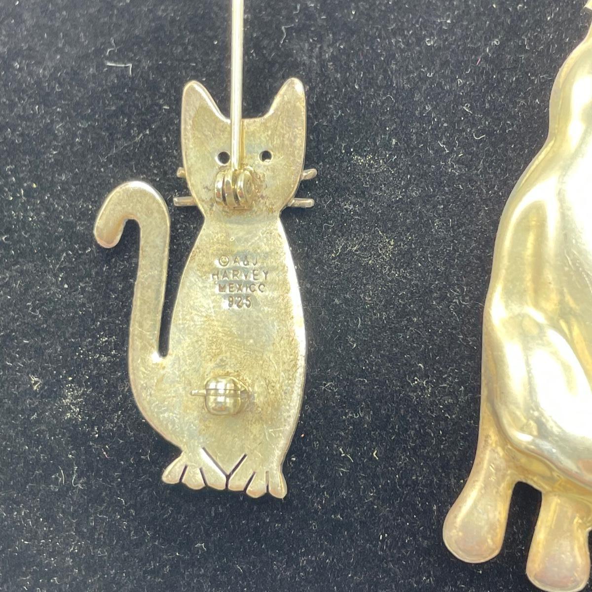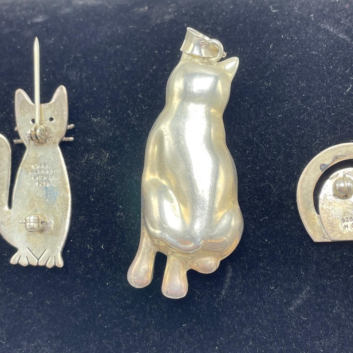 Two kitty brooches and one pendant all with 925 markings. The two brooches are also marked by A&J Harvey, Mexico and they are about 1.5” long. The pendant is only marked 925 and it’s about 1.75” long. See images, some yellow can be seen in photos- this is just a trick of the lighting. All items are silver in color. Shipping available.