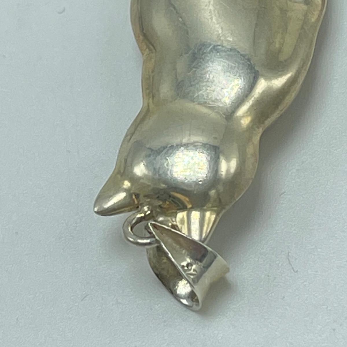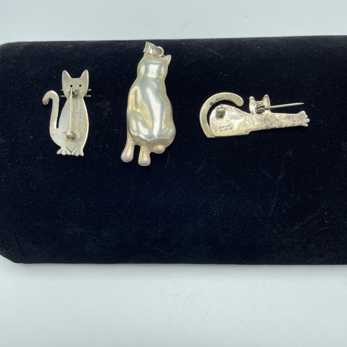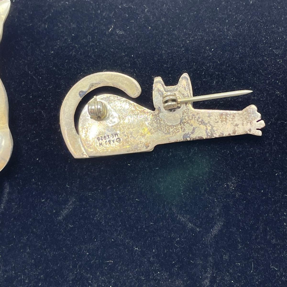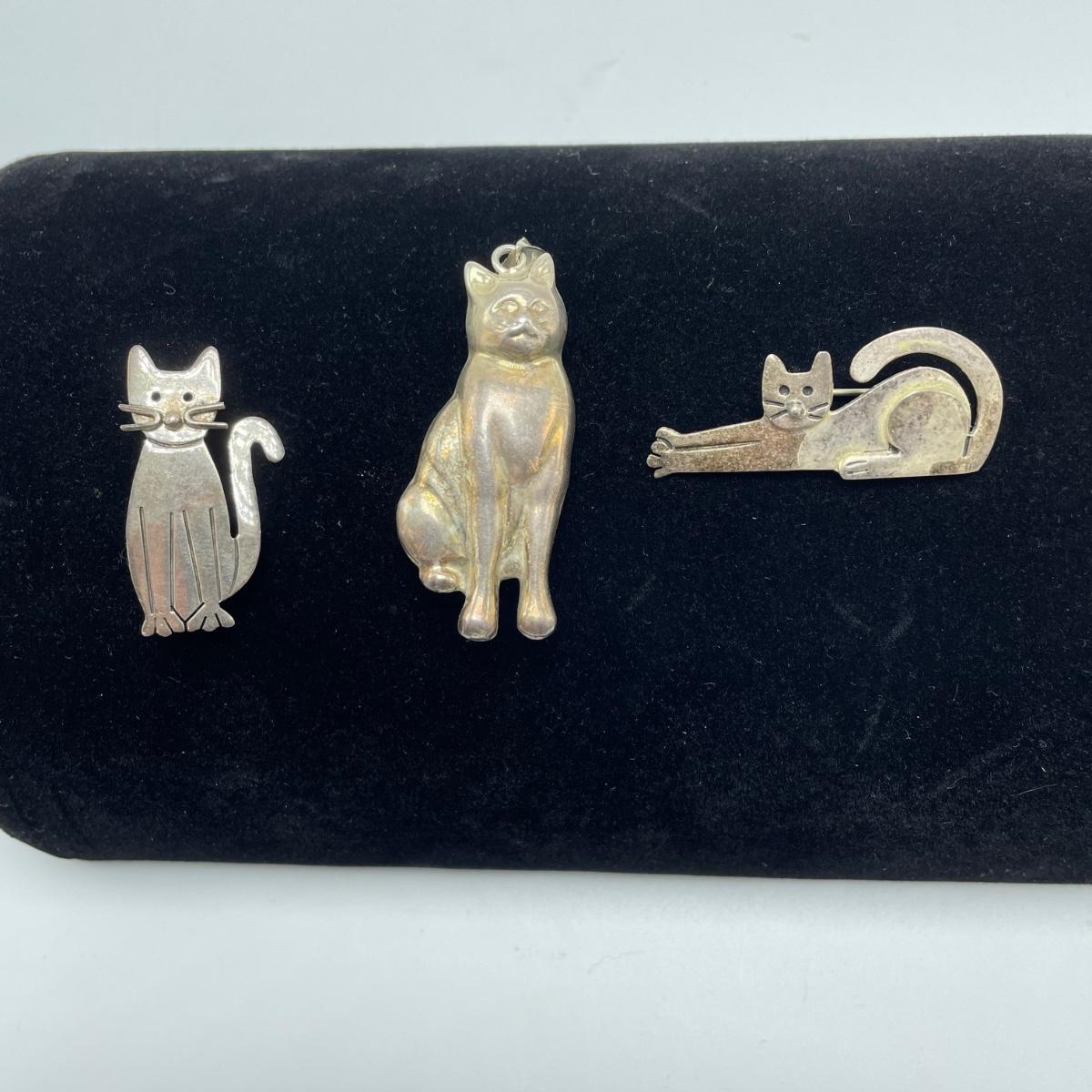 Two kitty brooches and one pendant all with 925 markings. The two brooches are also marked by A&J Harvey, Mexico and they are about 1.5” long. The pendant is only marked 925 and it’s about 1.75” long. See images, some yellow can be seen in photos- this is just a trick of the lighting. All items are silver in color. Shipping available.