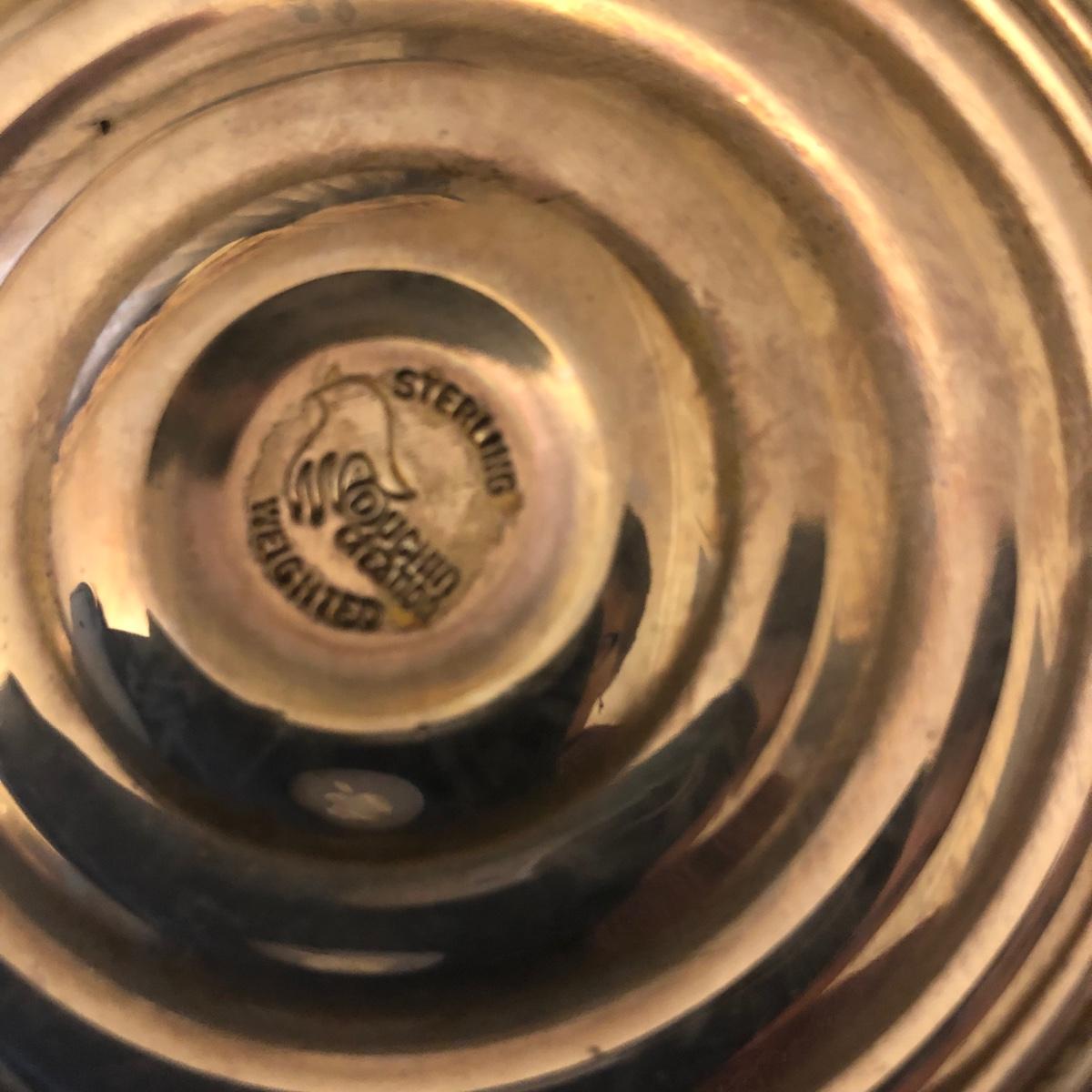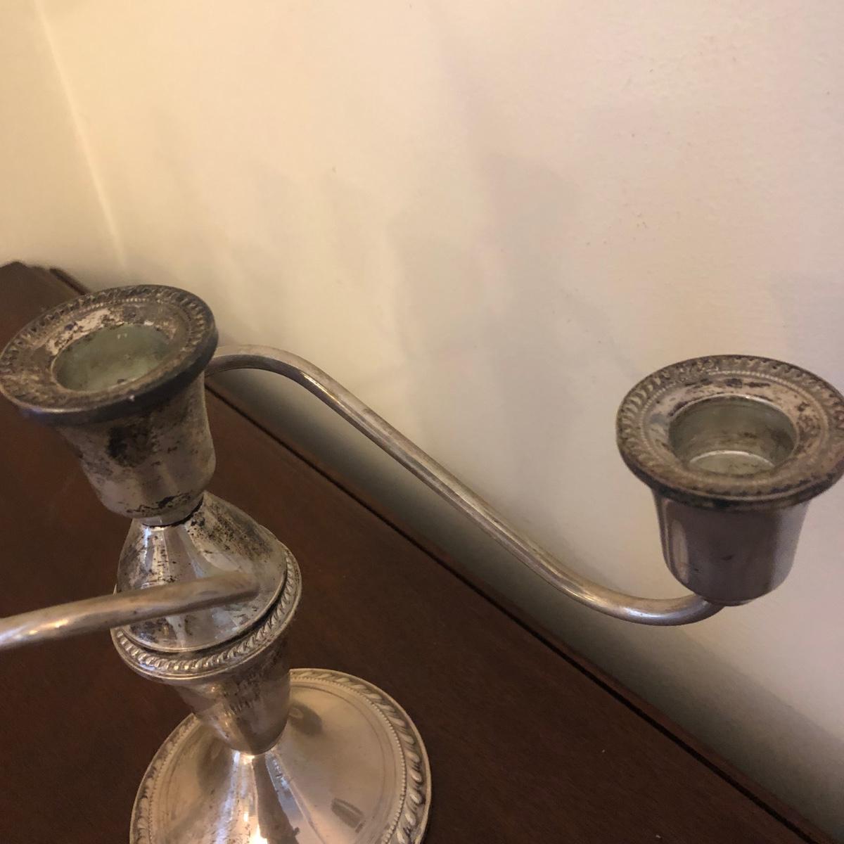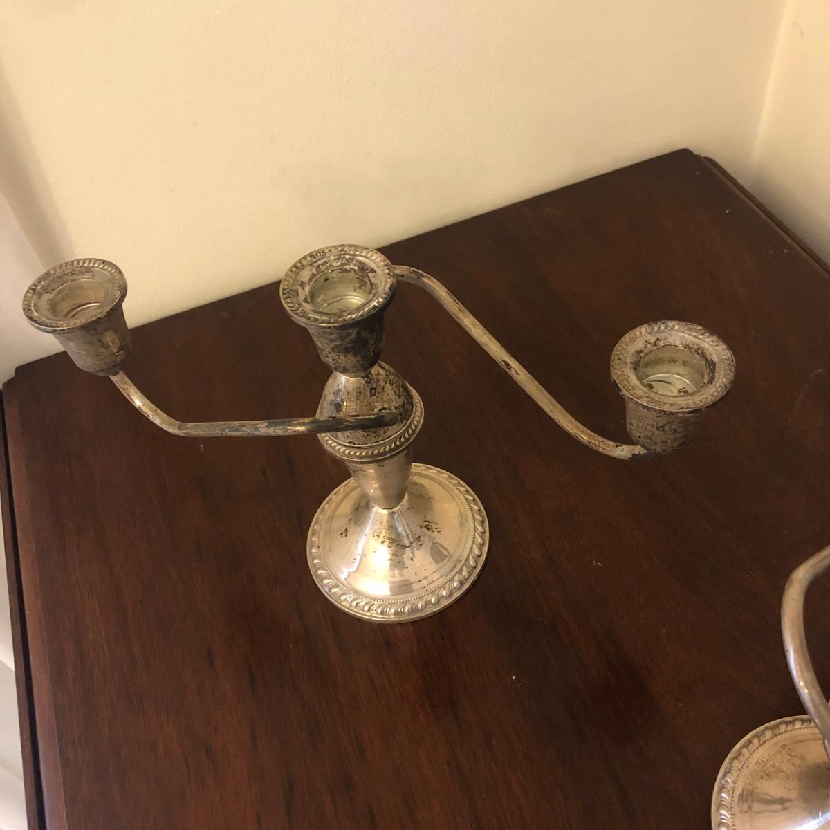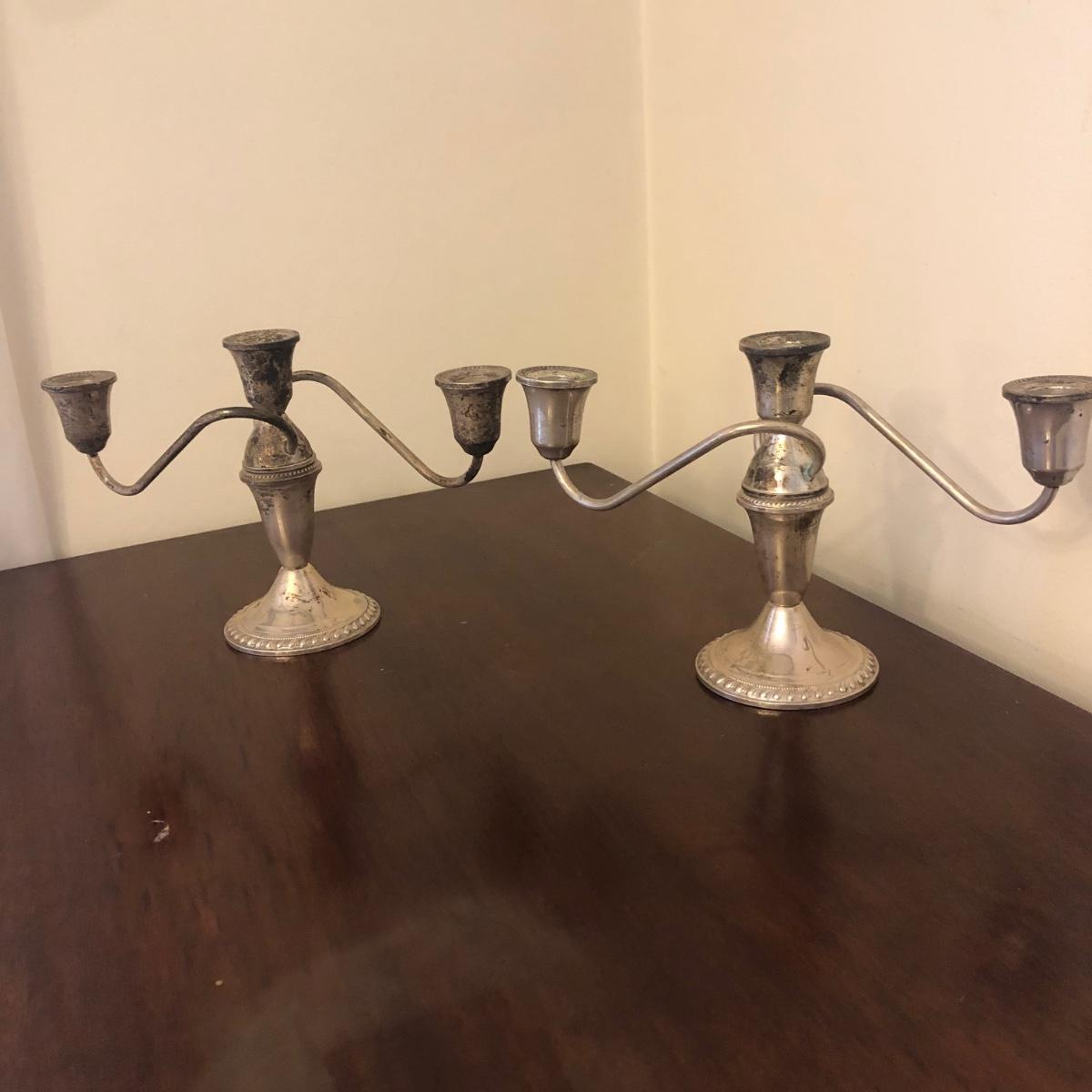 These two candlesticks are marked Sterling Weighted on the bottom. They measure 10.5” x 3.5” x 7”. Shipping Available.
