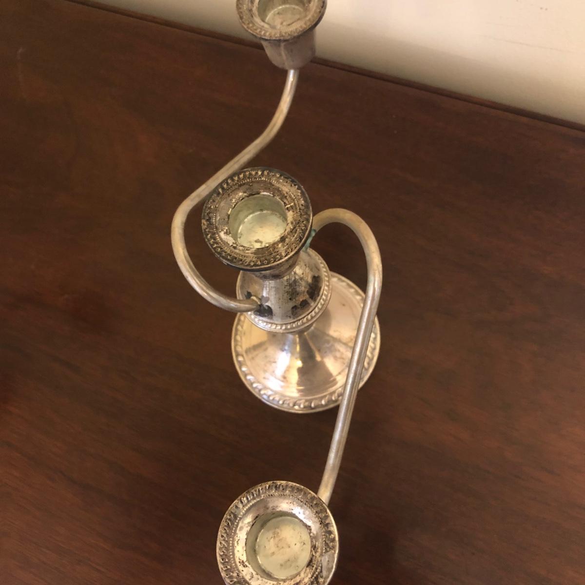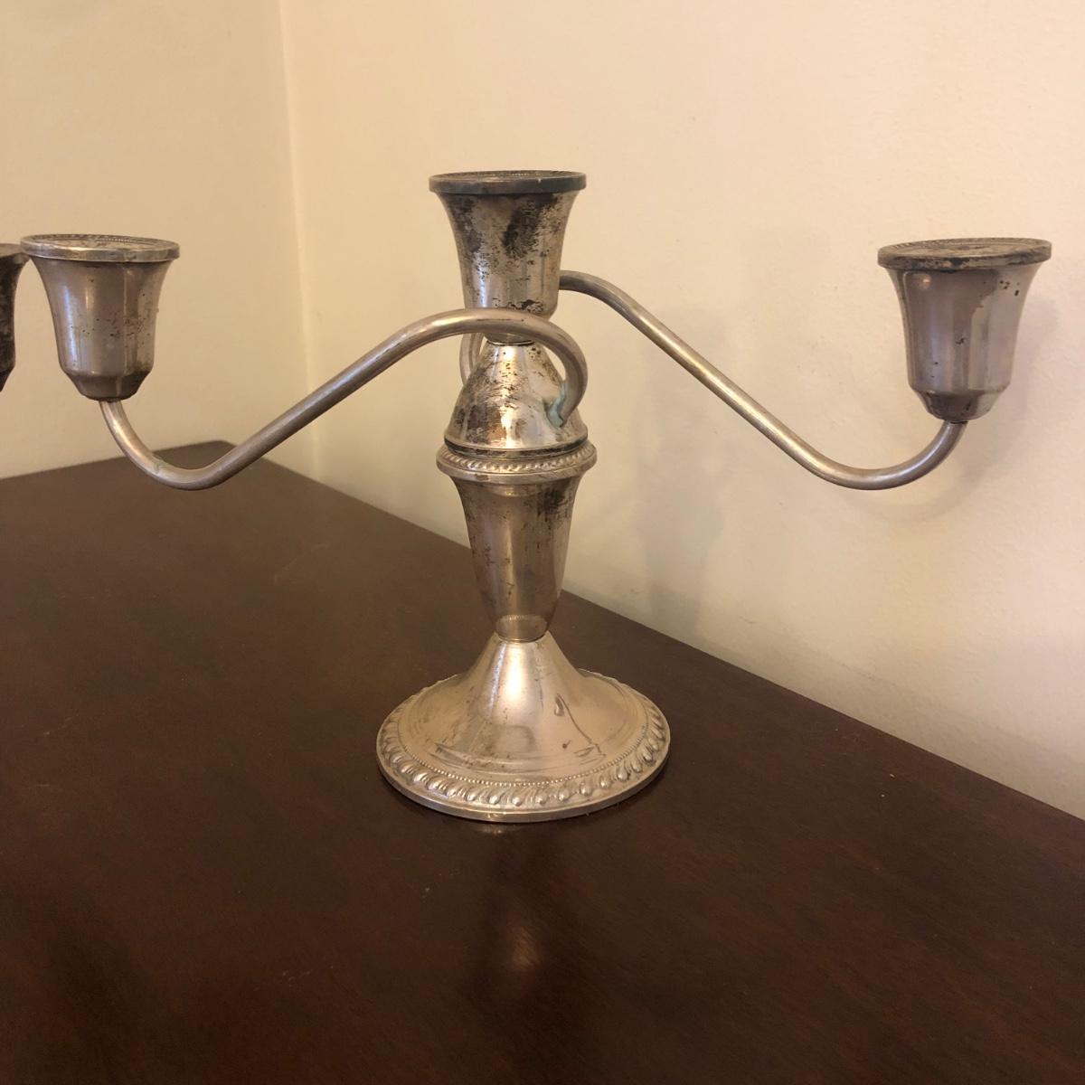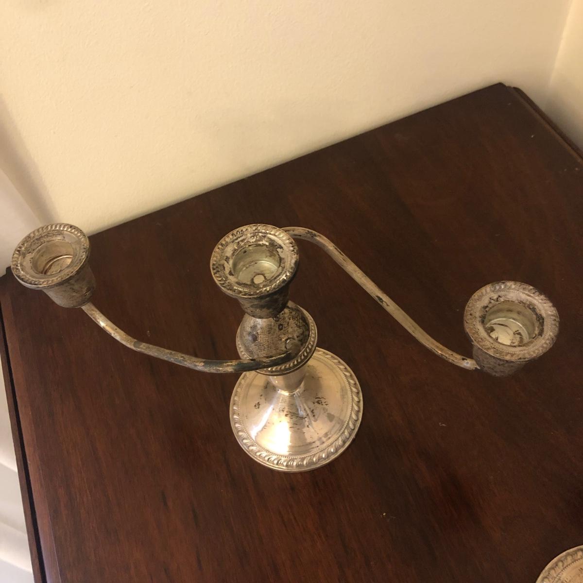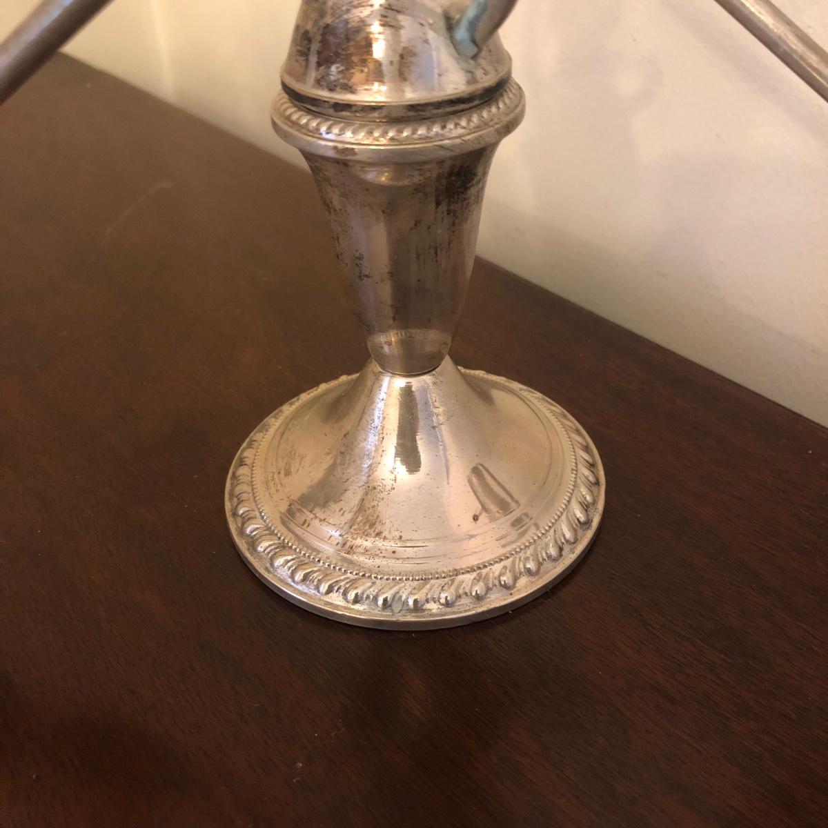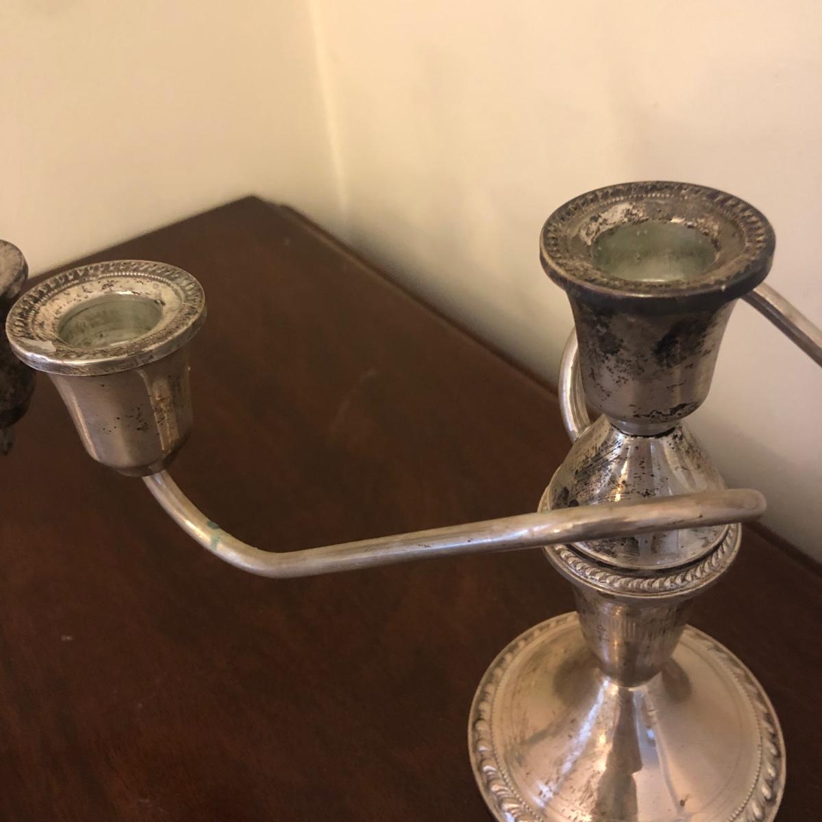 These two candlesticks are marked Sterling Weighted on the bottom. They measure 10.5” x 3.5” x 7”. Shipping Available.
