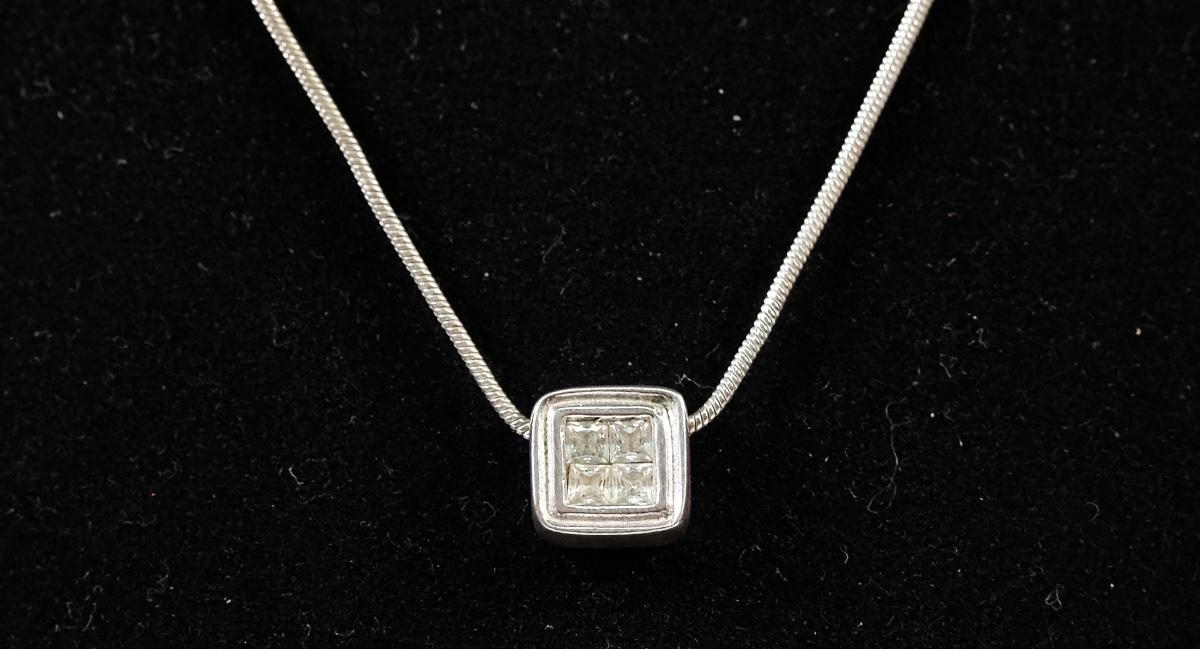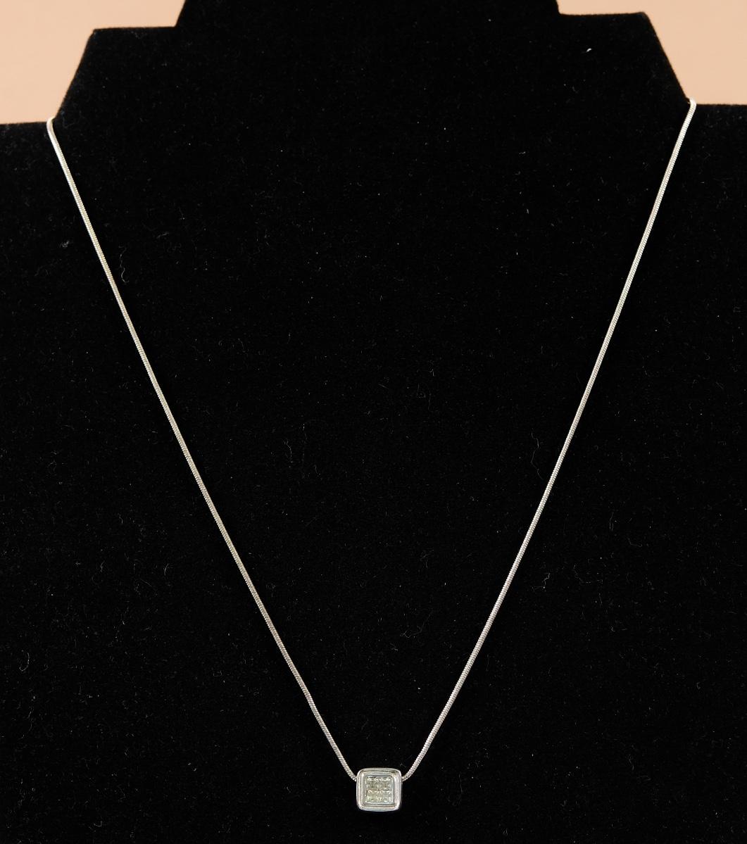 Sterling chain necklace w a square pendant with 4 gemstones. Chain stamped MADE IN ITALY 925, pendant CC 925. Chain measures approx. 18", pendant 5/16". Overall weight approx. 6 grams.