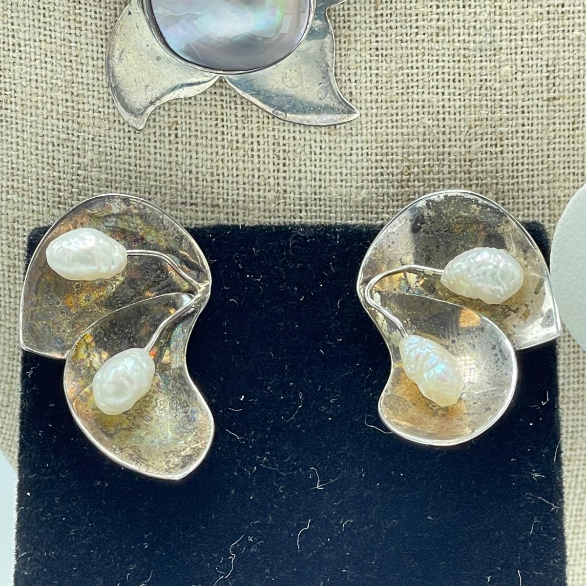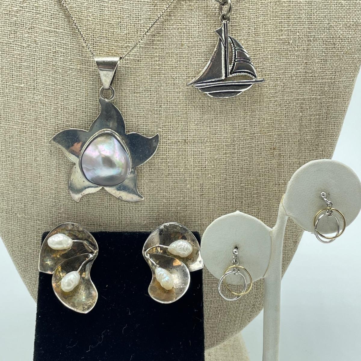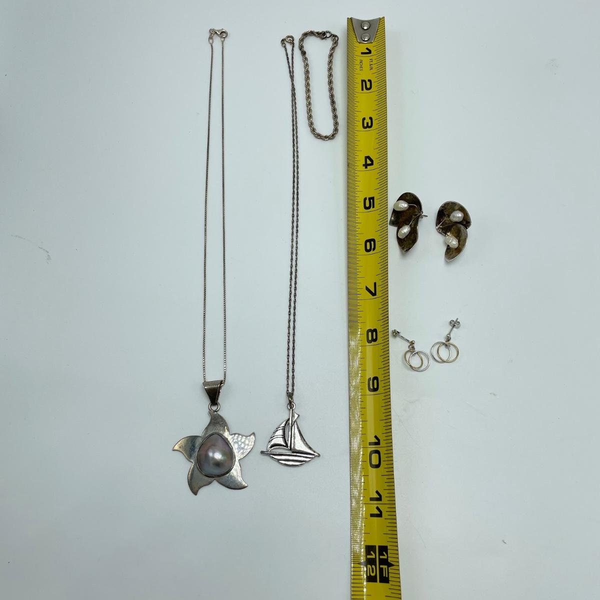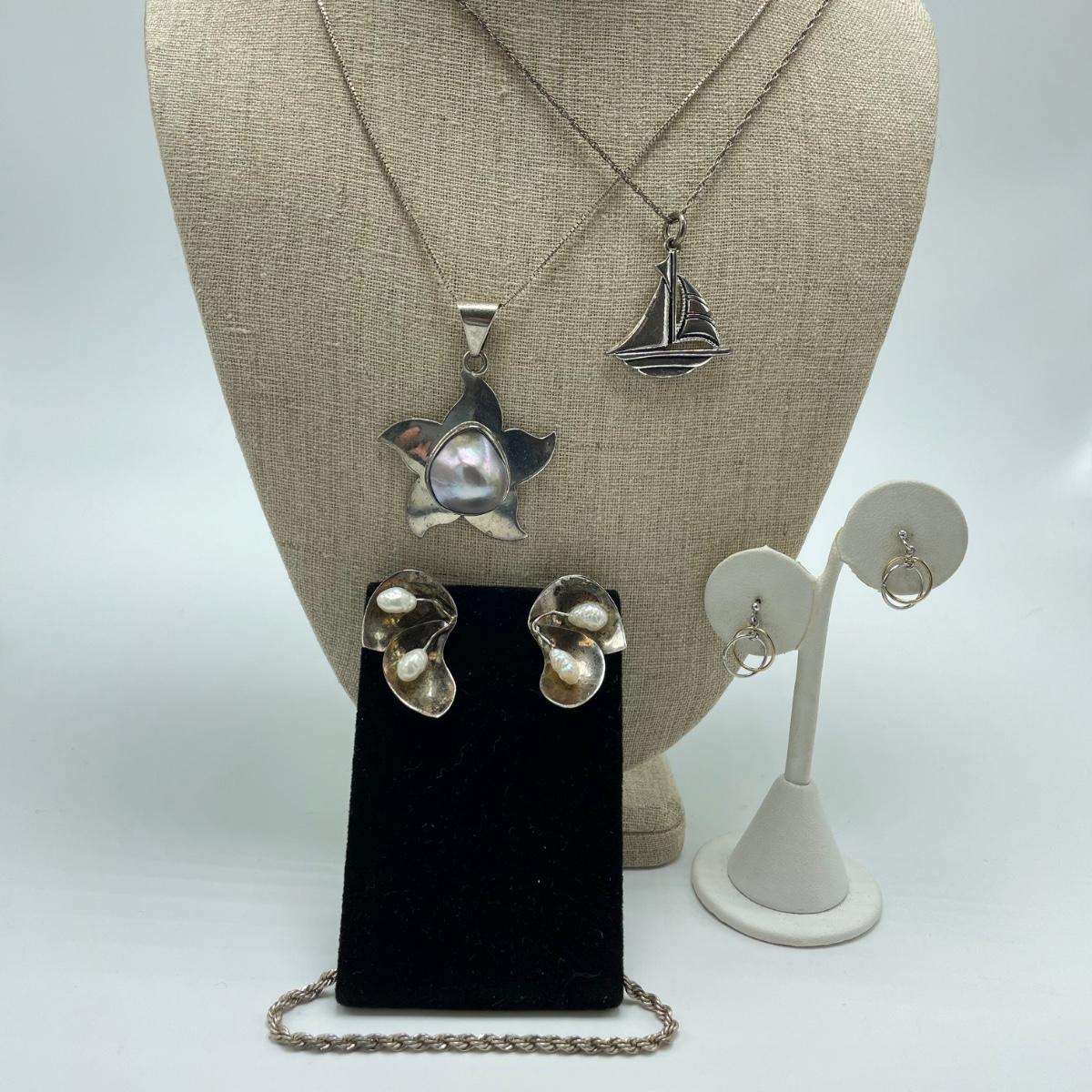 Two necklaces, two pairs of posted earrings plus on chain bracelet. All pieces have Sterling or 925 markings except the sailboat pendant. The floral/sun pendant has an iridescent stone that appears to be a mabe pearl and the larger pair of sterling earrings boast two freshwater pearls each. See images. Shipping available.
