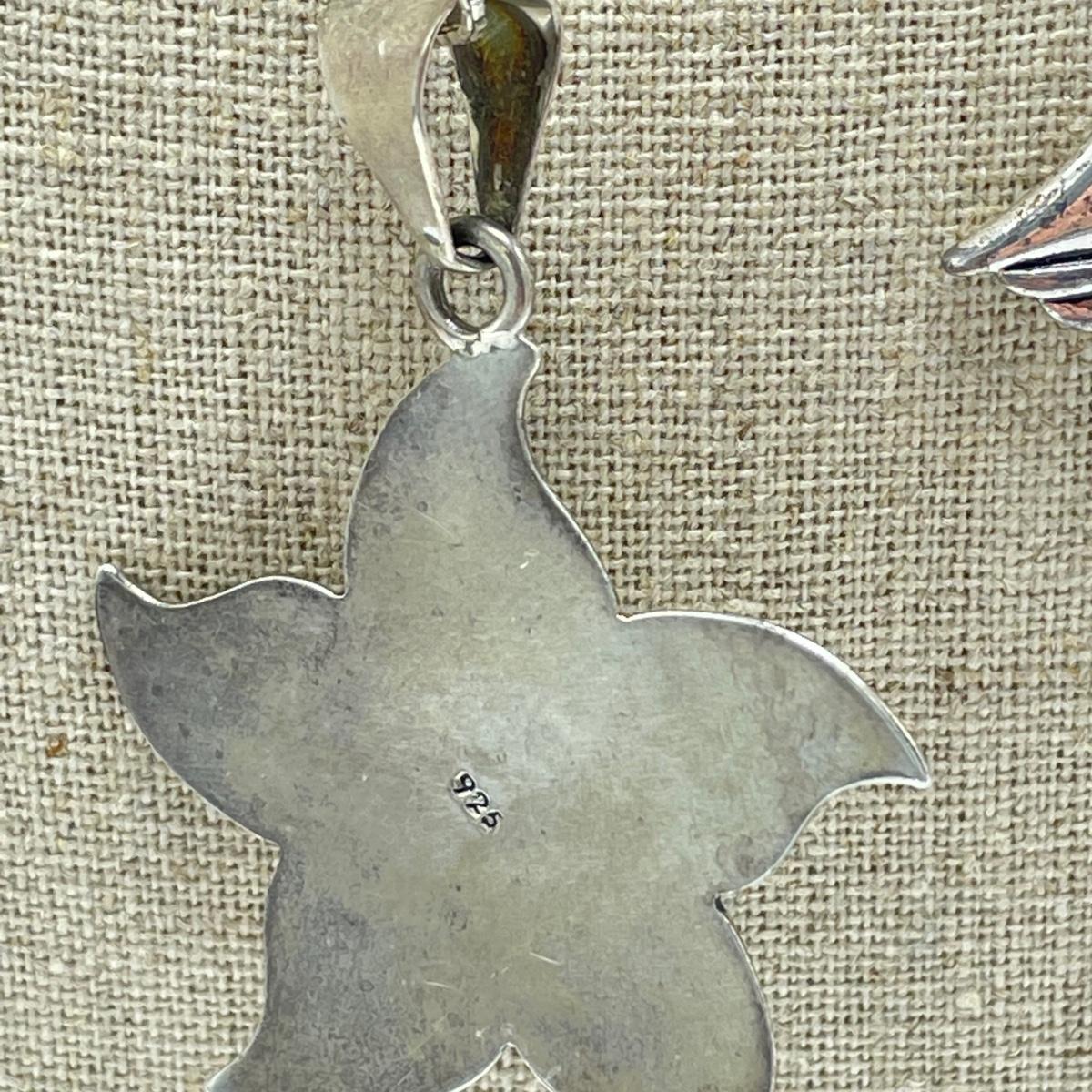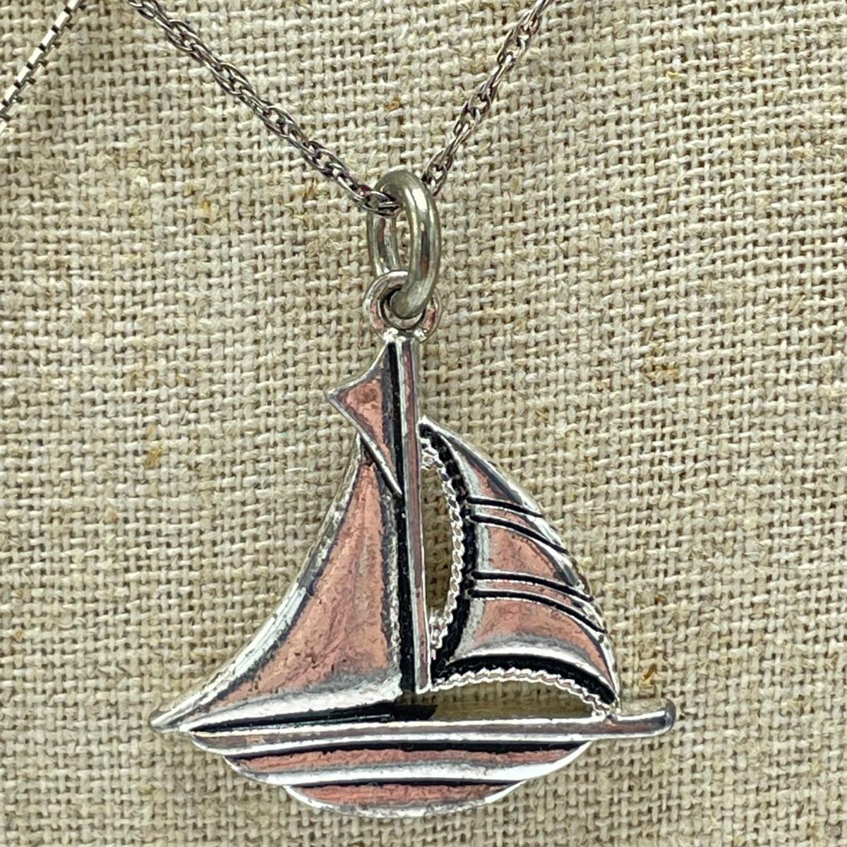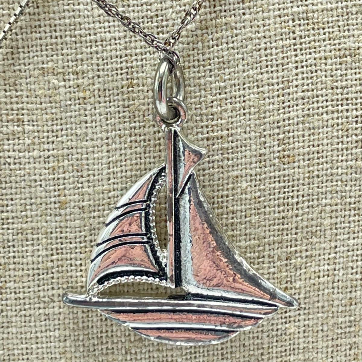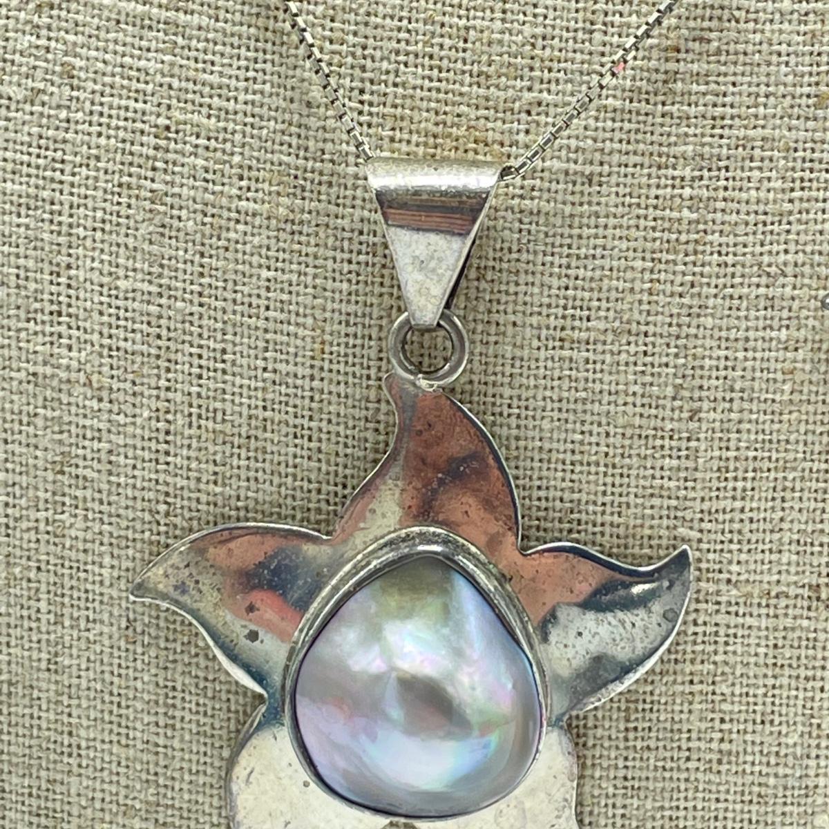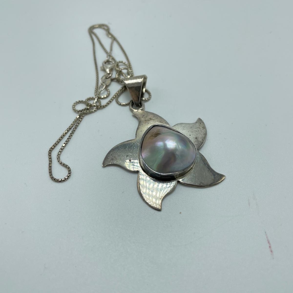 Two necklaces, two pairs of posted earrings plus on chain bracelet. All pieces have Sterling or 925 markings except the sailboat pendant. The floral/sun pendant has an iridescent stone that appears to be a mabe pearl and the larger pair of sterling earrings boast two freshwater pearls each. See images. Shipping available.