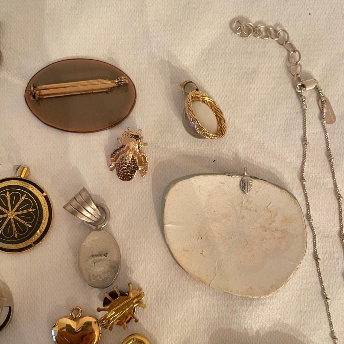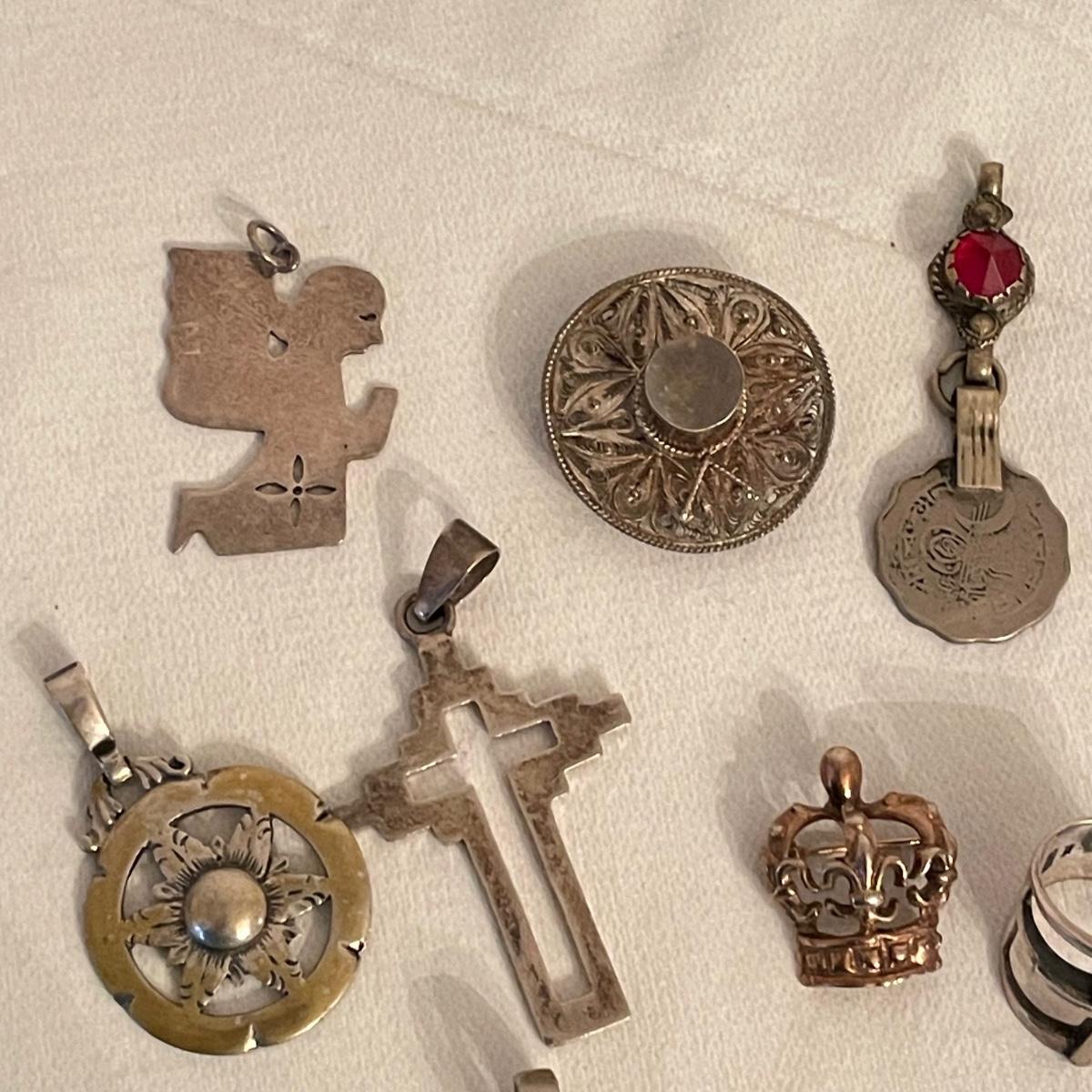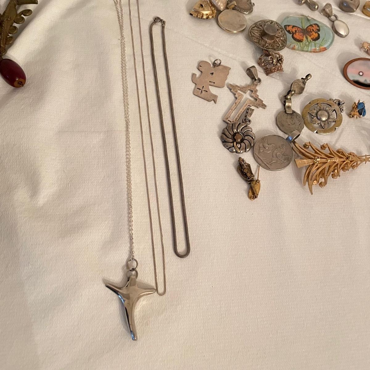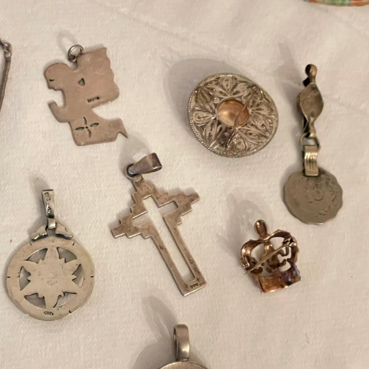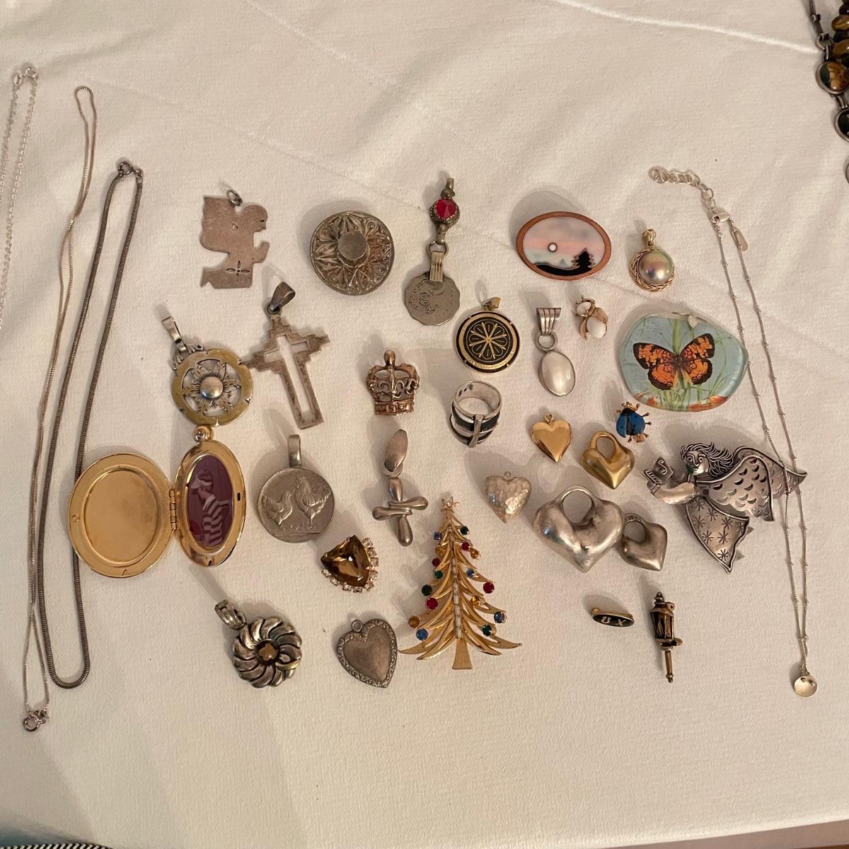 Nice selection of pendants, many marked 925. Lot includes a couple holiday pieces - angels and a gold colored Christmas tree. The larger angel can be used as a pendant, but will need some repairs to be used as a brooch. Three of the four included chains are marked 925. The ring is likely marked 925, but the stamp is illegible. See images. All sales are final. No returns or refunds. Please bid accordingly. Shipping available.