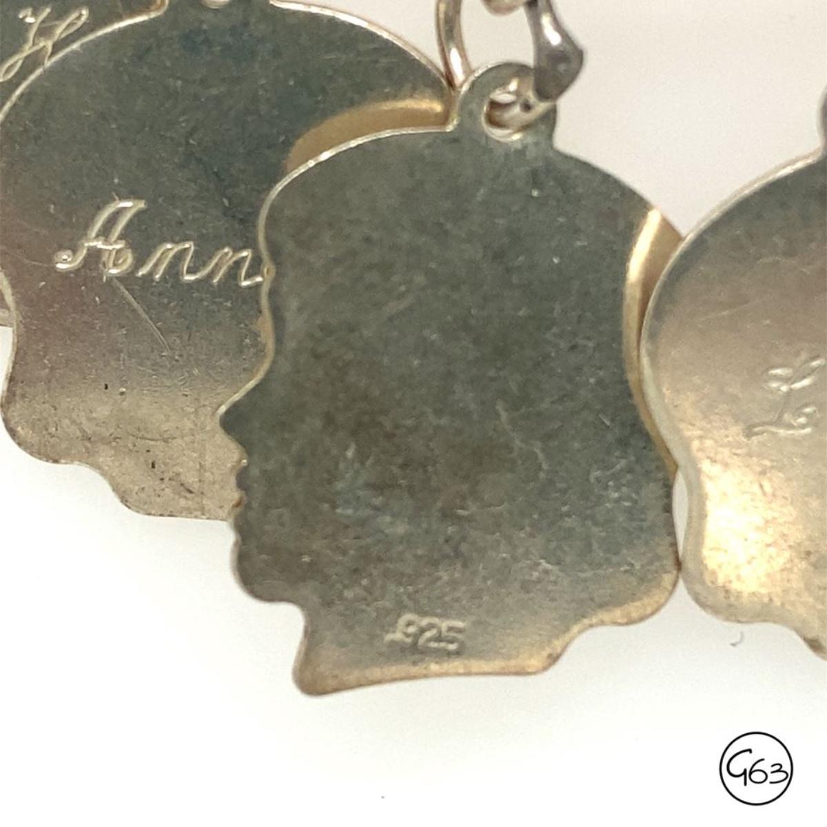 Chain & charms stamped 925. 13 charms total. Names include: Diane, Judy W., Becky, Pat K., Annelle, Wanda, Louise, Nancy, Judy C.,Patsy, Linda, Bonnie & Sharan. Measures approx. 7", charms measures approx. 3/4". Weighs approx. 29.2g