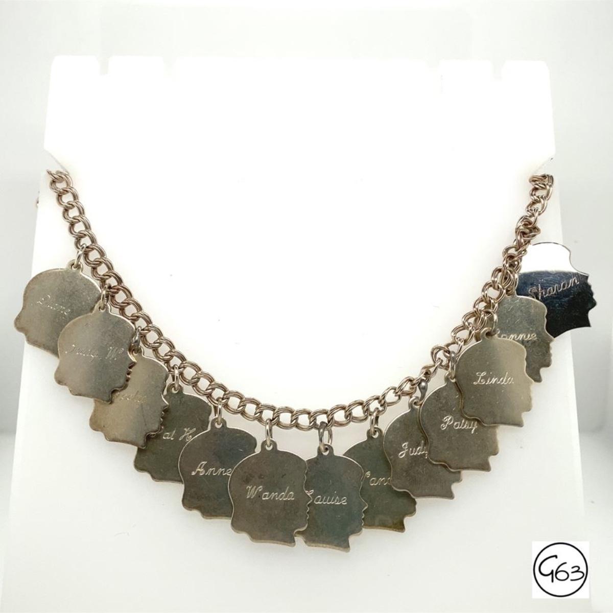 Chain & charms stamped 925. 13 charms total. Names include: Diane, Judy W., Becky, Pat K., Annelle, Wanda, Louise, Nancy, Judy C.,Patsy, Linda, Bonnie & Sharan. Measures approx. 7", charms measures approx. 3/4". Weighs approx. 29.2g