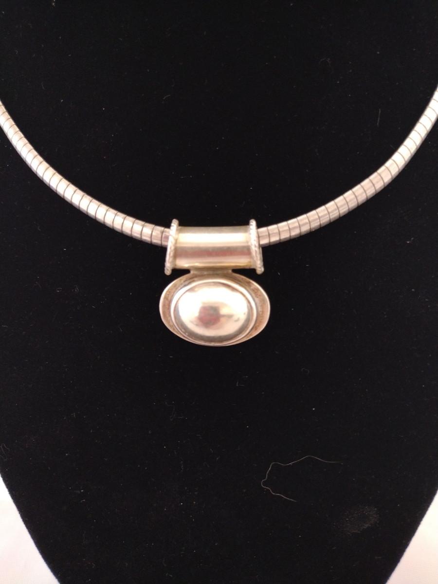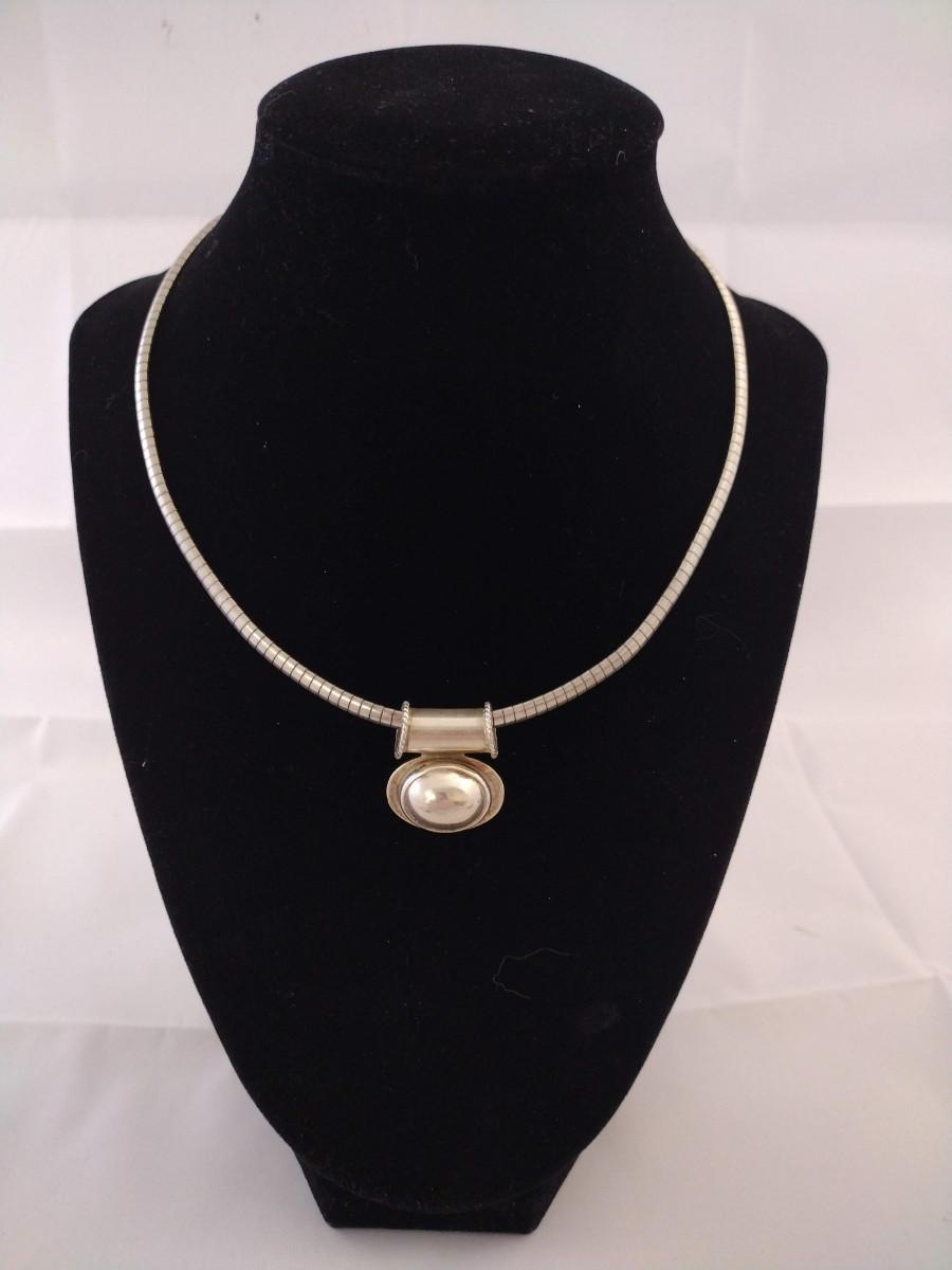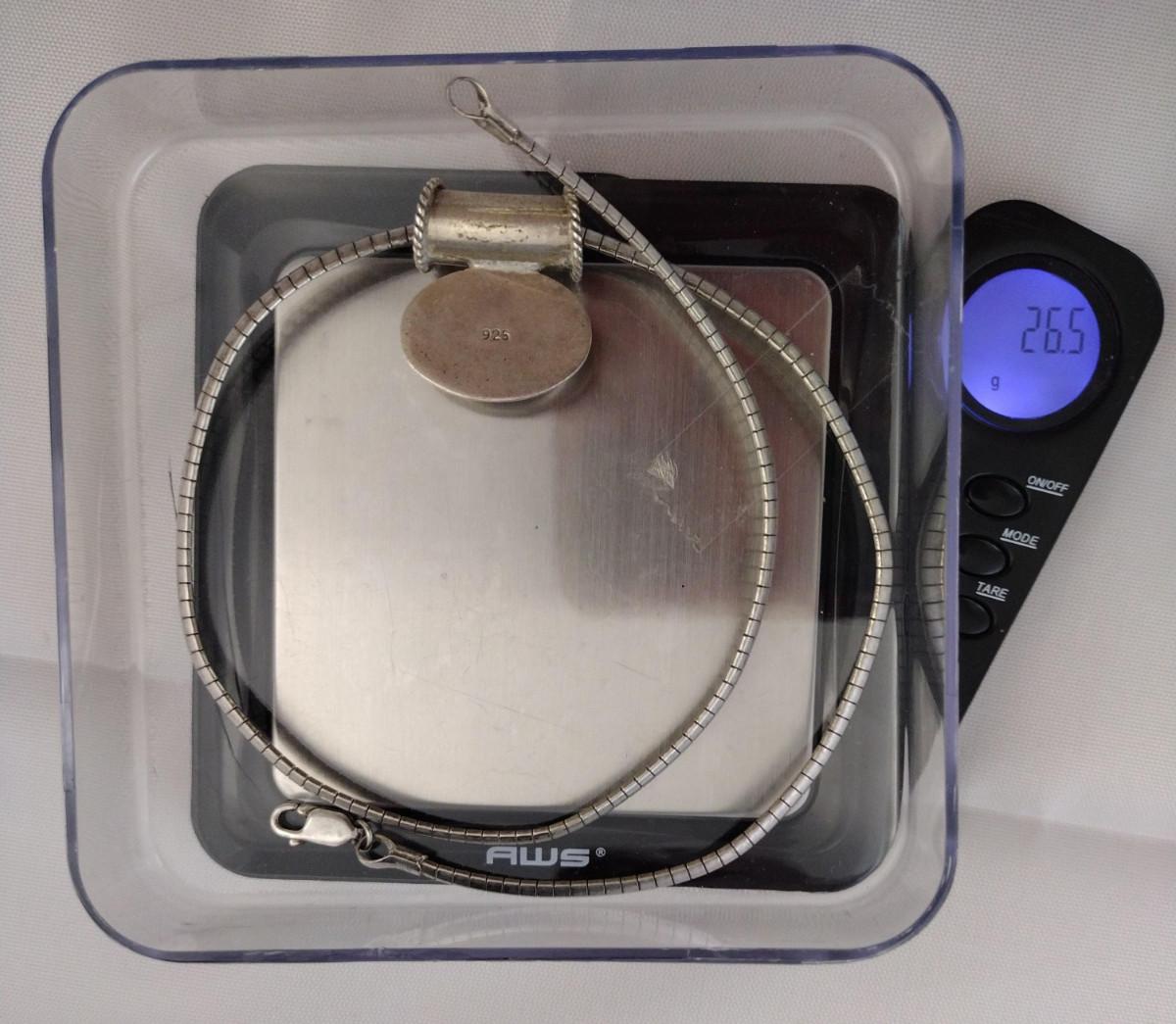 Both pieces are marked 925 and Kim Korea. Choker is 15.5 inches, pendant is 1 inch by 1 inch. Total weight is 26.5 grams