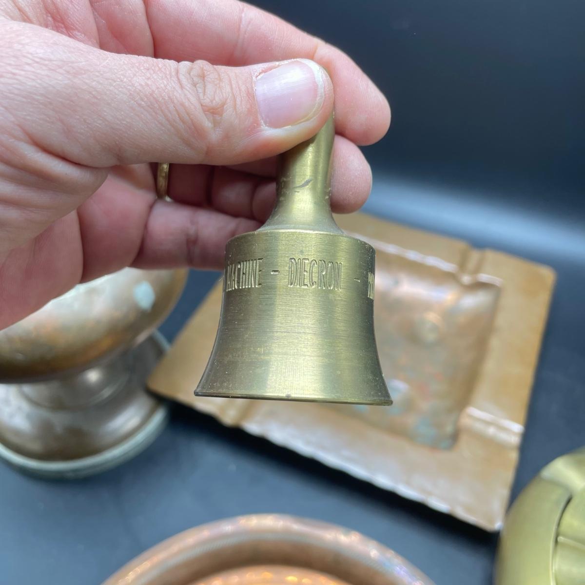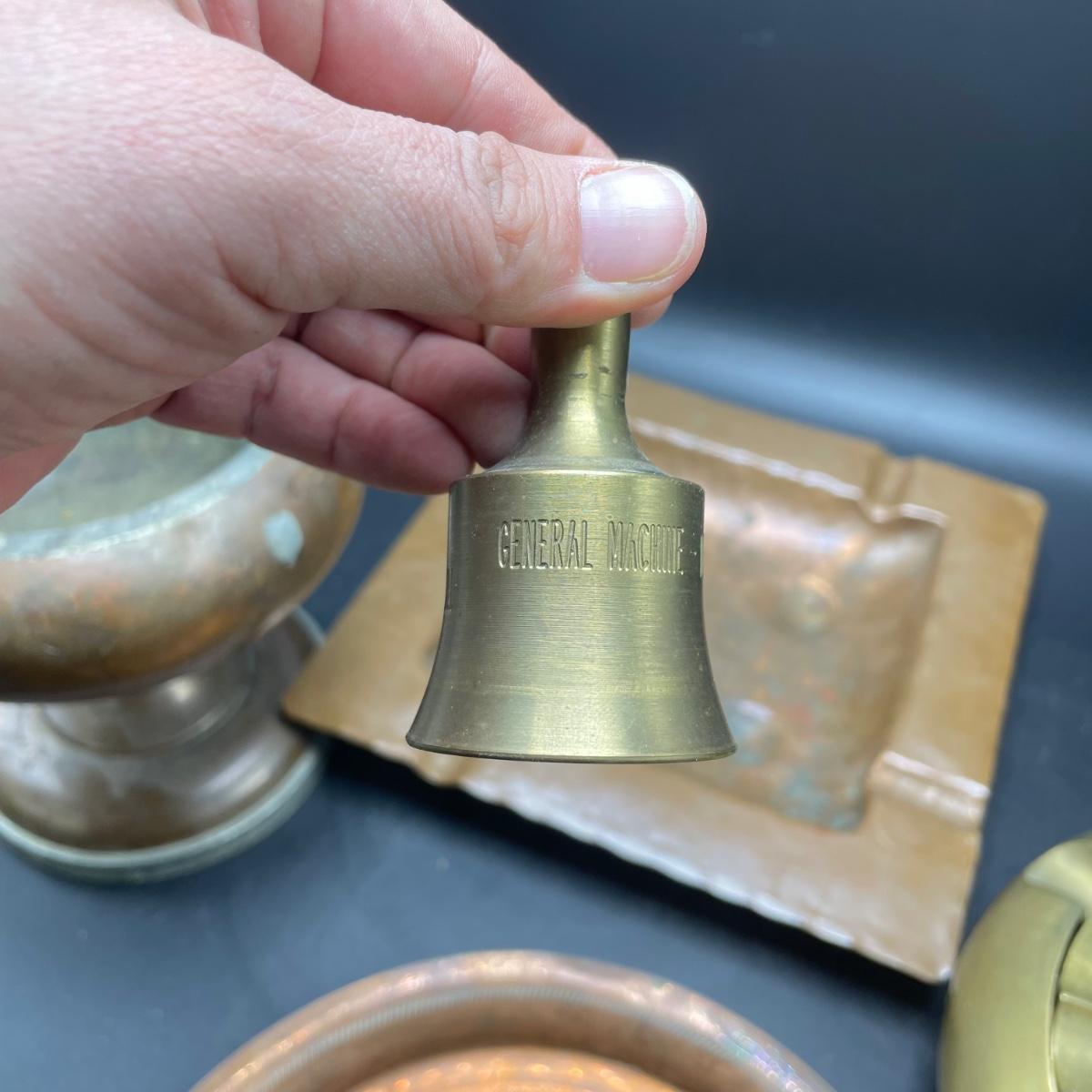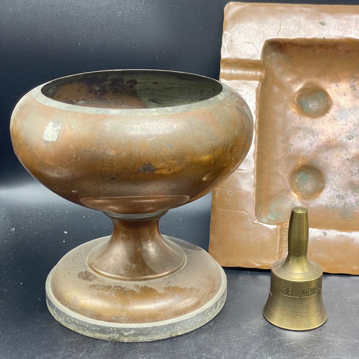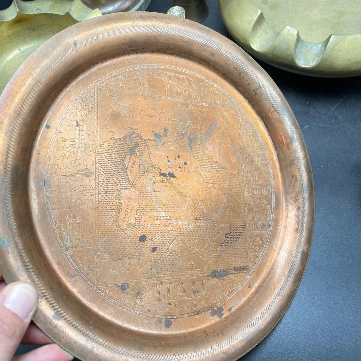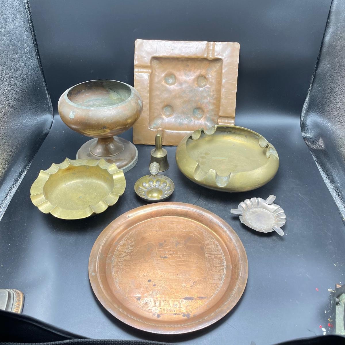 Six ashtrays, one small one, 3.5”d is marked Sterling. The largest copper ashtray is 9” x 9”. Lot also features a copper urn, an Italian map plate dates 1944-5 and a brass bell. See images. Shipping available.
