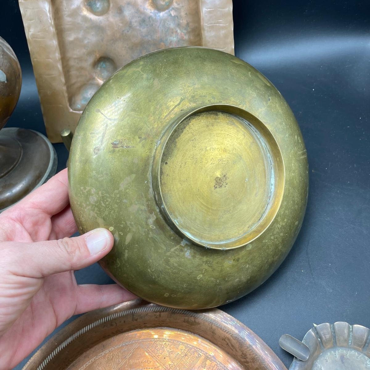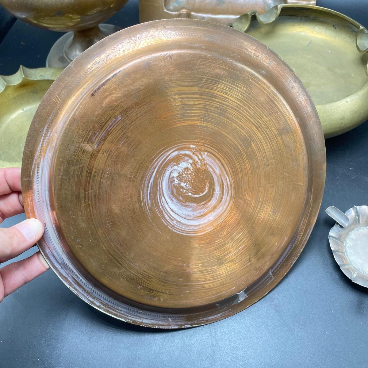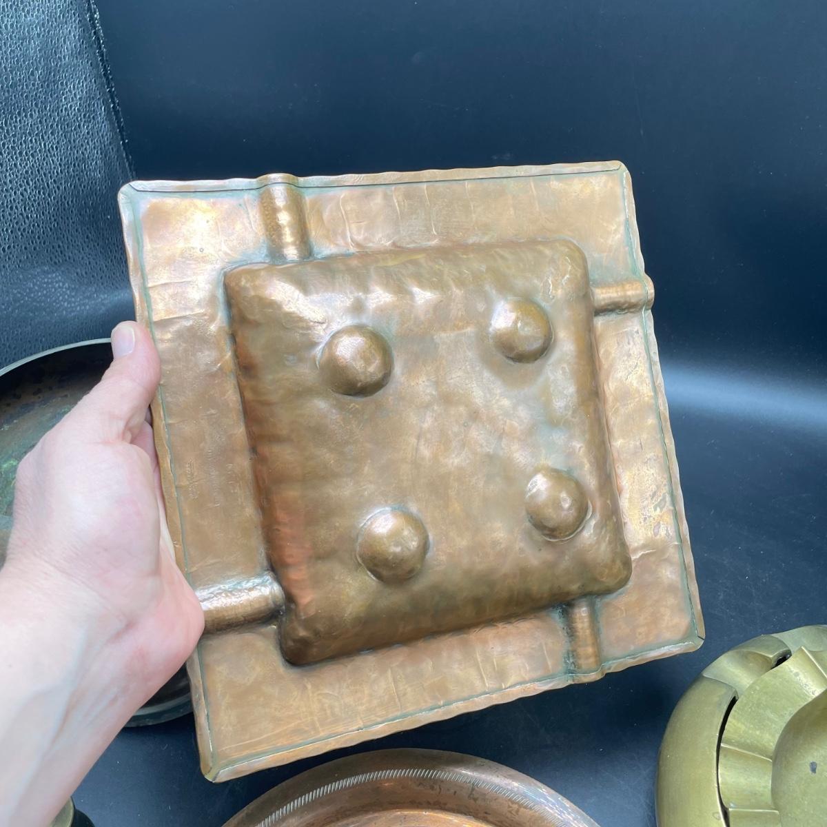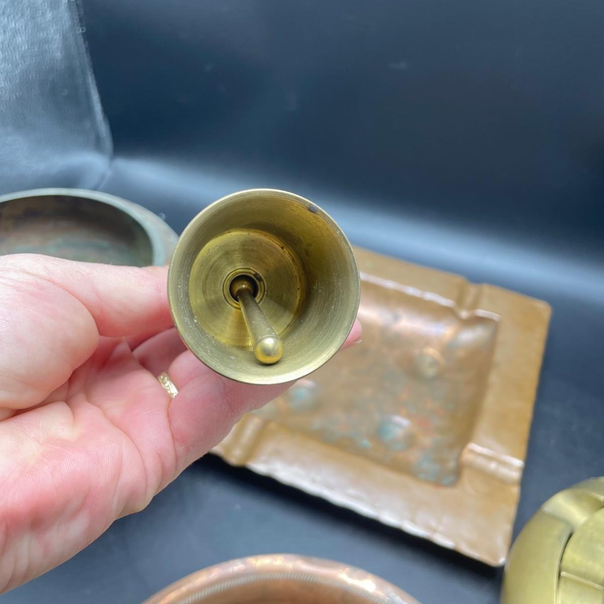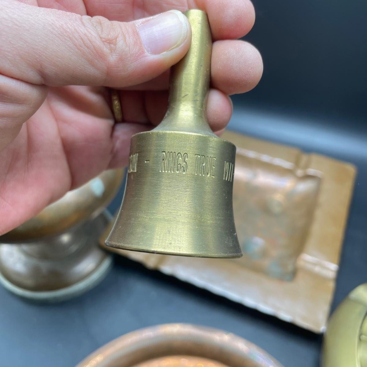 Six ashtrays, one small one, 3.5”d is marked Sterling. The largest copper ashtray is 9” x 9”. Lot also features a copper urn, an Italian map plate dates 1944-5 and a brass bell. See images. Shipping available.