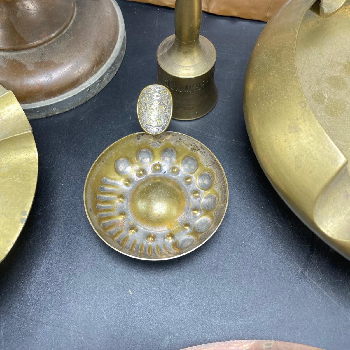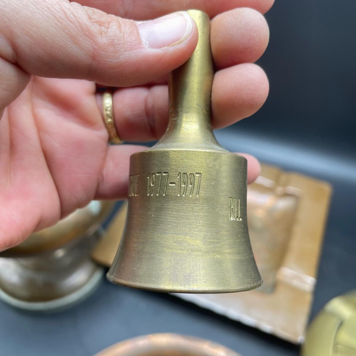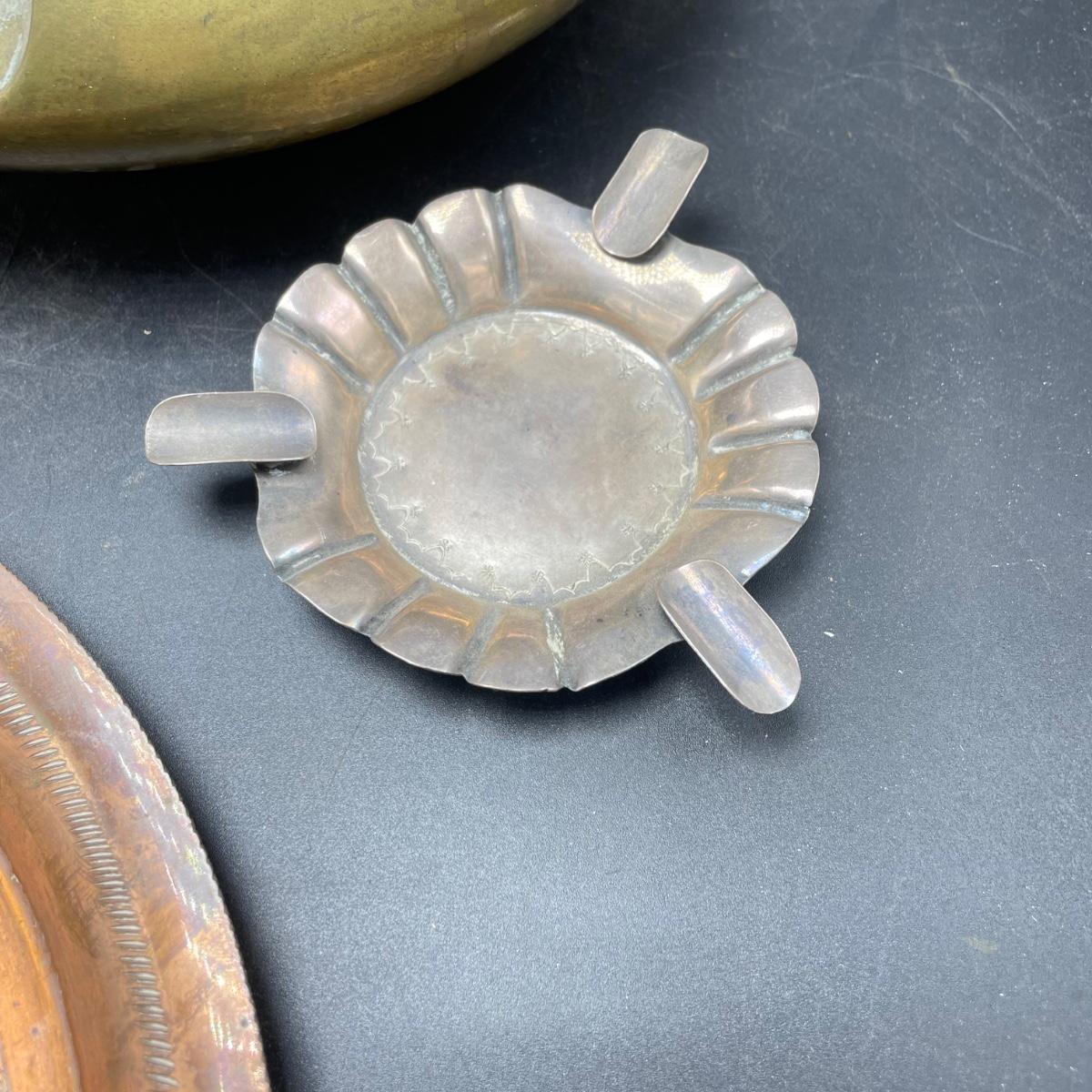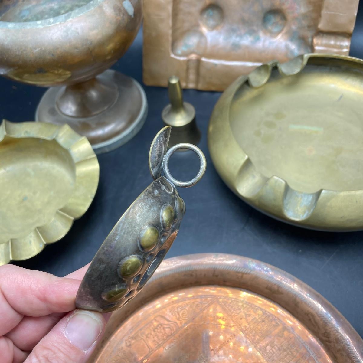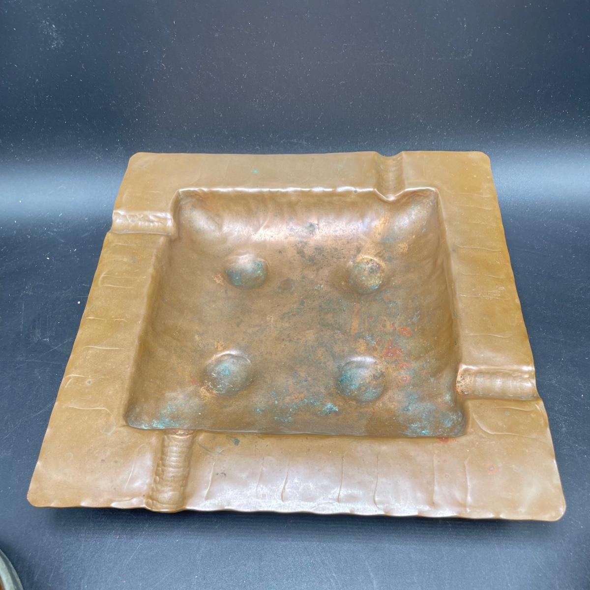 Six ashtrays, one small one, 3.5”d is marked Sterling. The largest copper ashtray is 9” x 9”. Lot also features a copper urn, an Italian map plate dates 1944-5 and a brass bell. See images. Shipping available.