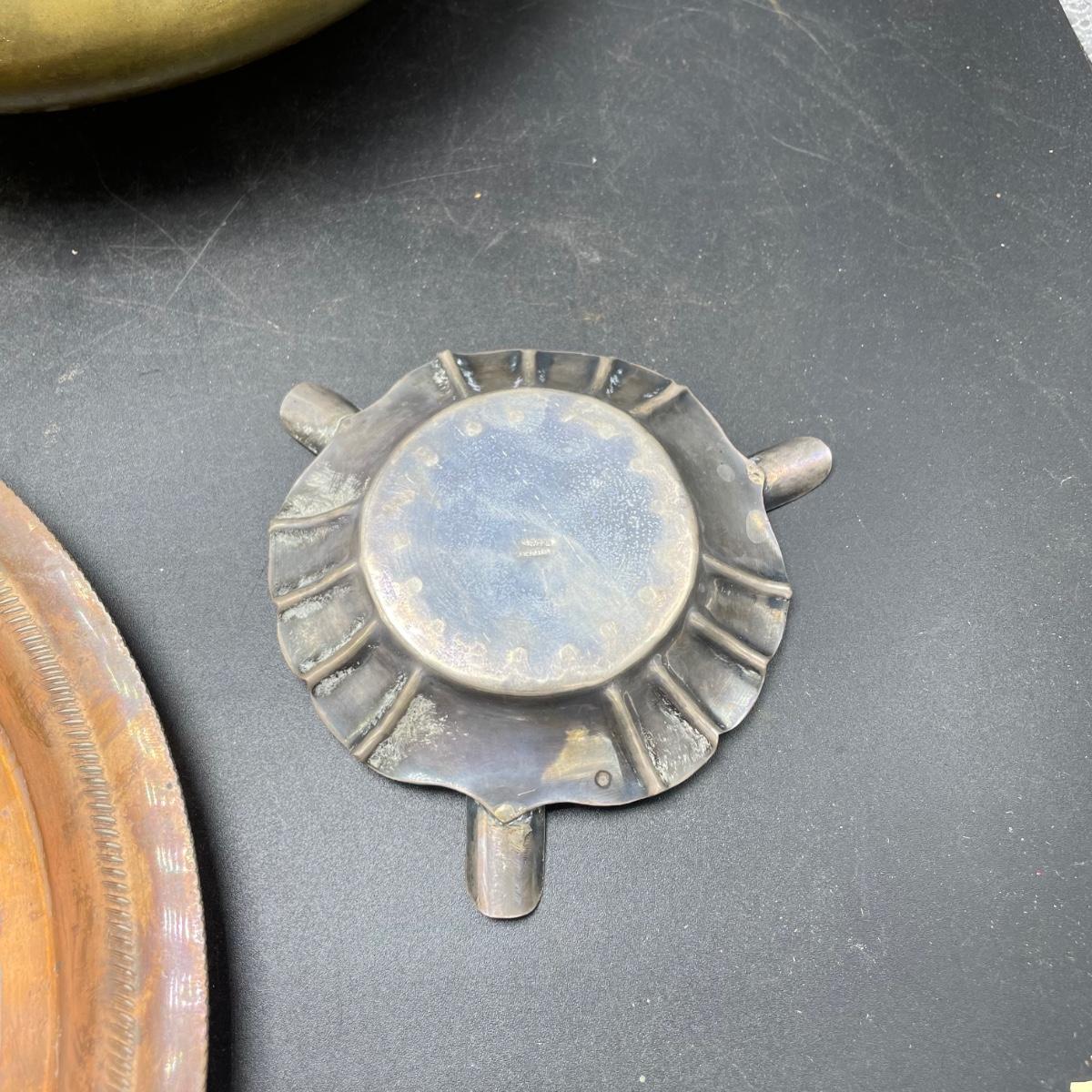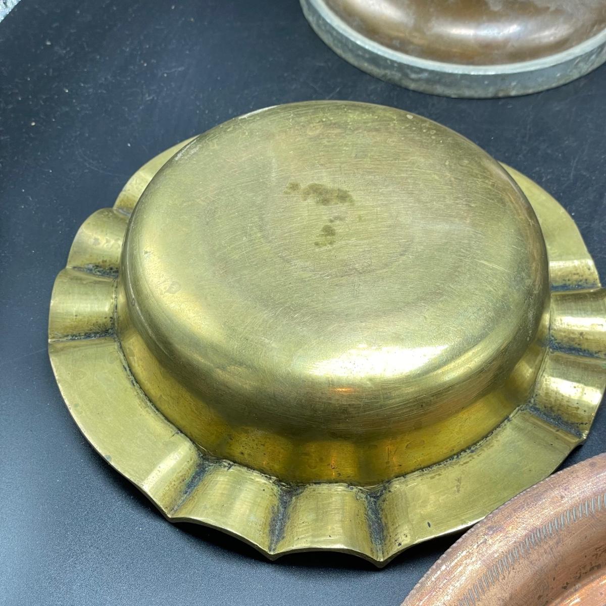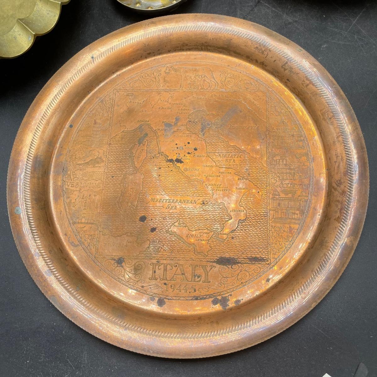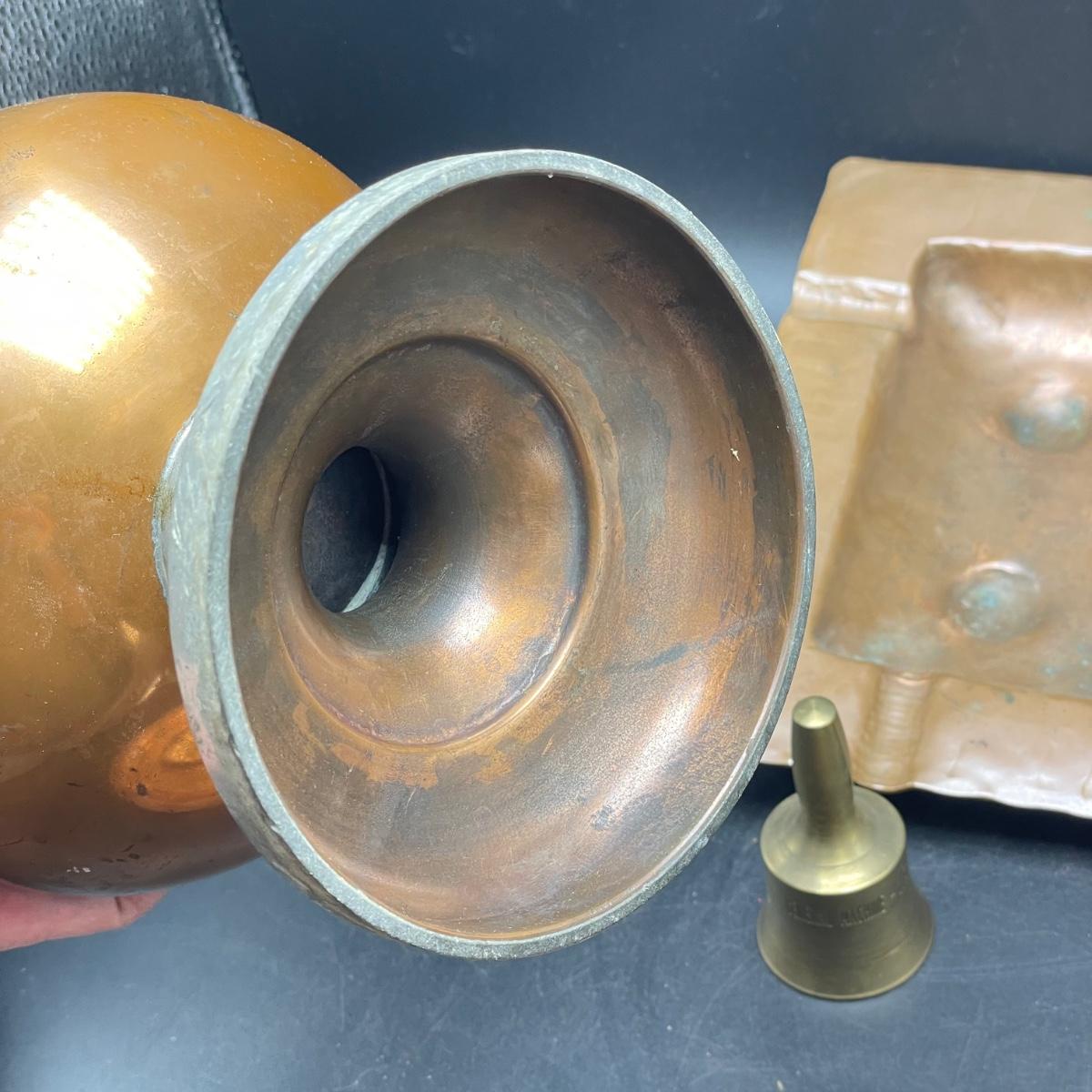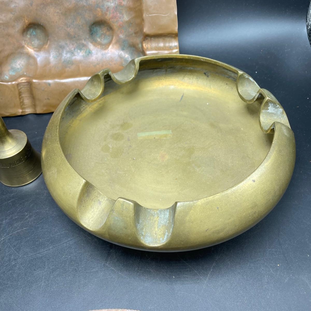 Six ashtrays, one small one, 3.5”d is marked Sterling. The largest copper ashtray is 9” x 9”. Lot also features a copper urn, an Italian map plate dates 1944-5 and a brass bell. See images. Shipping available.