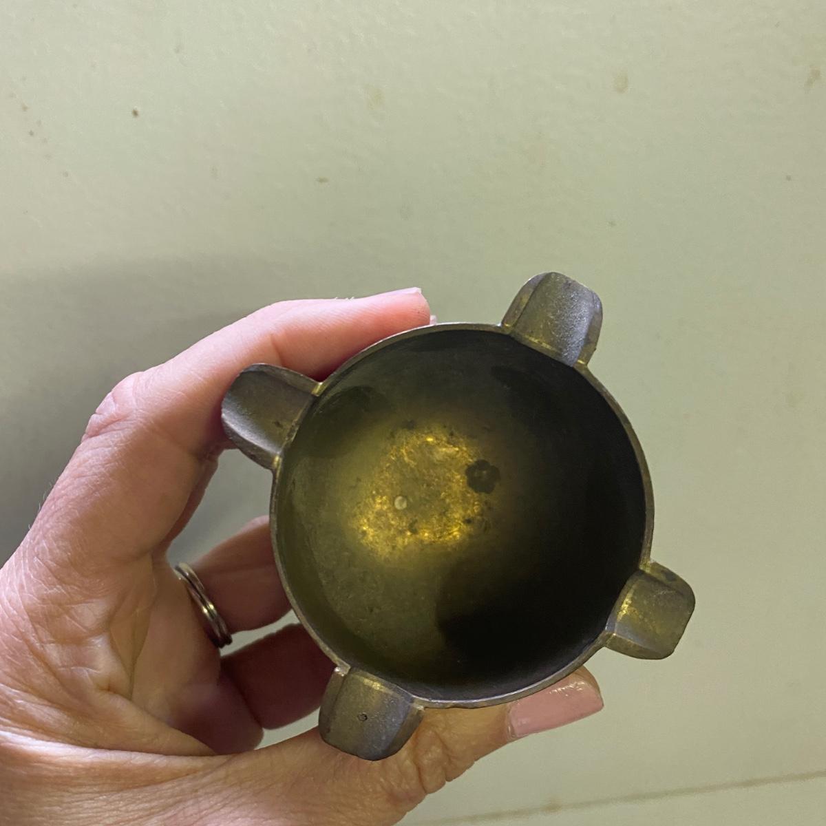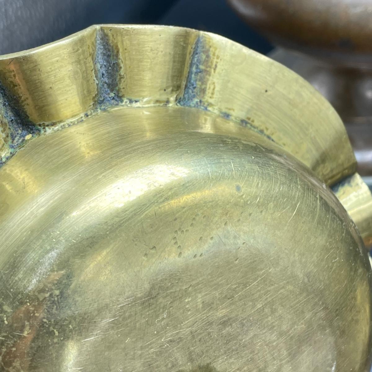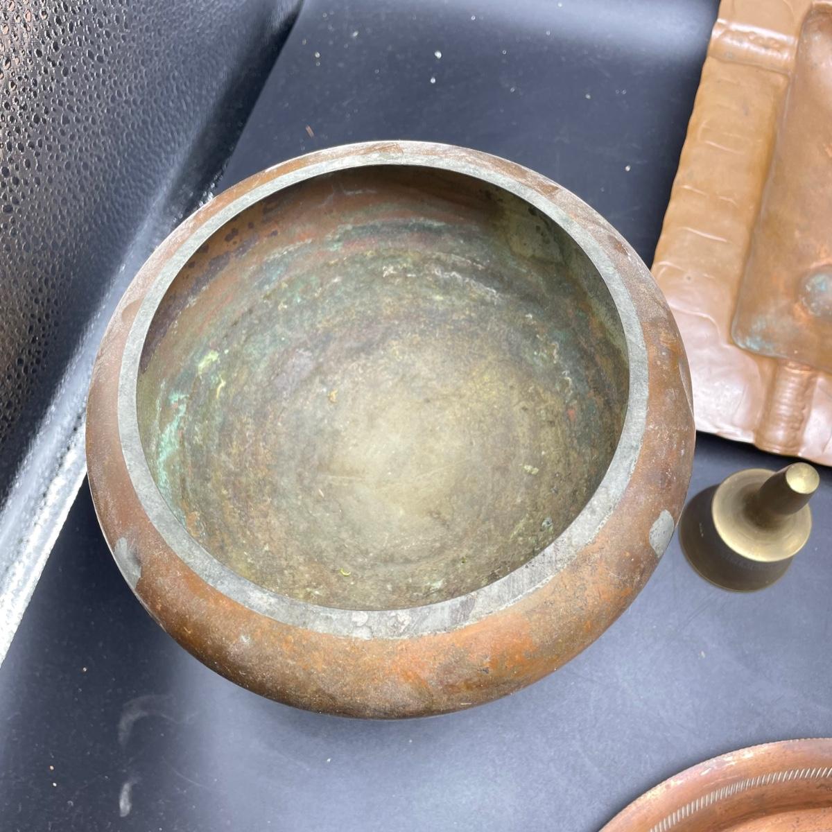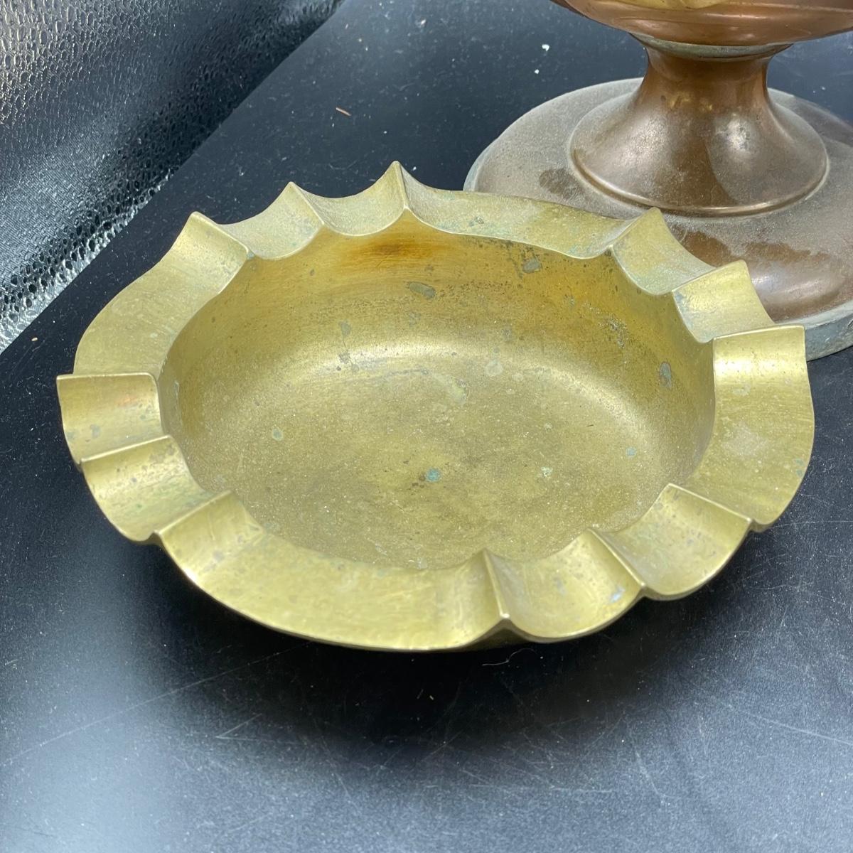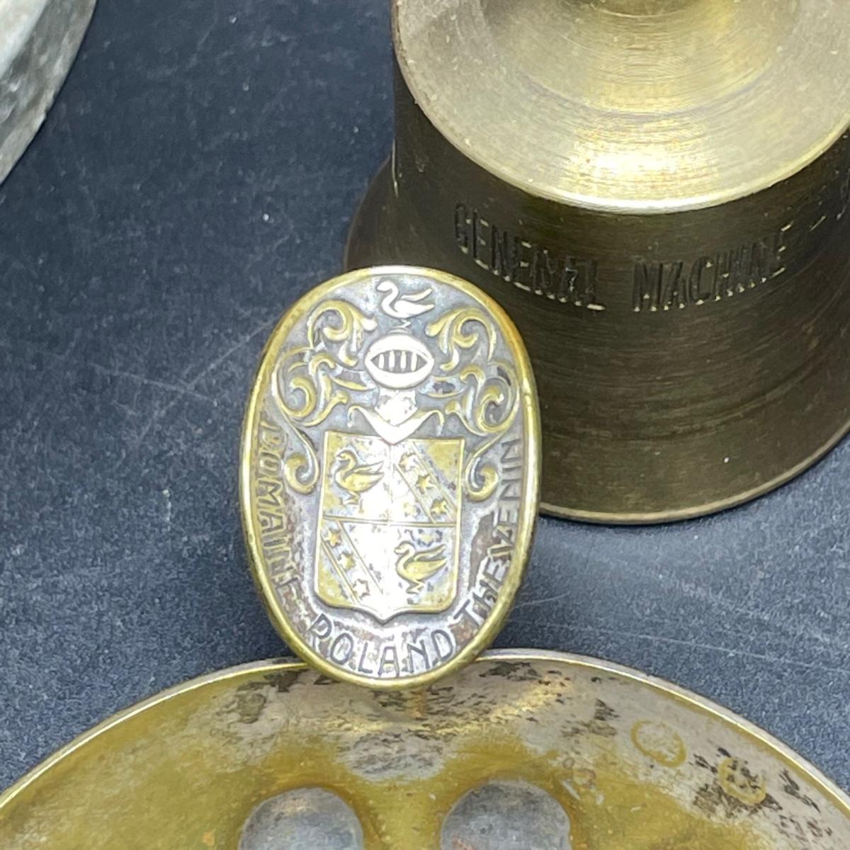 Six ashtrays, one small one, 3.5”d is marked Sterling. The largest copper ashtray is 9” x 9”. Lot also features a copper urn, an Italian map plate dates 1944-5 and a brass bell. See images. Shipping available.
