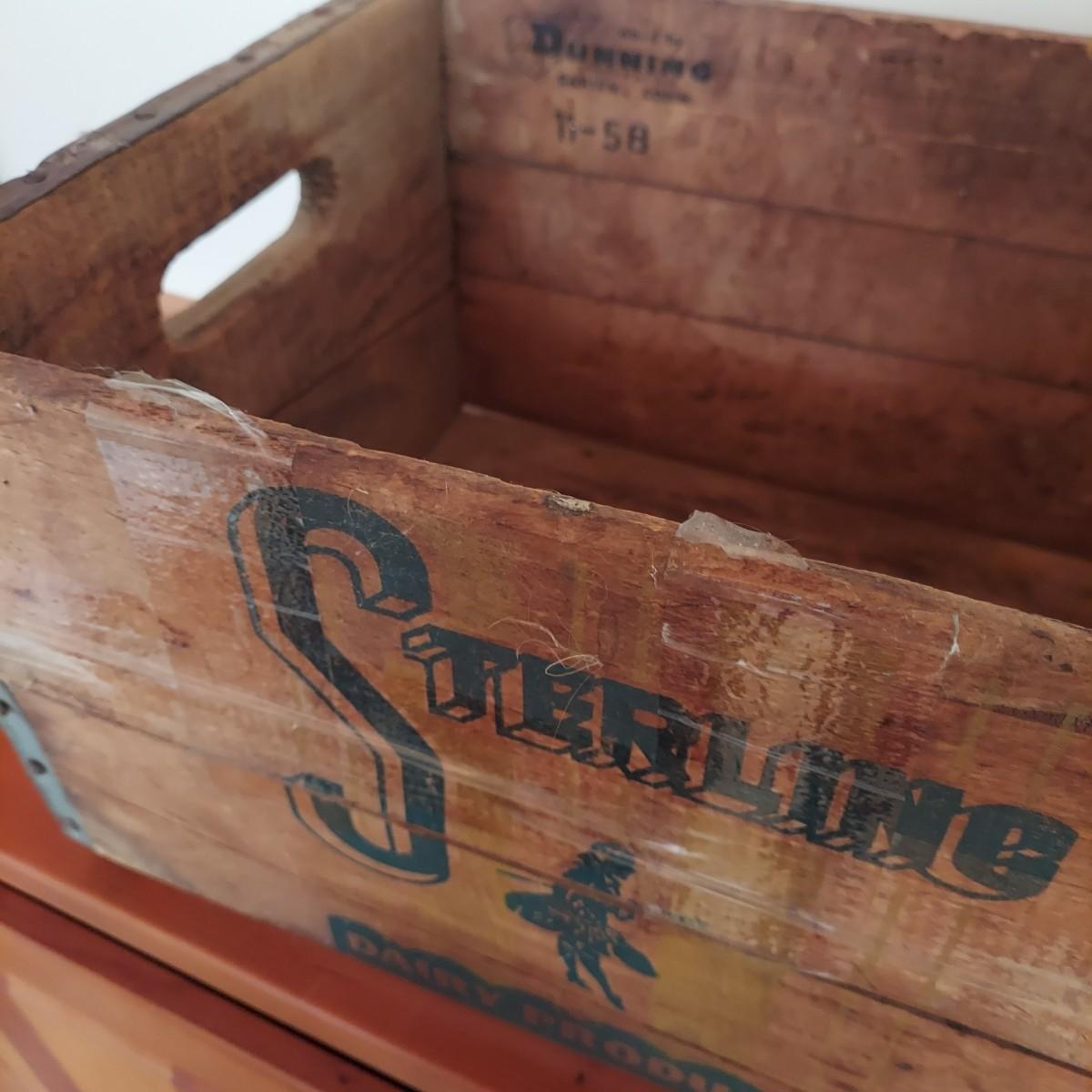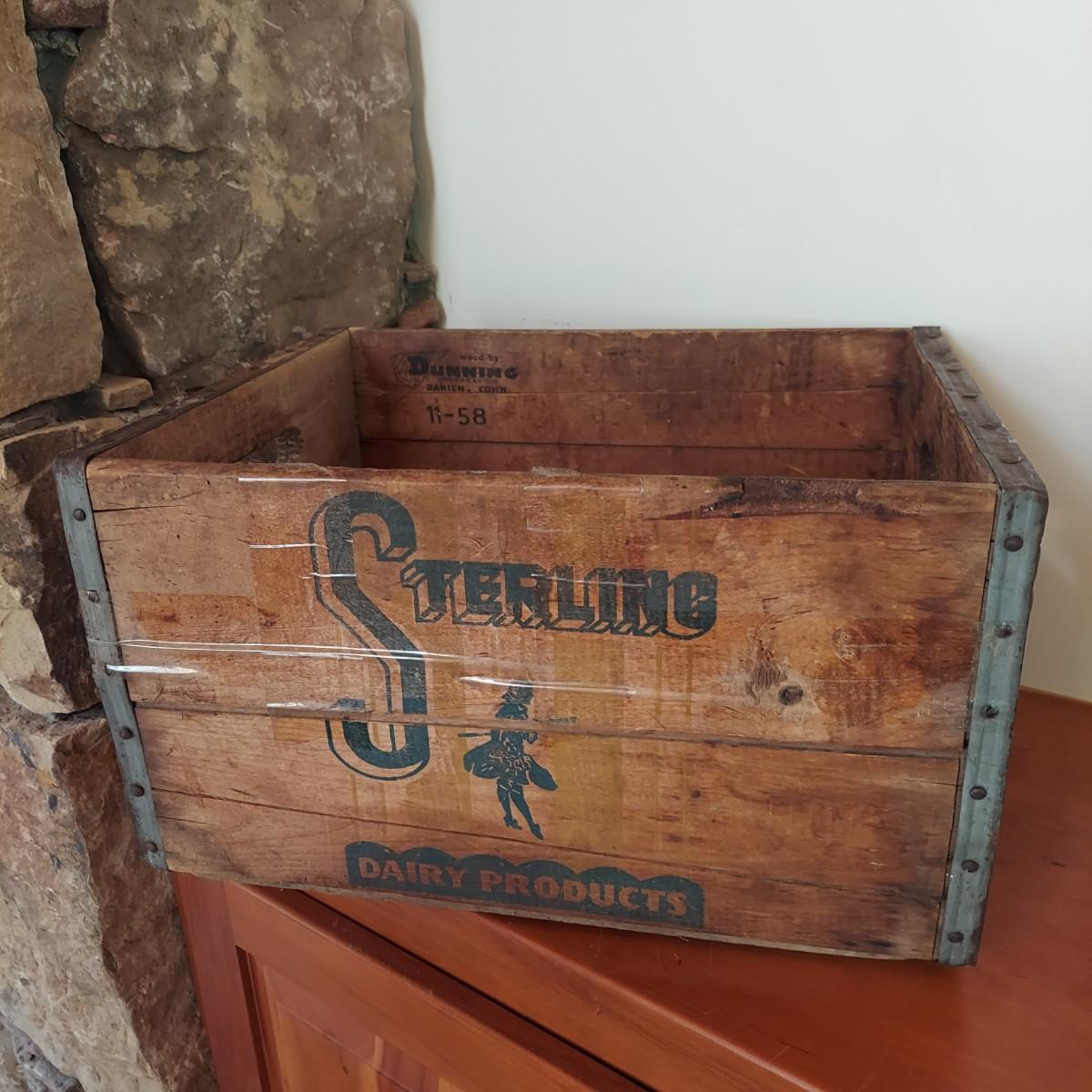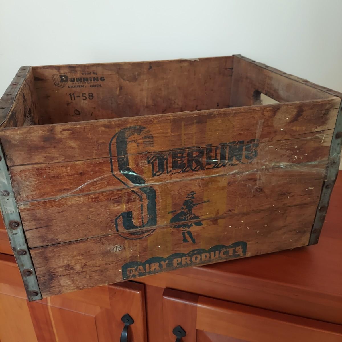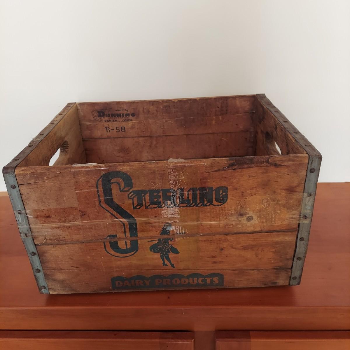 Wooden milk crate with metal banding. Marked Sterling Dairy Products. Measures approximately 16" x 12” x 10"H. Some clear packing tape stuck to it. Does not appear to be providing structural support. Please see photos for details. Shipping available