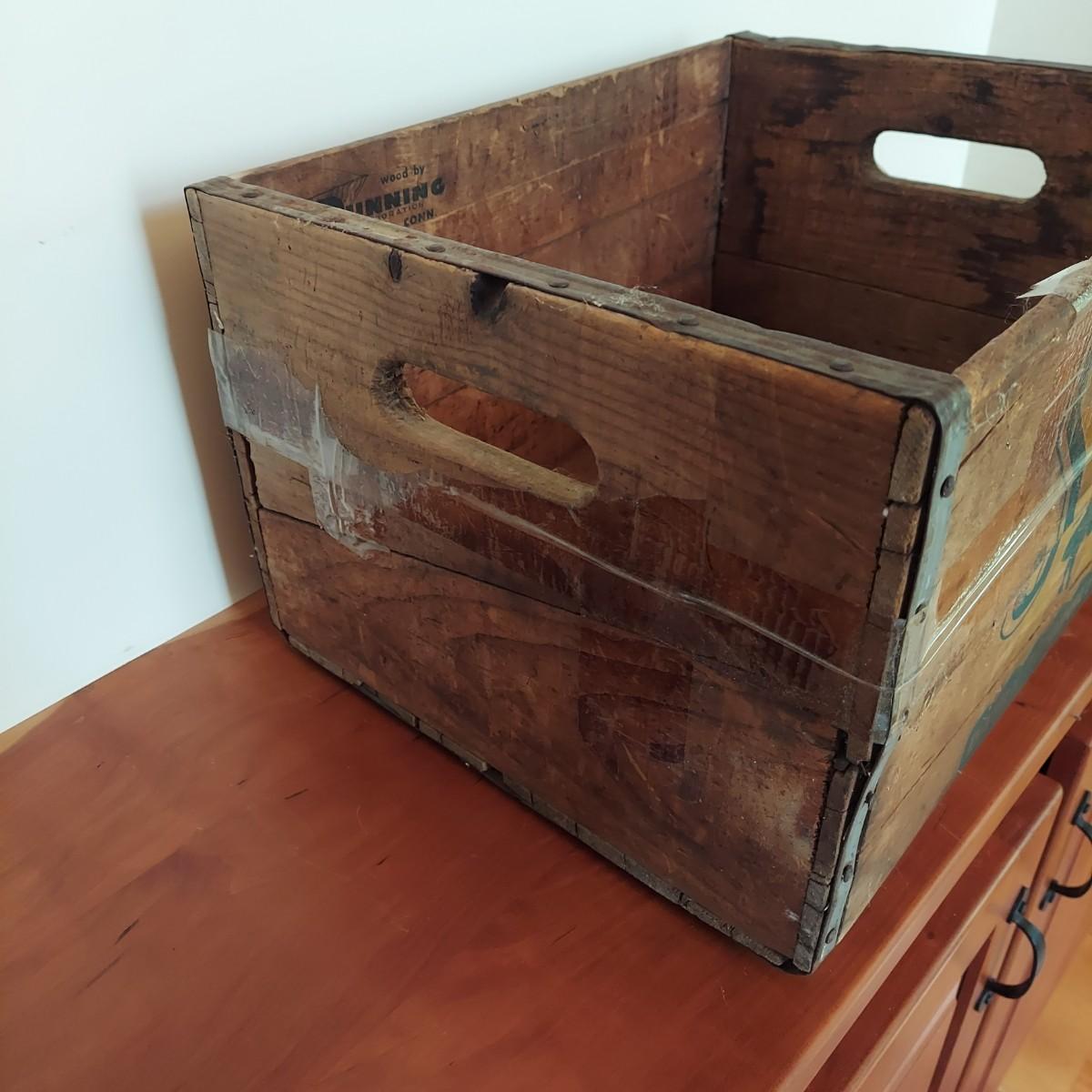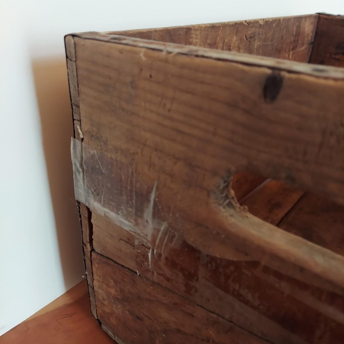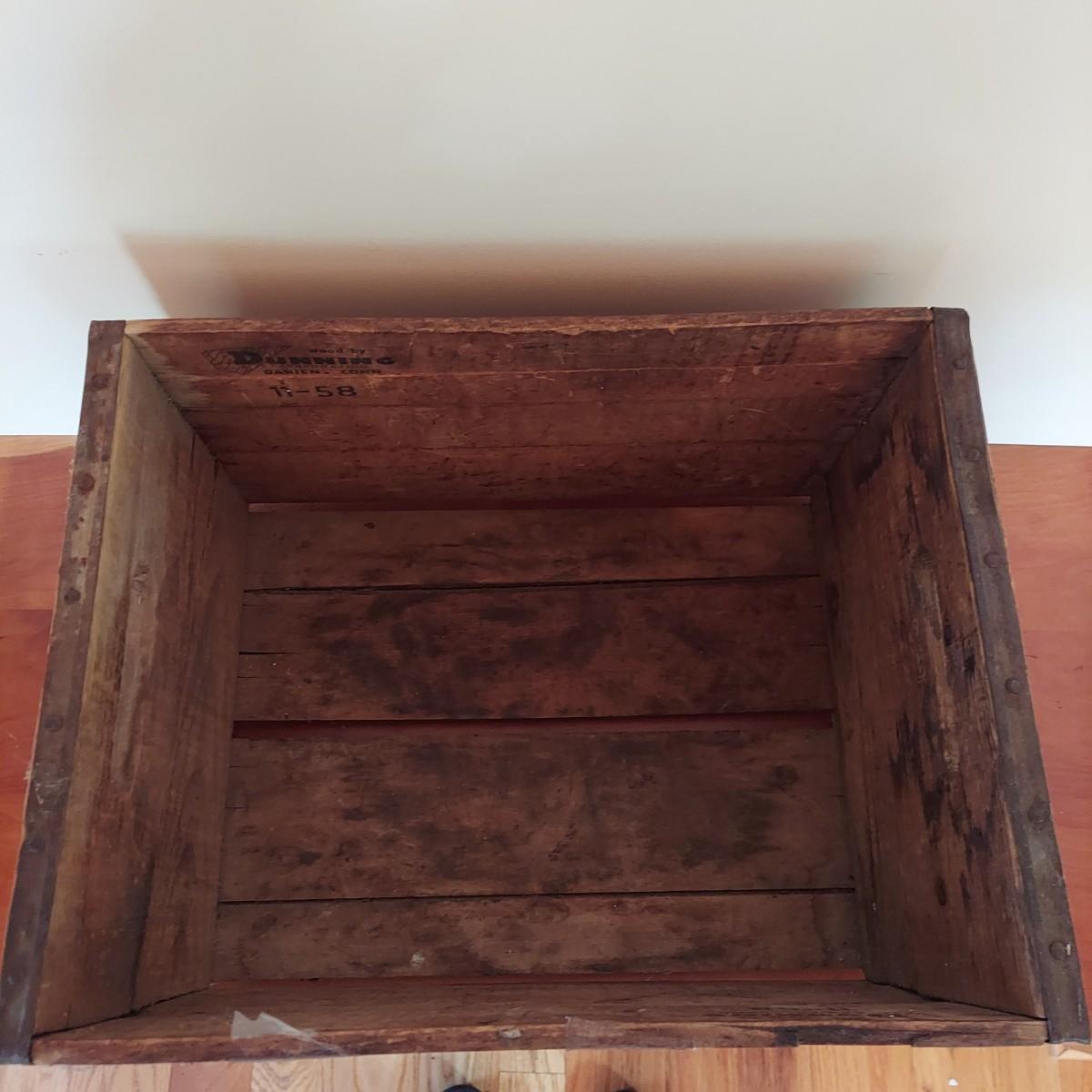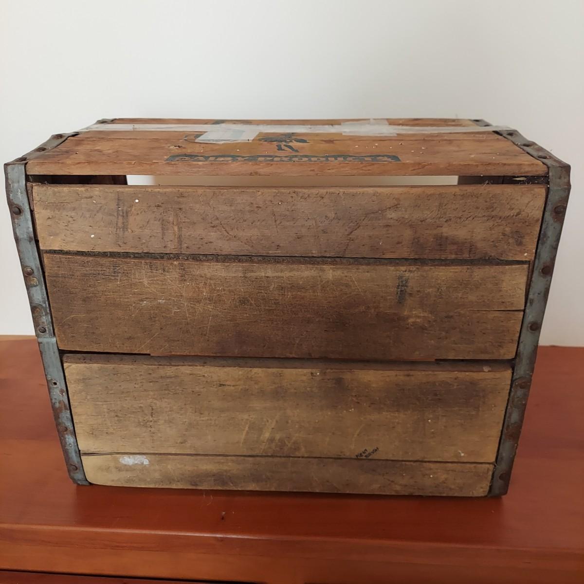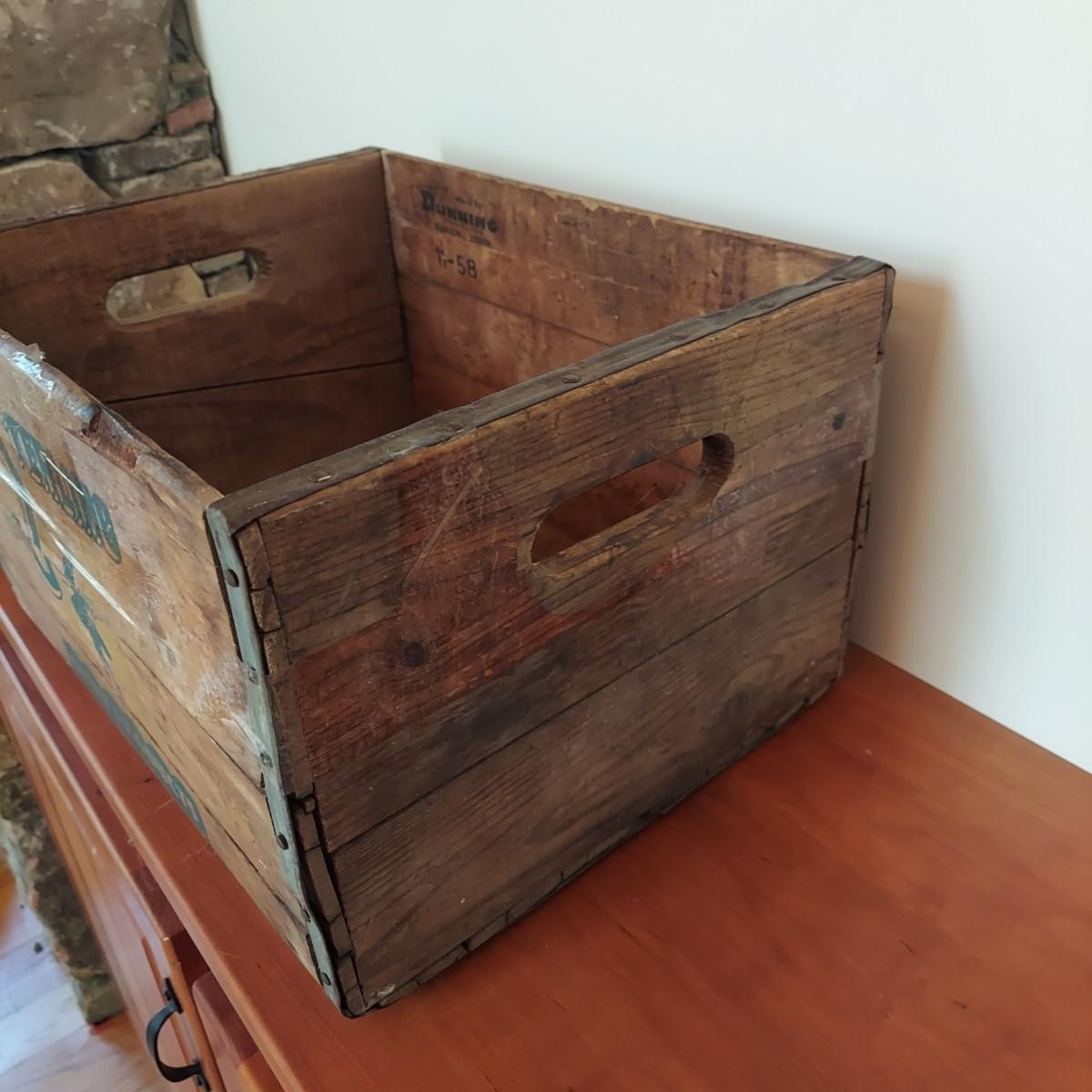 Wooden milk crate with metal banding. Marked Sterling Dairy Products. Measures approximately 16" x 12” x 10"H. Some clear packing tape stuck to it. Does not appear to be providing structural support. Please see photos for details. Shipping available