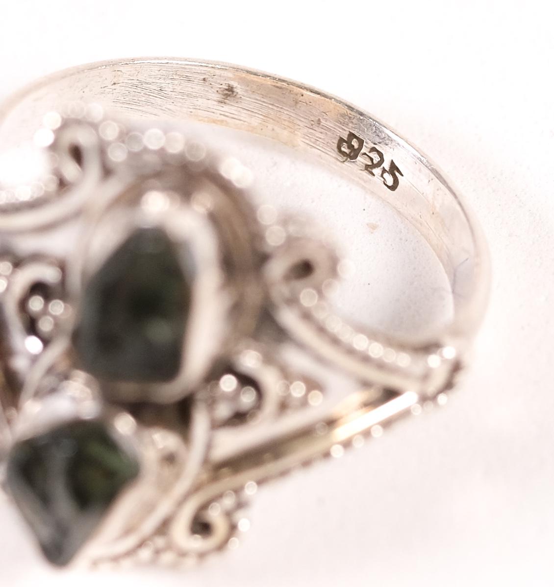 Sterling Double Moldavite Ring. Size 8.5. Stamped 925. Weighs approx. 3.8 grams.