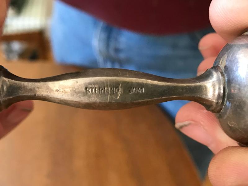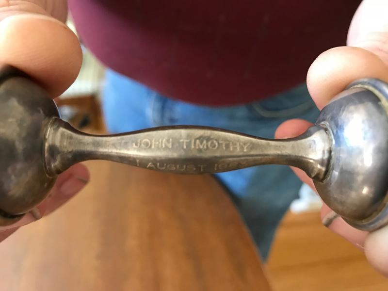 Very nice sterling baby rattle in a dumbbell form. Featuring conical ringed ends. Engraved "John Timothy 1 August 1963" and marked "Sterling Japan". 4 1/4" x 1 1/2" D