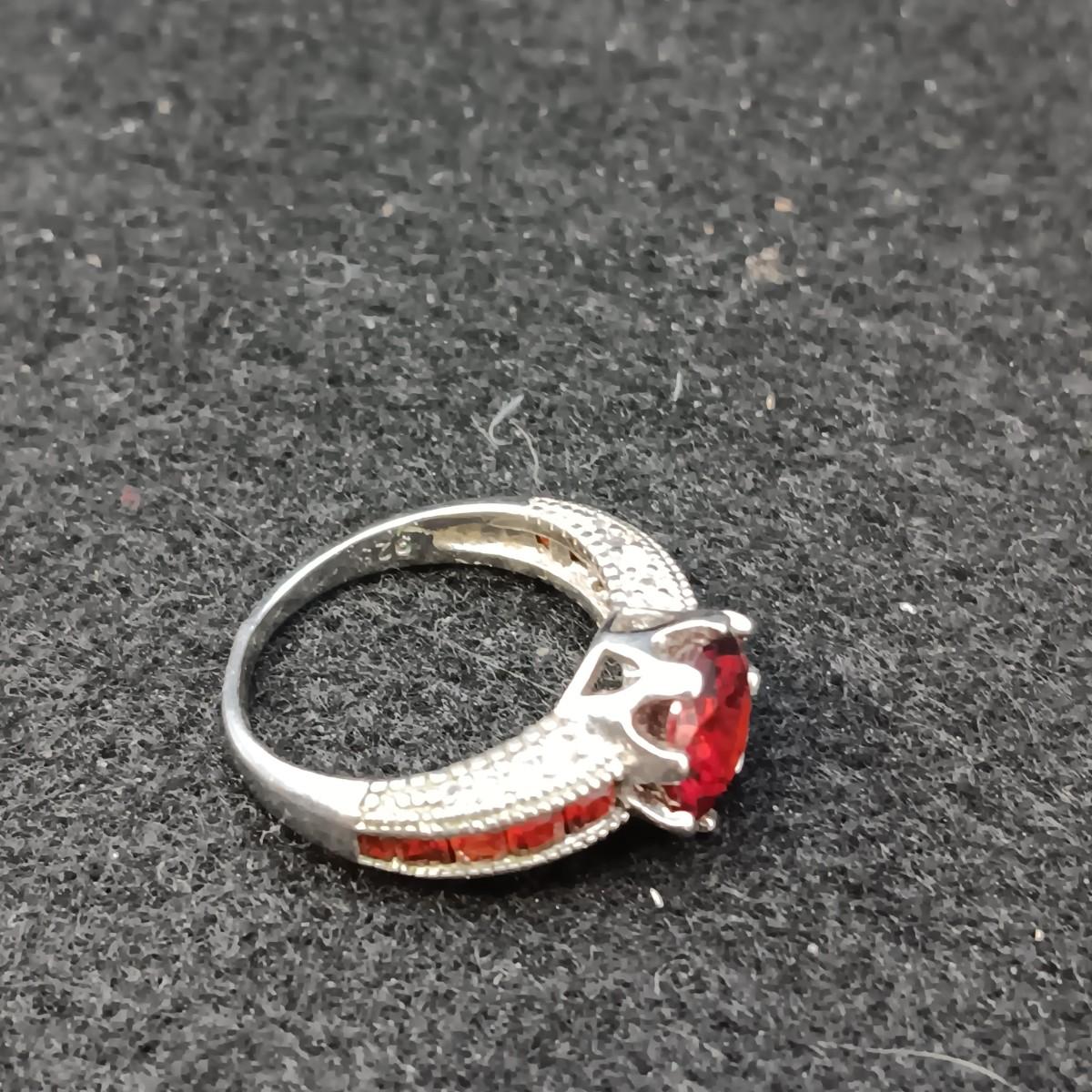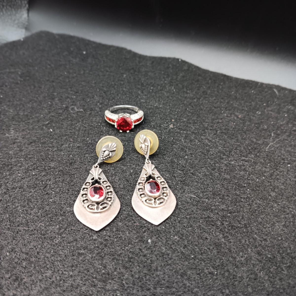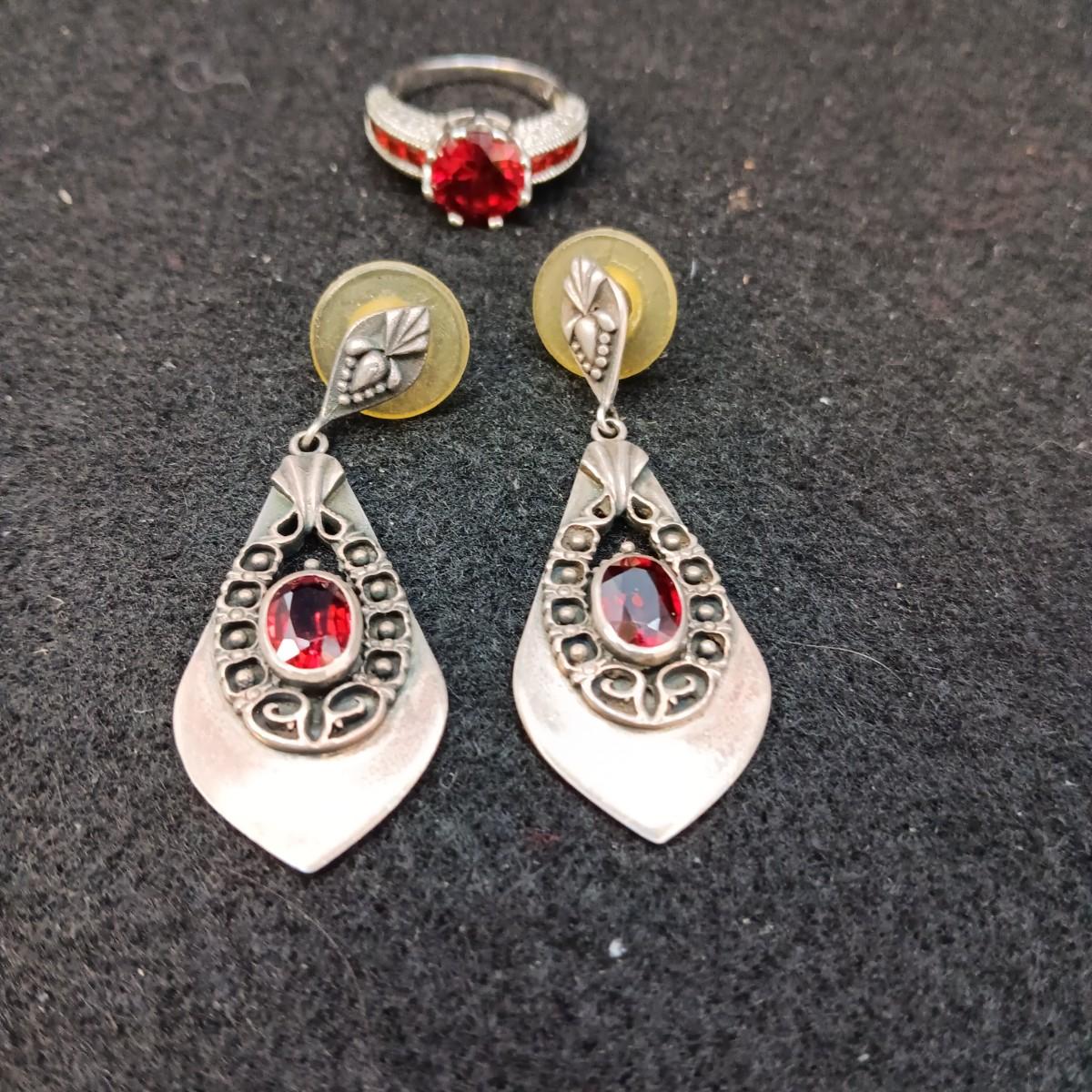STERLING EARRINGS AND RING (SIZE 6 1/2) WITH RED STONES
